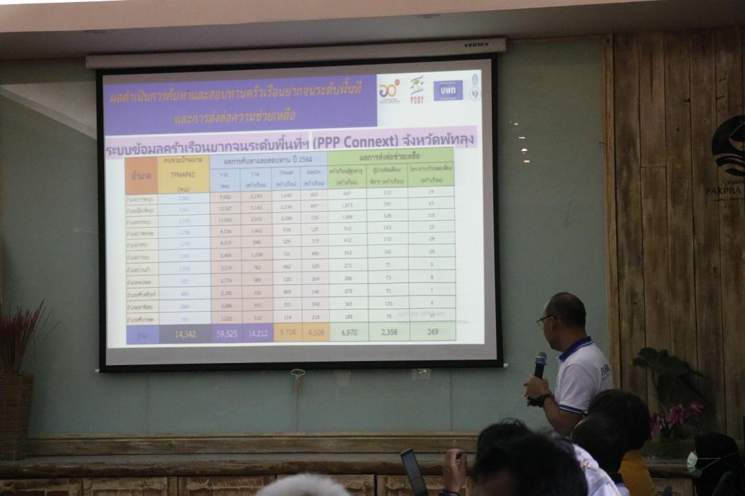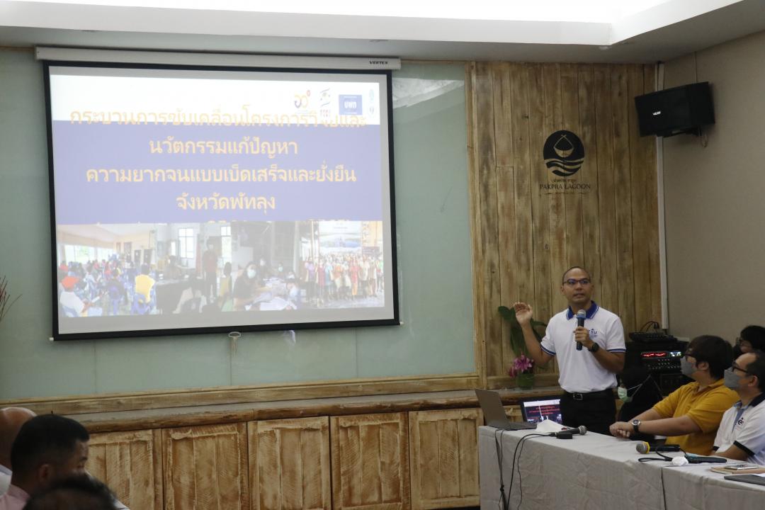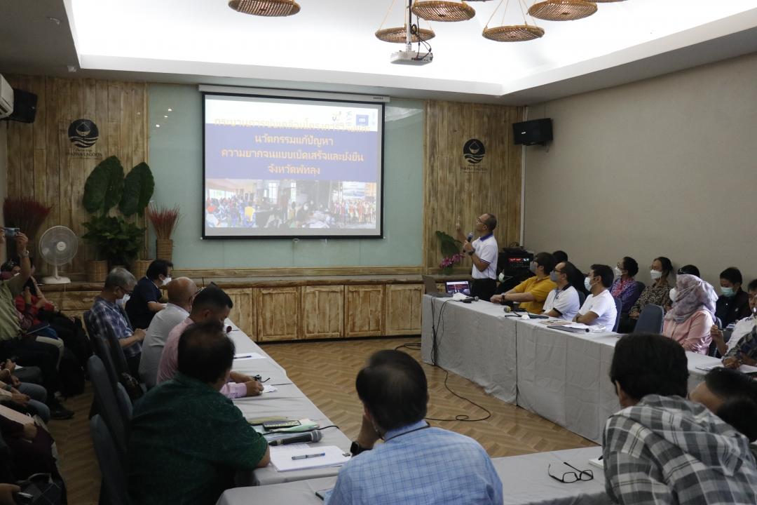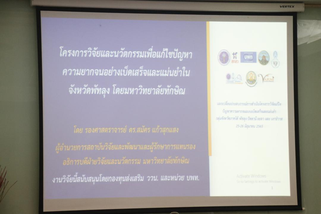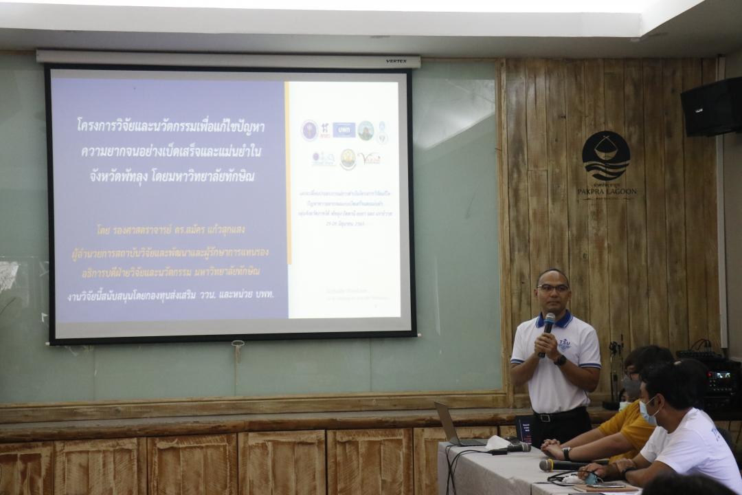 รศ.ดร.สมัคร แก้วสุกแสง รักษาการรองอธิการบดีฝ่ายวิจัยและนวัตกรรม มหาวิทยาลัยทักษิณ หัวหน้าโครงการวิจัยและนวัตกรรมเพื่อแก้ไขปัญหาความยากจน อย่างเบ็ดเสร็จและแม่นยำจังหวัดพัทลุง ได้ชี้แจงแนวทางการดำเนินโครงการวิจัยแก้ไขปัญหาความยากจนแบบเบ็ดเสร็จและแม่นยำ และกล่าวถึงวัตถุประสงค์การประชุมในครั้งนี้ว่า เพื่อสนับสนุนการพัฒนาระบบข้อมูลในการค้นหา สอบทานกลุ่มเป้าหมาย ครัวเรือนยากจนอย่างเบ็ดเสร็จและแม่นยำ โดยการมีส่วนร่วมของกลไก ภาคี ที่มีภารกิจ และบทบาทเกี่ยวข้องใน ระดับพื้นที่ โดยข้อมูลดังกล่าวจะได้รับการสนับสนุน และพัฒนาระบบส่งต่อการแก้ไขปัญหาความยากจน สู่ระบบสวัสดิการภาครัฐ รวมถึงการ พัฒนาโครงการตัวแบบการแก้ไขปัญหาความยากจนในระดับพื้นที่ (Pilot Project) โดยจะส่งเสริมการนำระบบโค้ช และระบบติดตามประเมินผลเพื่อสนับสนุนสถาบันวิชาการที่ดำเนินการในระดับพื้นที่ และสังเคราะห์ความรู้ จากการทำงานเชิงพื้นที่และพัฒนาข้อเสนอโครงการบริหารจัดการ ทั้งในระดับพื้นที่และระดับนโยบาย โดยมีพื้นที่ เป้าหมาย 10 จังหวัด ประกอบด้วย จังหวัดลำปาง พิษณุโลก พัทลุง ยะลา นราธิวาส นครราชสีมา บุรีรัมย์ อุบลราชธานี ร้อยเอ็ด และจังหวัดเลย