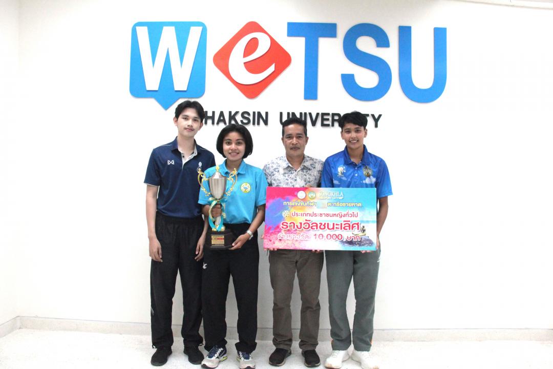 วันที่ 28 มิถุนายน 2565 ทีมชนะเลิศตะกร้อชายหาด รุ่นประชาชนหญิงทั่วไป การแข่งขัน ตะกร้อชายหาด "อบจ.สงขลา โอเพ่นคัพ ครั้งที่ 2" เข้าพบรายงานผลการแข่งขันและมอบถ้วยรางวัลชนะเลิศแก่มหาวิทยาลัยทักษิณ โดยมีผู้ช่วยศาสตราจารย์ ดร.พรไทย ศิริสาธิตกิจ รักษาการแทนรองอธิการบดี ฝ่ายกิจการนิสิตและพันธกิจสัมพันธ์ พร้อมด้วยอาจารย์ ดร. นำโชค บัวดวง รักษาการแทนผู้ช่วยอธิการบดี ฝ่ายกิจการนิสิตและพันธกิจสัมพันธ์ รับทราบรายงานผลการแข่งขัน และรับมอบถ้วยรางวัล พร้อมร่วมแสดงความยินดีและให้แนวทางการพัฒนาเพื่อต่อยอดการสนับสนุนนักกีฬาของมหาวิทยาลัยสำหรับการเดินทางเข้าร่วมการแข่งขันกีฬาประเภทต่างๆ ในอนาคต