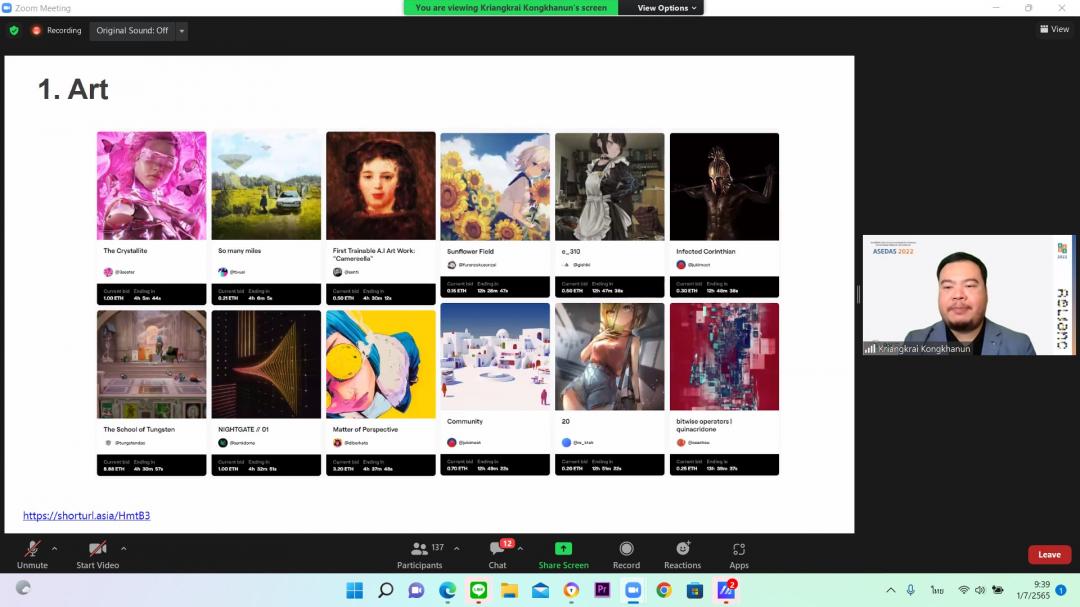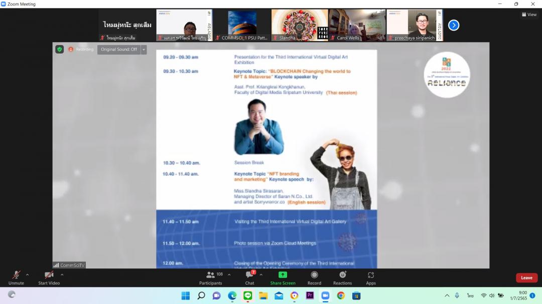 การจัดงานนิทรรศการศิลปะดิจิทัลออนไลน์ระดับนานาชาติ ในครั้งนี้ ได้รับเกียรติจาก ผู้ช่วยศาสตราจารย์เกรียงไกร กงกะนันท์ คณะดิจิทัลมีเดีย มหาวิทยาลัยศรีปทุม ปาฐกถาพิเศษ หัวข้อ "เทคโนโลยีเปลี่ยนโลก จาก BLOCKCHAIN สู่ NFT & Metaverse" โดย และการปาฐกถาพิเศษ หัวข้อ “NFT branding and marketing โดย คุณสลันดา สิระสราญ กรรมการผู้จัดการ บริษัท สราญ เอ็น.โค จํากัด และศิลปิน Sorrywreror.co กิจกรรมเมื่อวันศุกร์ที่ 1 กรกฎาคม 2565 ที่ผ่านมา