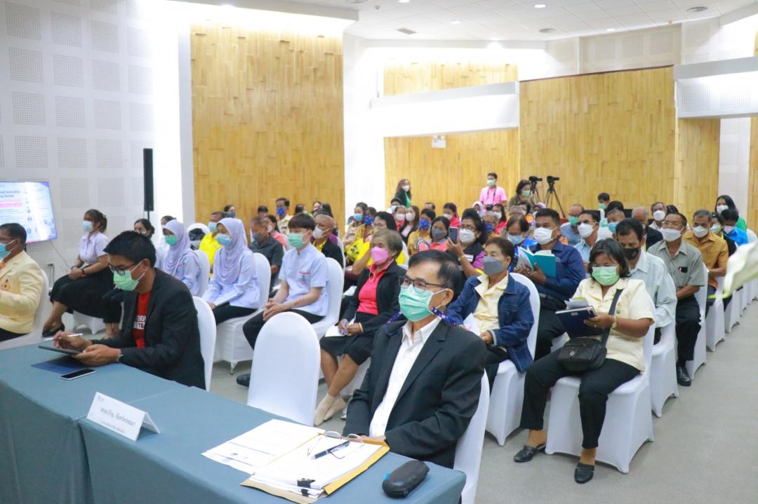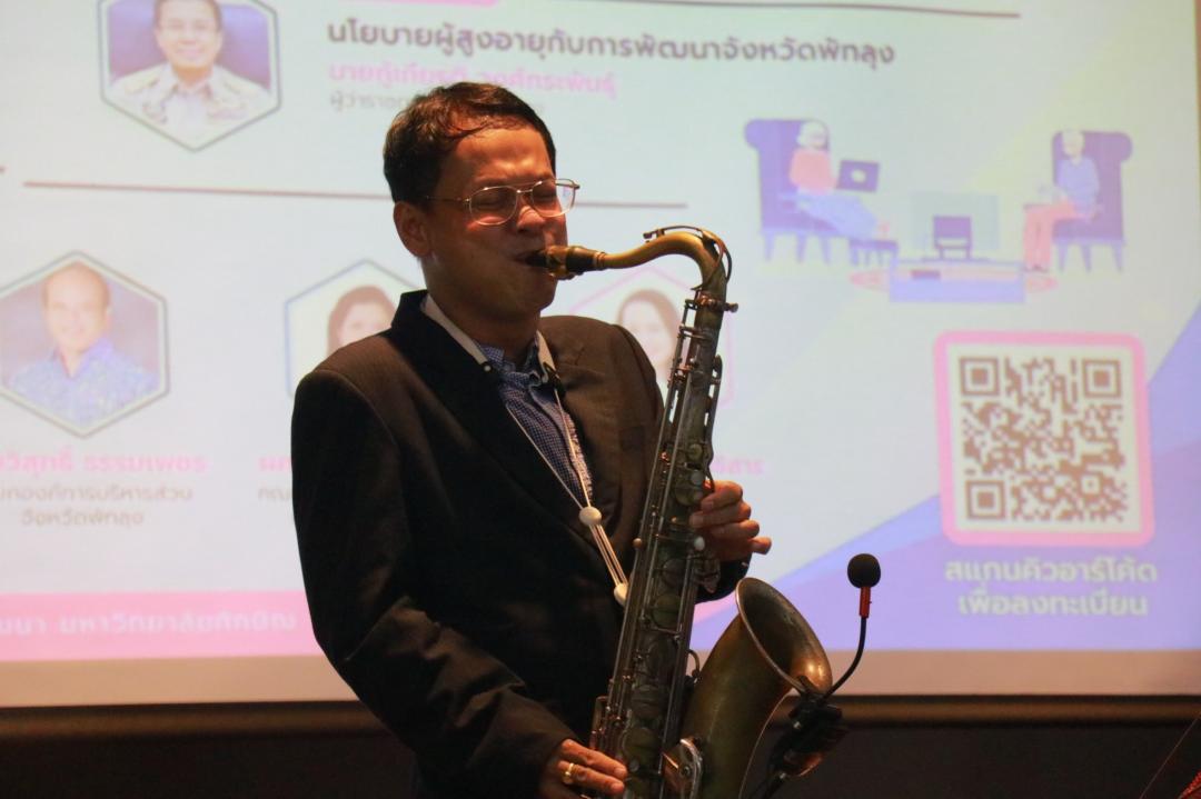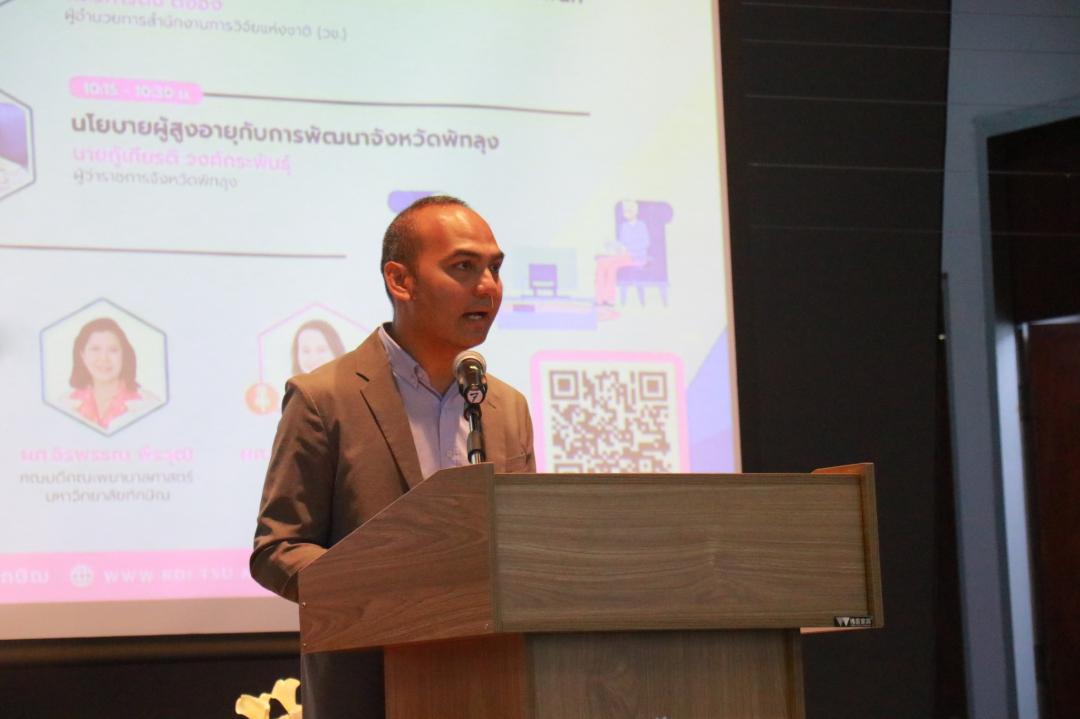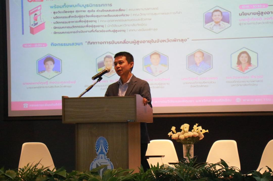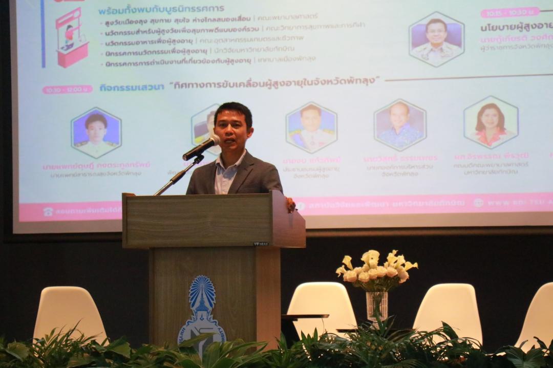 การเสวนา “ทิศทางการขับเคลื่อนผู้สูงอายุในจังหวัดพัทลุง” โดยมีผู้ร่วมเสวนา ประกอบด้วย นายแพทย์ดุษฎี คงตระกูลทรัพย์ | นายแพทย์สาธารณสุขจังหวัดพัทลุง นายอำพร ณ นิโรจน์ | พัฒนาสังคมและความมั่นคงของมนุษย์จังหวัดพัทลุง นายจบ แก้วทิพย์ ประธานชมรมผู้สูงอายุจังหวัดพัทลุง นายวิสุทธิ์ ธรรมเพชร นายกองค์การบริหารส่วนจังหวัดพัทลุง ผู้ช่วยศาสตราจารย์จิรพรรณ พีรวุฒิ คณบดีคณะพยาบาลศาสตร์ มหาวิทยาลัยทักษิณ ผู้ดำเนินรายการ ผู้ช่วยศาสตราจารย์ ดร.สิรยา สิทธิสาร รองผู้อำนวยการสถาบันวิจัยและพัฒนา