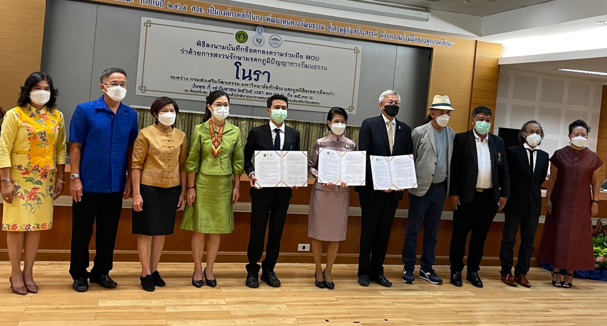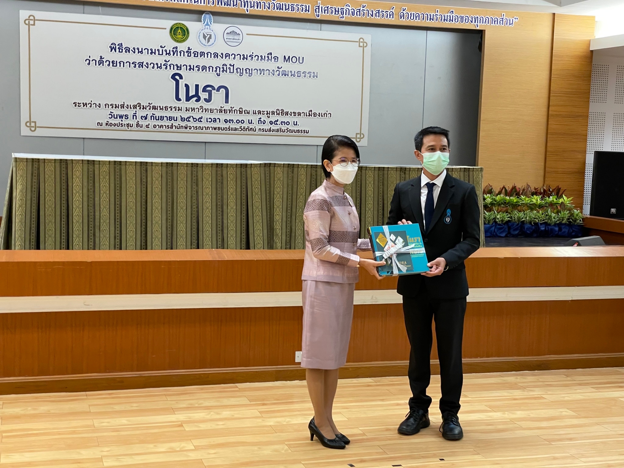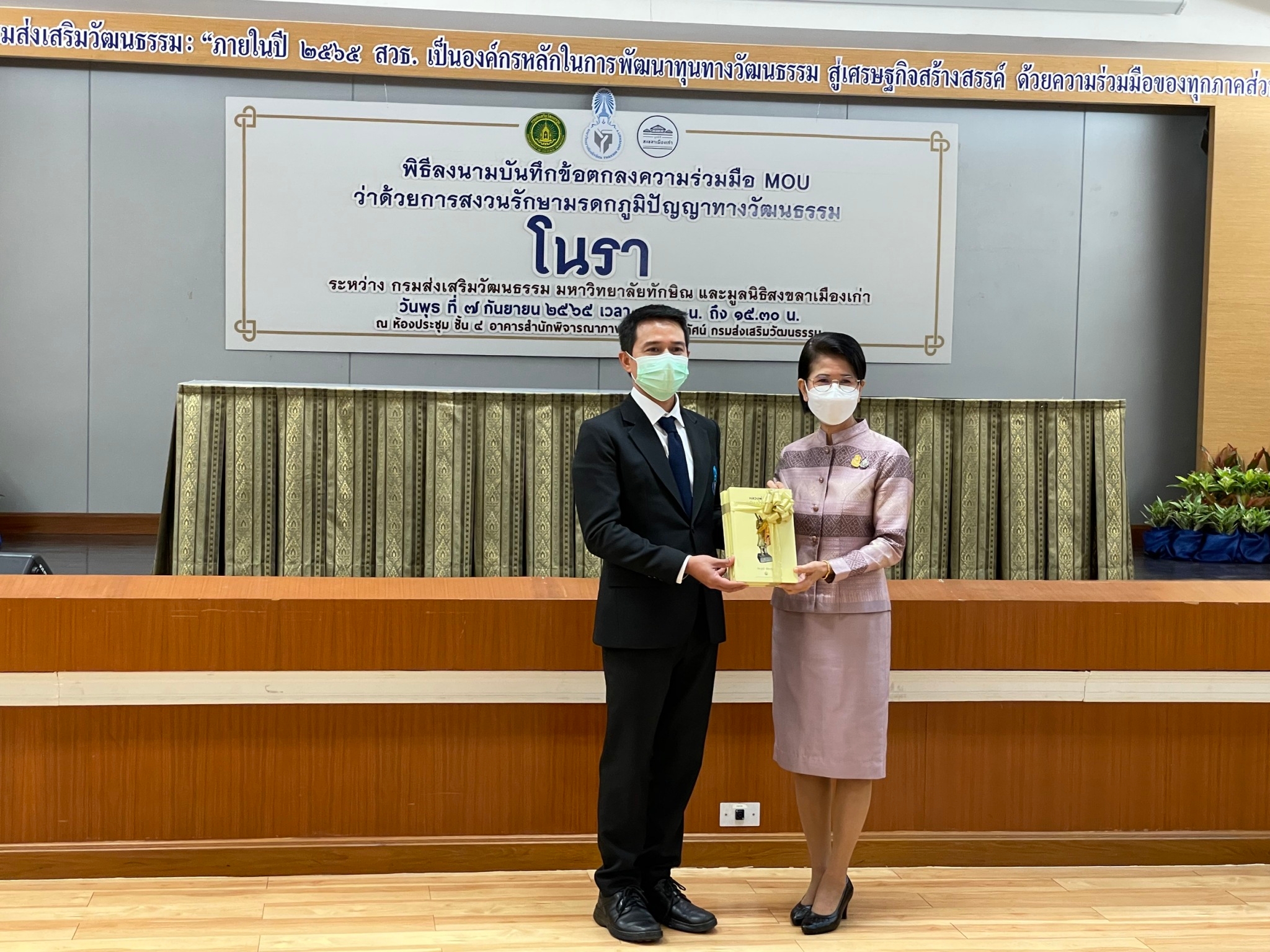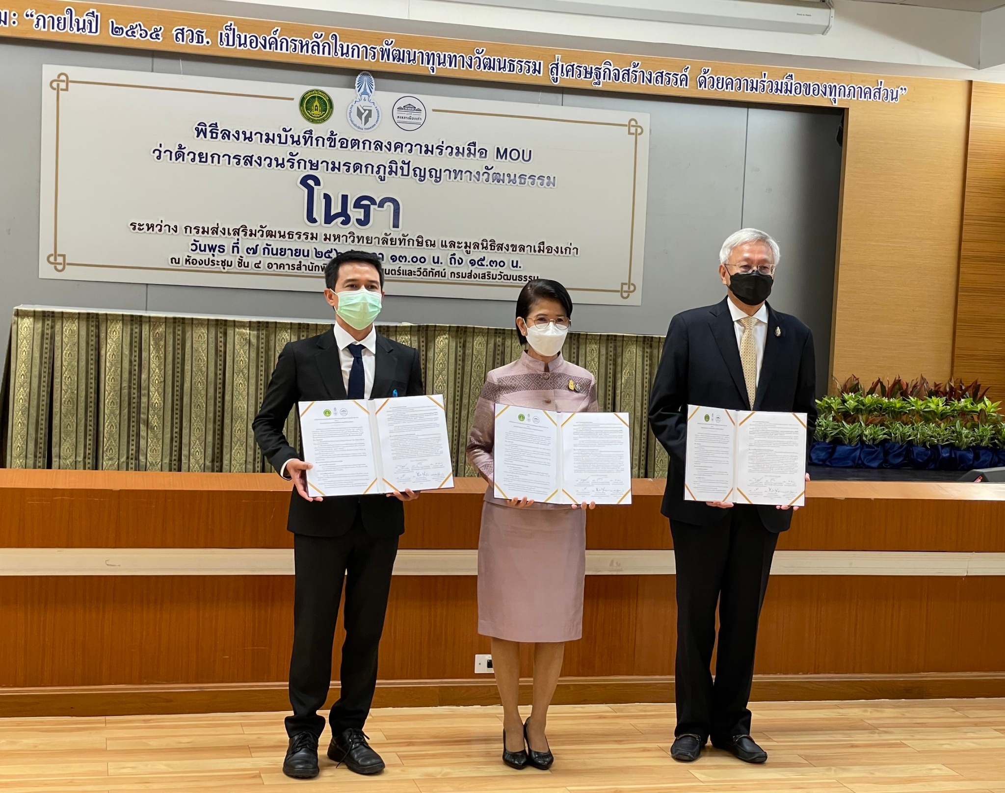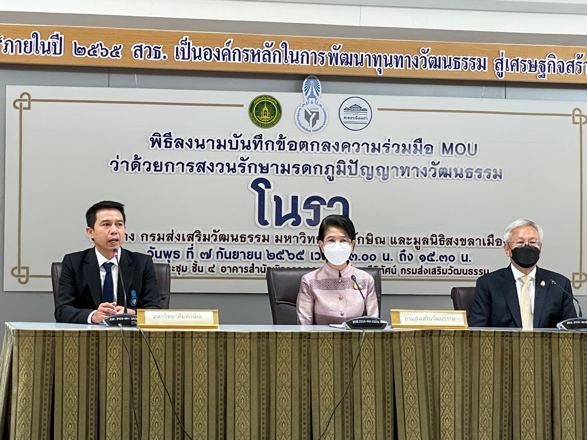 วันที่ 7 กันยายน 2565 รศ.ดร.ณฐพงศ์ จิตรนิรัตน์ รักษาการอธิการบดีมหาวิทยาลัยทักษิณ ร่วมพิธีลงนามบันทึกข้อตกลงความร่วมมือ MOU ว่าด้วยการสงวนรักษามรดกภูมิปัญญาทางวัฒนธรรม “โนรา” ระหว่าง กรมส่งเสริมวัฒนธรรมและมูลนิธิสงขลาเมืองเก่า เพื่อการขับเคลื่อนศิลปวัฒนธรรมสู่เศรษฐกิจสร้างสรรค์ ย่านเมืองเก่าสงขลา ณ ห้องประชุม ชั้น 4 อาคารสำนักงานพิจารณาภาพยนตร์และวีดิทัศน์ กรมส่งเสริมวัฒนธรรม