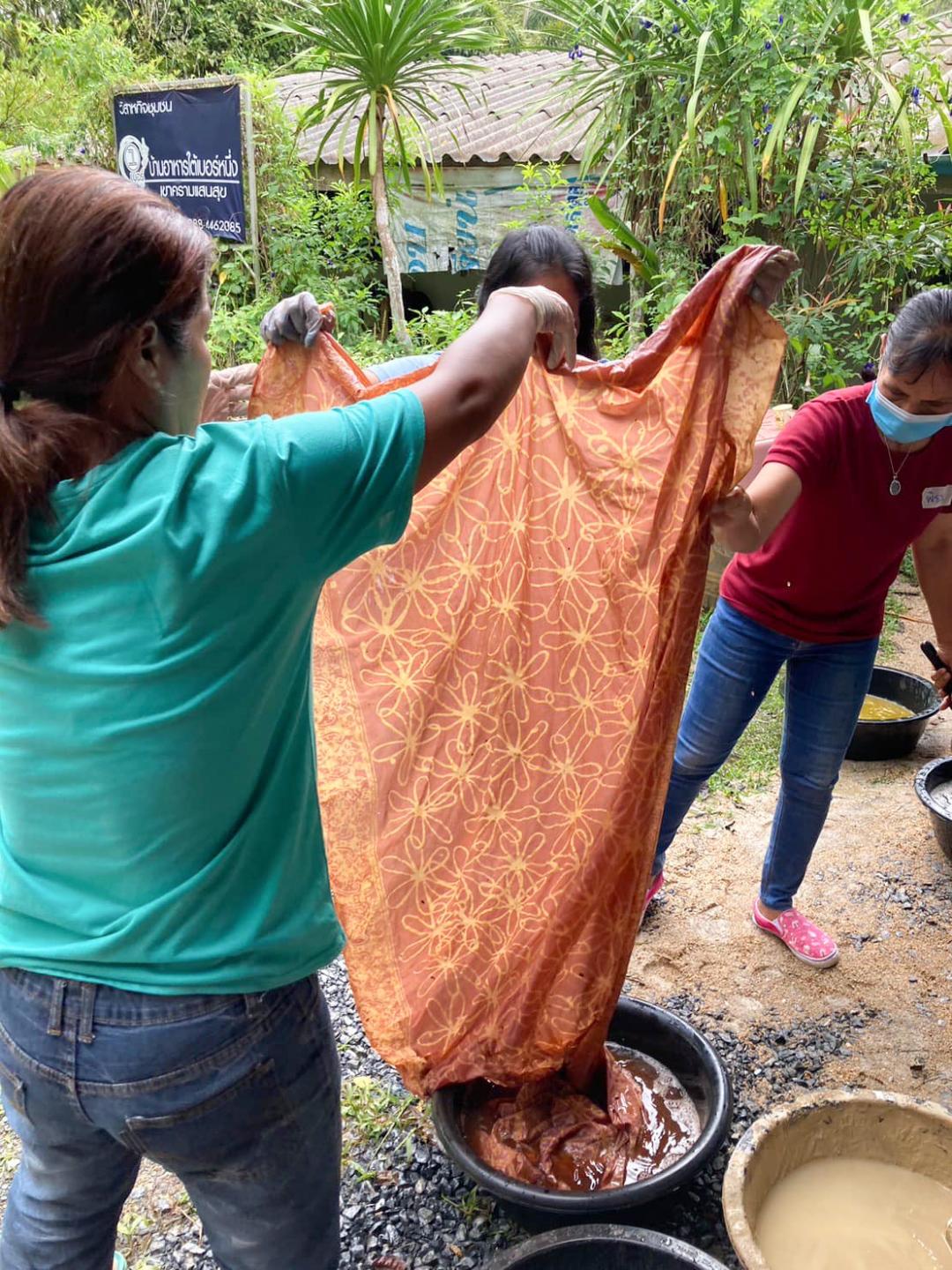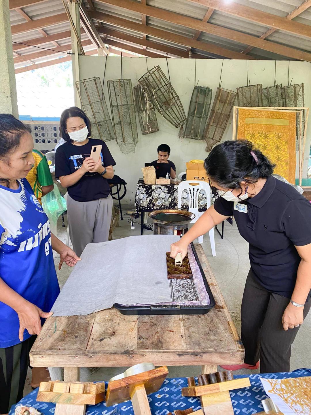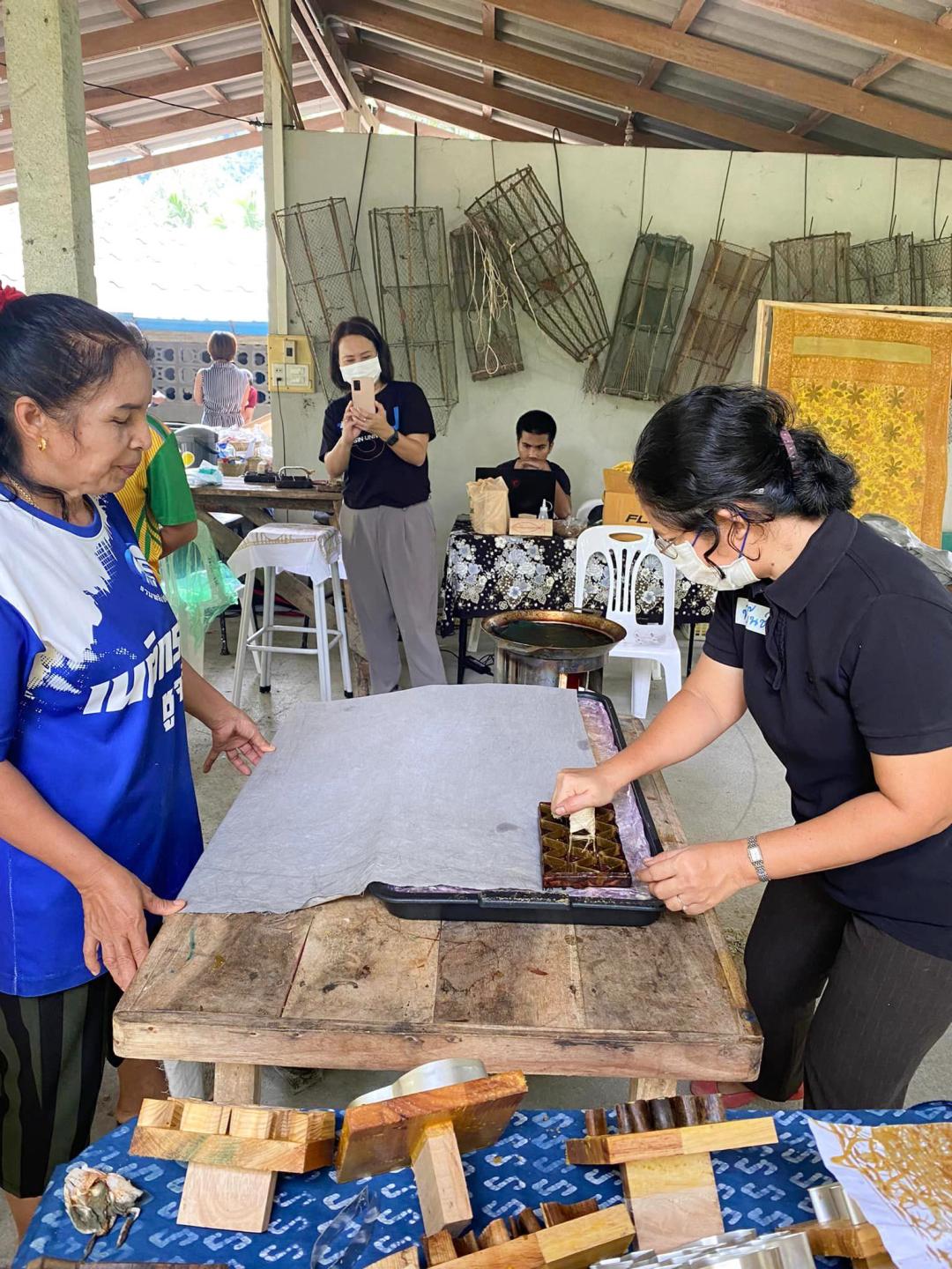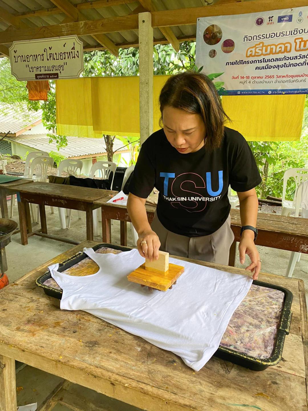 ระหว่างวันที่ 14-18 ตุลาคม 2565 คณะทำงานภายใต้ชุดโครงการการวิจัยและนวัตกรรมเพื่อแก้ไขปัญหาความยากจนแบบเบ็ดเสร็จและแม่นยำในจังหวัดพัทลุง ปีที่ 2 โดย อาจารย์ ดร.ทิพย์ทิวา สัมพันธมิตร รักษาการแทนผู้ช่วยอธิการบดีฝ่ายวิจัยและนวัตกรรม มหาวิทยาลัยทักษิณ ได้จัดกิจกรรมอบรมเชิงปฏิบัติการ “ศรีนาคาโมเดล” ณ วิสาหกิจชุมชนบ้านอาหารใต้เบอร์หนึ่ง หมู่ที่ 4 ตำบลบ้านนา อำเภอศรีนครินทร์ จังหวัดพัทลุง และเมื่อวันที่ 17 ตุลาคม 2565 ได้จัดกิจกรรมซึ่งดำเนินงานโดย คณะทีมนักวิจัยโครงการ “โมเดลแก้จนสวัสดิการชุมชนเกื้อกูล : คนเมืองลุงไม่ทอดทิ้งกัน” โดยให้กลุ่มคนเป้าหมายในพื้นที่ได้มีโอกาสพัฒนาทักษะและสร้างกระบวนการเรียนด้านการทำผ้ามัดย้อมและผ้าพิมพ์ลายด้วยสีจากวัสดุธรรมชาติเพื่อเพิ่มทุนทางด้านเศรษฐกิจและสังคม โดยการทำงานแบบ Joint Venture ระดับจังหวัดและพื้นที่ทั้งสำนักงานพัฒนาชุมชน เทศบาลตำบลบ้านนา มหาวิทยาลัยทักษิณ กองทุนสวัสดิการชุมชนตำบลบ้านนาวิสาหกิจชุมชนในพื้นที่ และเครือข่ายการท่องเที่ยว ทั้งนี้หลายภาคีเครือข่ายร่วมผนึกกำลังอย่างมีส่วนร่วมในการขับเคลื่อนที่เน้นการสร้างโอกาสคน สร้างกลุ่ม สร้างพลัง สำหรับกิจกรรมที่จัดขึ้นเป็นการลงมือพิมพ์ลายผ้าแบบทับซ้อนและการแต่งแต้มสีบนลายผ้า เพื่อให้ได้ผลงานผ้าพิมพ์ลายแบบใหม่ ๆ