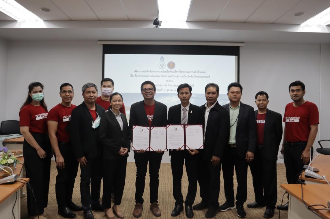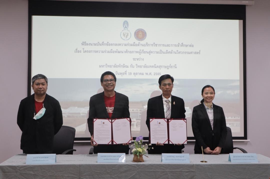 คณะวิศวกรรมศาสตร์ มหาวิทยาลัยทักษิณ โดย รองศาสตราจารย์ ดร.จตุพร แก้วอ่อน คณบดีคณะวิศวกรรมศาสตร์ ร่วมมือกับ วิทยาลัยเทคนิคสุราษฎร์ธานี โดย นายสิรวิชญ์ ธนเศรษฐ์วงศ์ ผู้อำนวยการวิทยาลัยเทคนิคสุราษฎร์ธานี ลงนามบันทึกข้อตกลงความร่วมมือด้านบริการวิชาการและการเข้าศึกษาต่อ โดยมีวัตถุประสงค์ เพื่อพัฒนาและเสริมสร้างคุณภาพการศึกษาด้านวิศวกรรมศาสตร์ พัฒนากำลังคนด้านวิศวกรรมศาสตร์ และเพื่อสร้างความสัมพันธ์และเครือข่ายความร่วมมือระหว่างสองหน่วยงานในการทำงานด้านการศึกษาให้เกิดความเข้มแข็งต่อไป