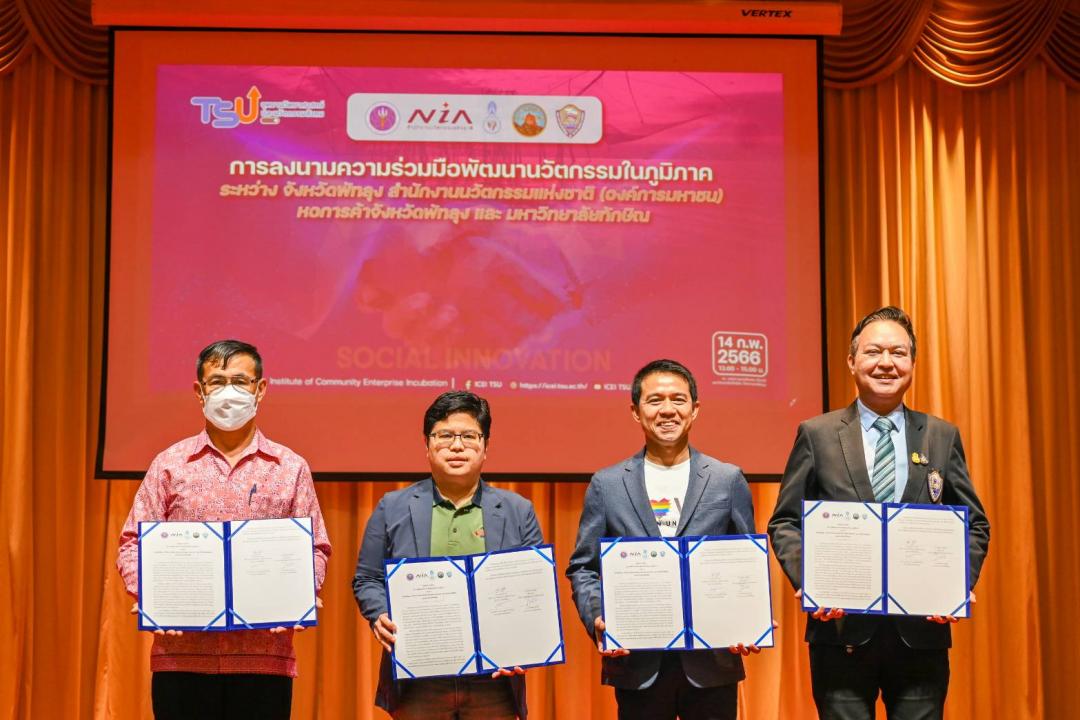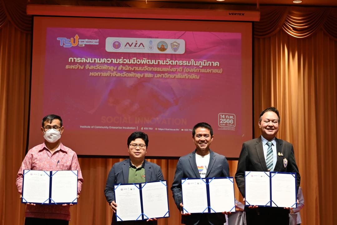 วันที่ 14 กุมภาพันธ์ 2566 สํานักบ่มเพาะวิชาการเพื่อวิสาหกิจในชุมชน จัดพิธีการลงนามความร่วมมือพัฒนานวัตกรรมในภูมิภาค ระหว่างสำนักงานนวัตกรรมแห่งชาติ (องค์การมหาชน) มหาวิทยาลัยทักษิณ หอการค้าจังหวัดพัทลุง และจังหวัดพัทลุง และเปิดตัว “หน่วยขับเคลื่อนนวัตกรรมเพื่อสังคมประจำพื้นที่ภาคใต้” ประจำปีงบประมาณ พ.ศ. 2566 ณ หอประชุมเฉลิมพระเกียรติ มหาวิทยาลัยทักษิณ วิทยาเขตพัทลุง