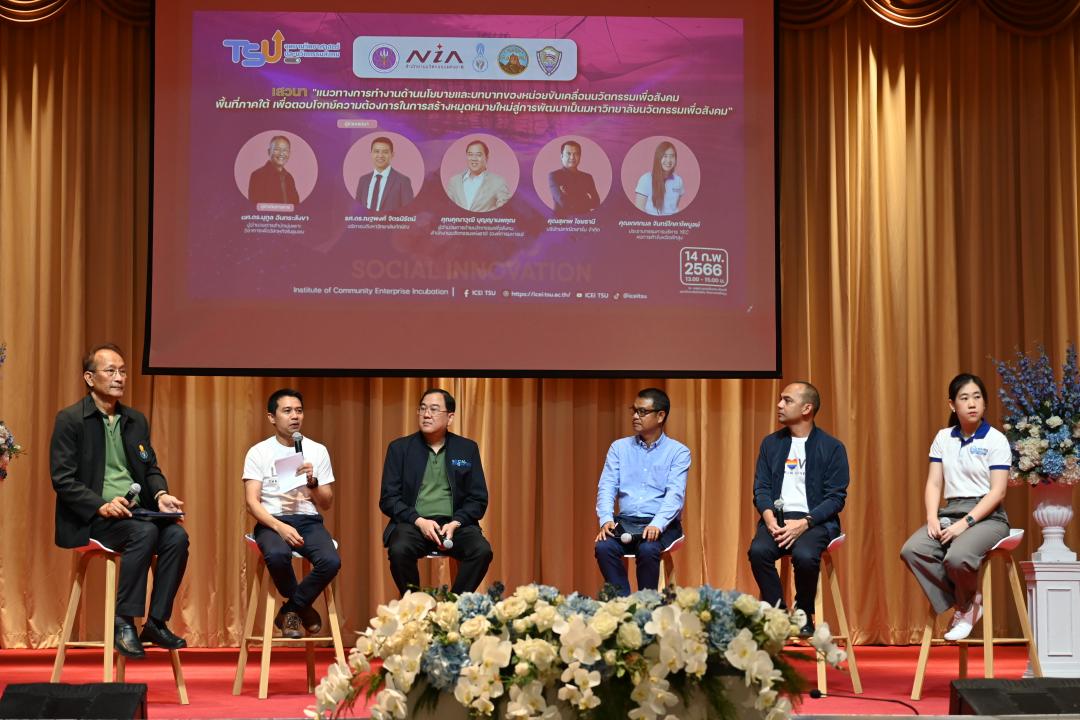 สำหรับกิจกรรมช่วงบ่าย มีการเสวนาเกี่ยวกับ "แนวทางการทำงานด้านนโยบายและบทบาทของหน่วยขับเคลื่อนนวัตกรรมเพื่อสังคม พื้นที่ภาคใต้ เพื่อตอบโจทย์ความต้องการในการสร้างหมุดหมายใหม่สู่การพัฒนาเป็นมหาวิทยาลัยนวัตกรรมเพื่อสังคม” โดยมีผู้ร่วมเสวนา ประกอบด้วย รองศาสตราจารย์ ดร.ณฐพงศ์ จิตรนิรัตน์ อธิการบดีมหาวิทยาลัยทักษิณ คุณคุณาวุฒิ บุญญานพคุณ ผู้อำนวยการฝ่ายนวัตกรรมเพื่อสังคม สำนักงานนวัตกรรมแห่งชาติ (องค์การมหาชน) คุณเกศกมล จันทร์โภคาไพบูลย์ ประธานกรรมการบริหาร YEC หอการค้าจังหวัดพัทลุง และคุณสุเทพ ไชยธานี บริษัทปลาณีตฟาร์ม จำกัด ดำเนินรายการโดย ผศ.ดร.นุกูล อินทระสังขา ผู้อำนวยการสํานักบ่มเพาะวิชาการเพื่อวิสาหกิจในชุมชน