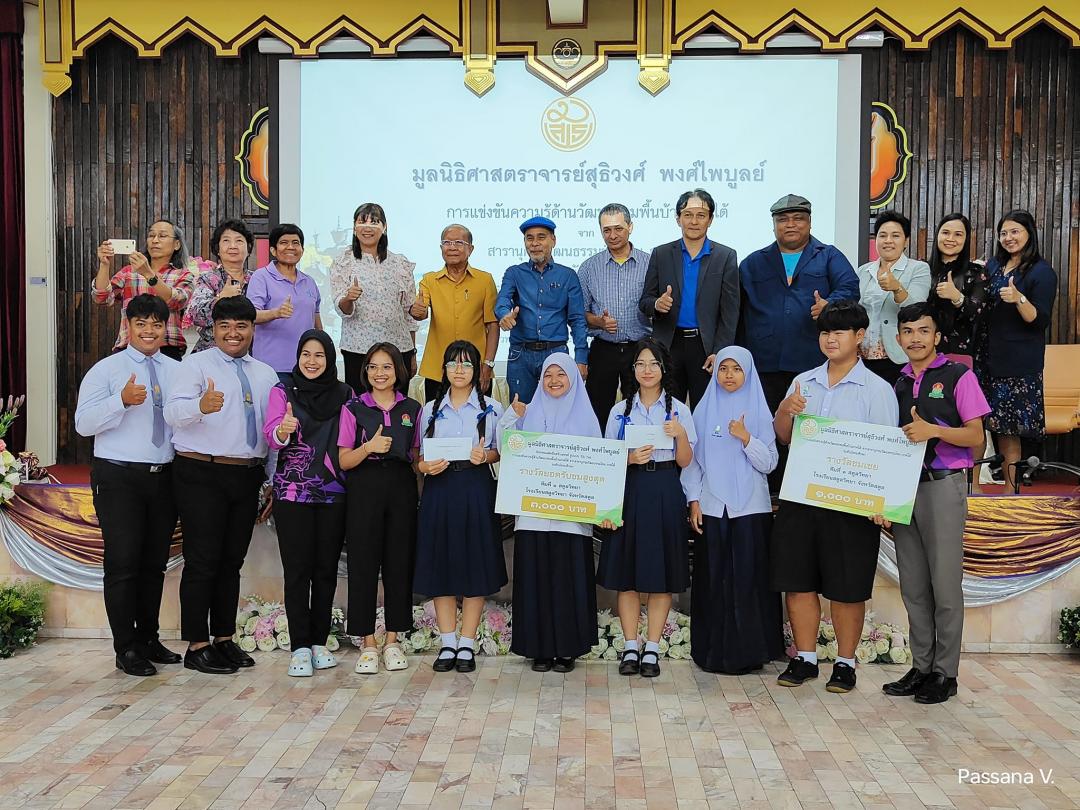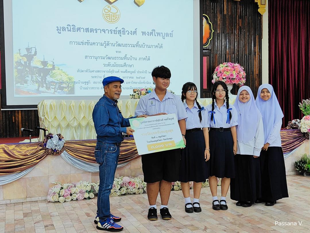 เมื่อวันที่ 19 มกราคม 2567 มูลนิธิศาสตราจารย์สุธิวงศ์ พงศ์ไพบูลย์ ร่วมกับสถาบันทักษิณคดีศึกษา มหาวิทยาลัยทักษิณจัดการแข่งขันความรู้ด้านวัฒนธรรมพื้นบ้านภาคใต้ จากสารานุกรมวัฒนธรรมไทย ภาคใต้ ระดับมัธยมศึกษารอบชิงชนะเลิศ ณ ห้องประชุมบ้านชูซูกิสถาบันทักษิณคดีศึกษา ต.เกาะยอ อ.เมือง จ.สงขลา โดยมี รศ. ไพบูลย์ ดวงจันทร์ ประธานมูลนิธิศาสตราจารย์สุธิวงศ์ พงศ์ไพบูลย์ เป็นผู้กล่าวเปิดงาน และได้รับเกียรติจาก อาจารย์สถาพร ศรีสัจจัง ศิลปินแห่งชาติสาขาวรรณศิลป์ ประจำปี 2548 เป็นผู้มอบรางวัล ร่วมด้วย อาจารย์เทพรัตน์ จันทพันธ์ รักษาการแทนผู้อำนวยการ สถาบันทักษิณคดีศึกษาและคณะกรรมการมูลนิธิศาสตราจารย์สุธิวงศ์ พงศ์ไพบูลย์ ร่วมมอบรางวัลให้แก่ผู้ชนะการแข่งขัน โดยมี อาจารย์วุฒิชัย เพ็ชรสุวรรณ เป็นผู้ดำเนินรายการร่วมกับนิสิตคณะมนุษยศาสตร์สังคมศาสตร์ มหาวิทยาลัยทักษิณ โดยผลการแข่งขันมีดังนี้