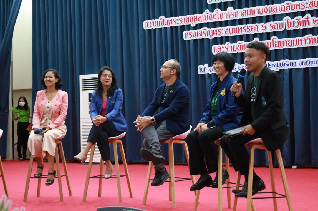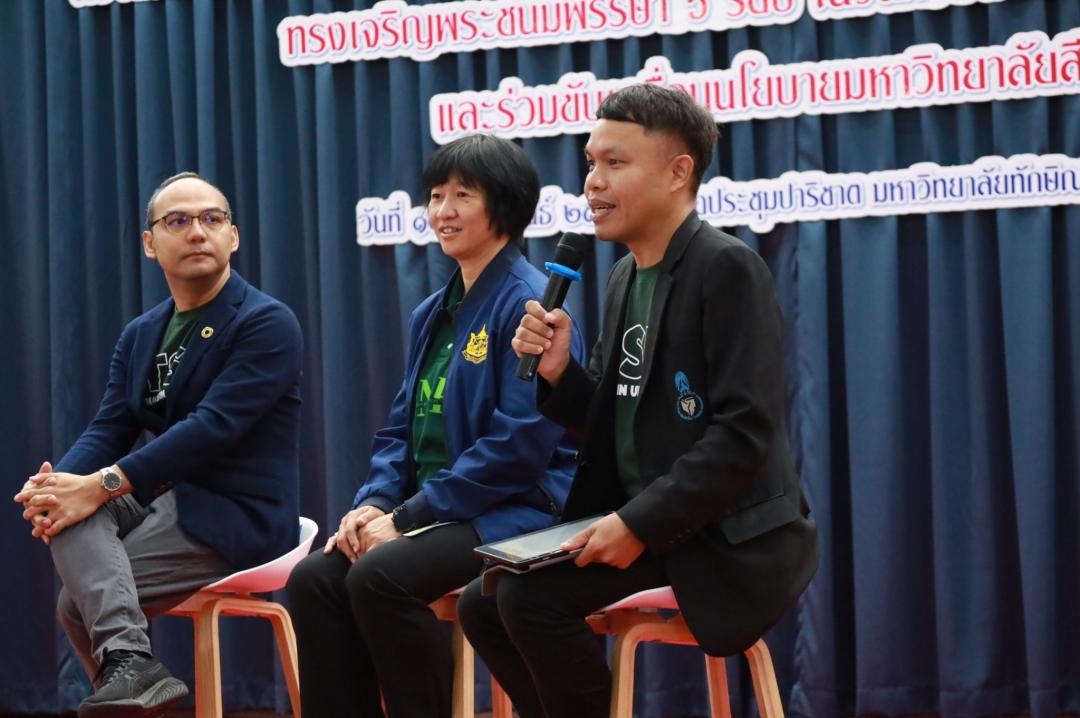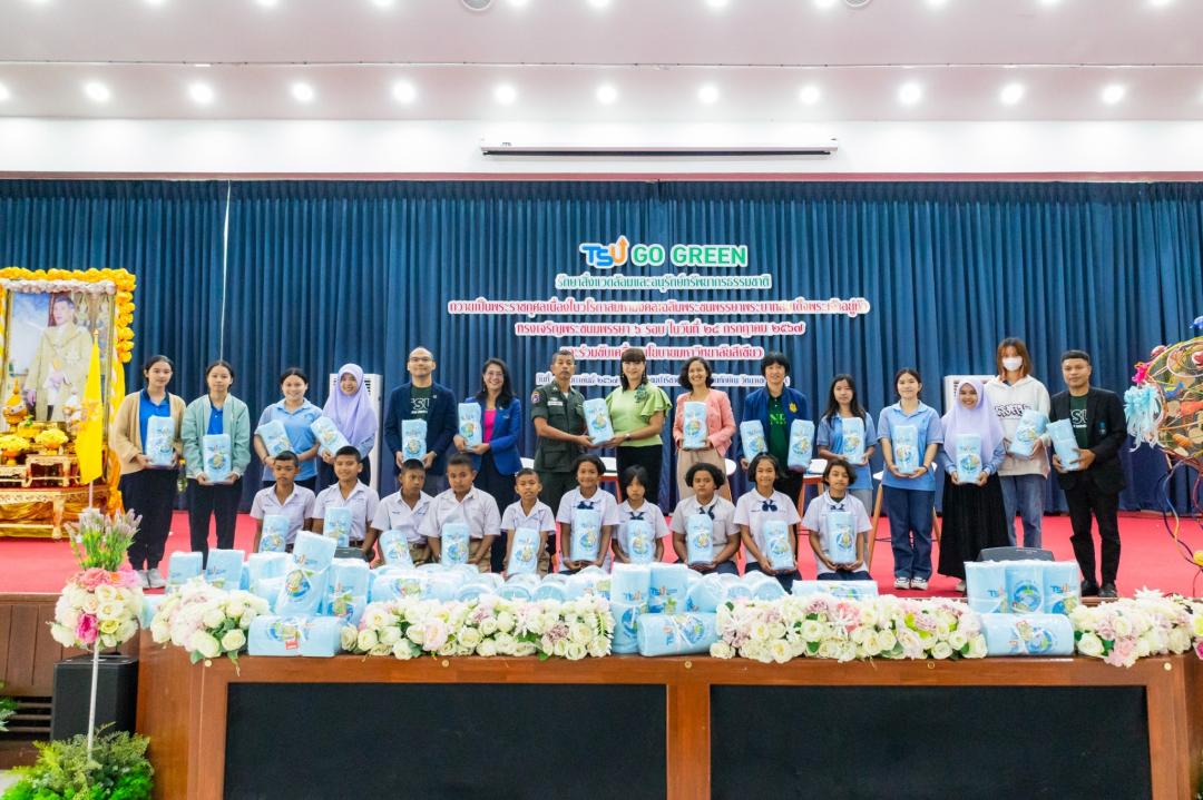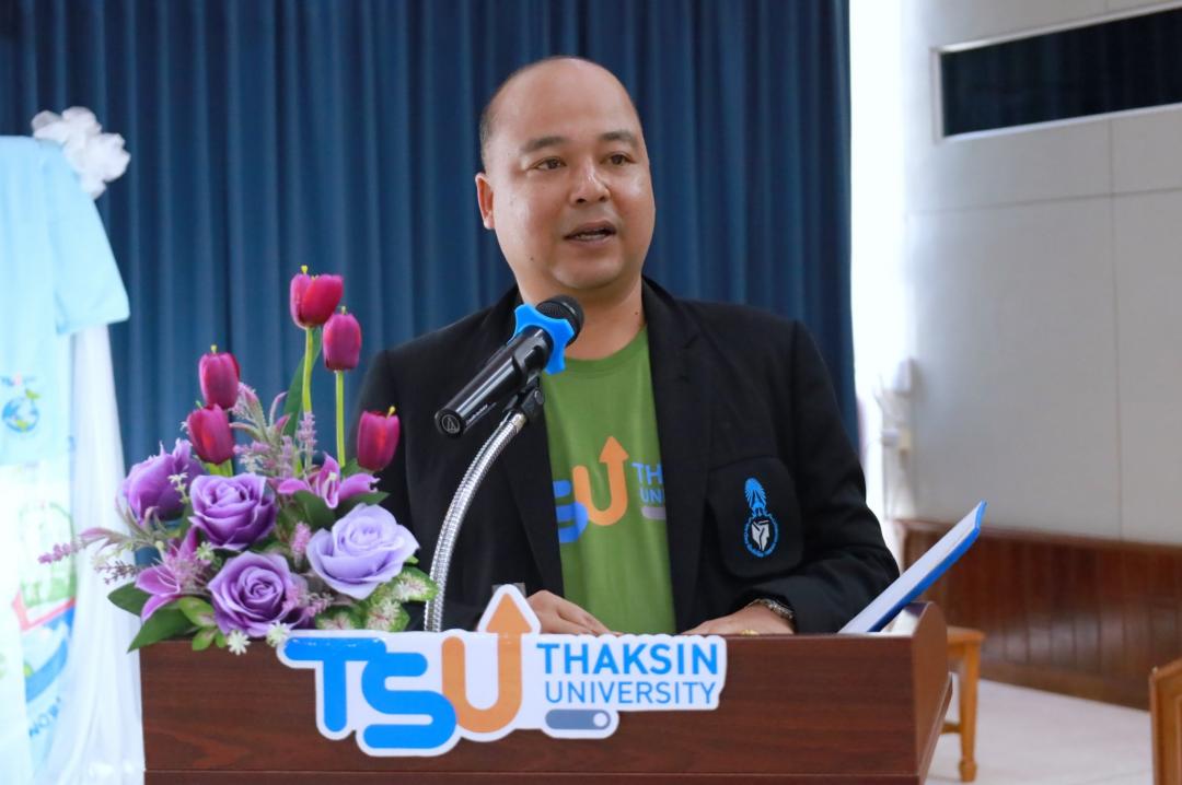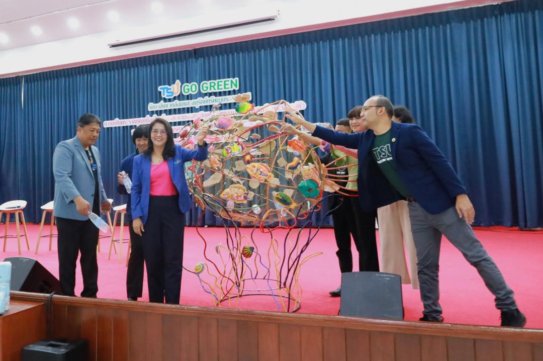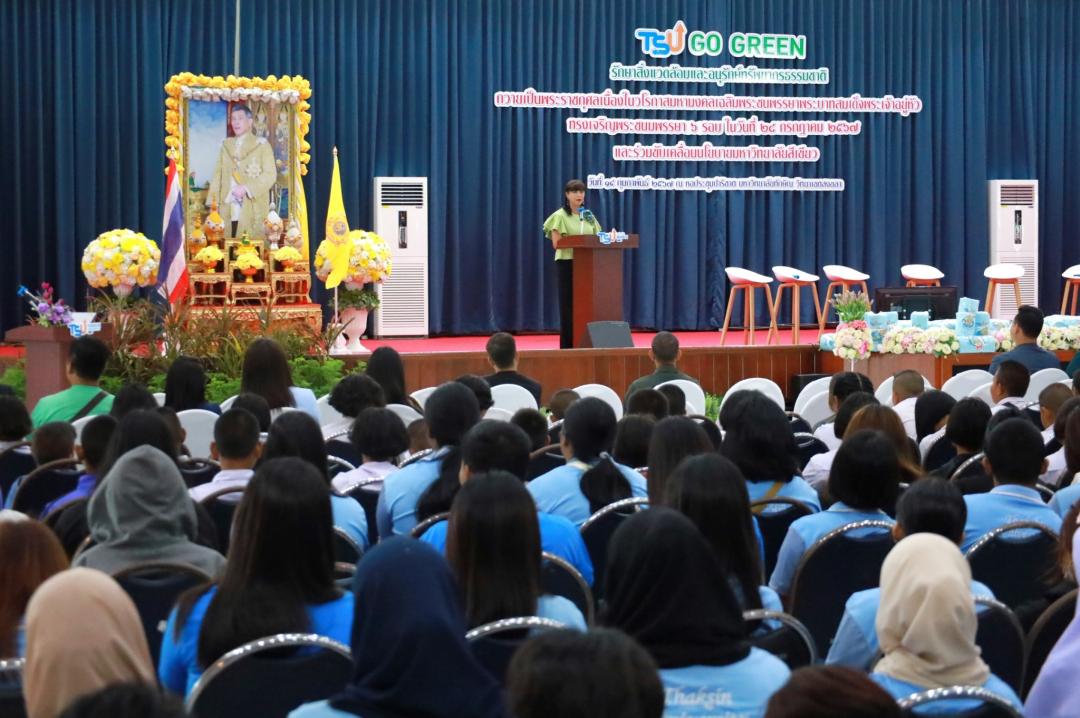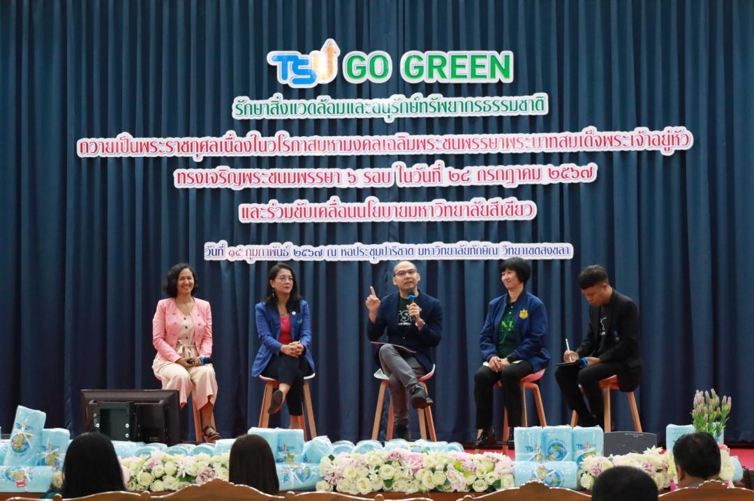 เมื่อวันที่ 14 กุมภาพันธ์ 2567 สำนักงานวิทยาเขตสงขลา จัดโครงการ TSU GO GREEN ณ หอประชุมปาริชาต มหาวิทยาลัยทักษิณ วิทยาเขตสงขลา โดยมีวัตถุประสงค์เพื่อส่งเสริมสิ่งแวดล้อมและอนุรักษ์ทรัพยากรธรรมชาติถวายเป็นพระราชกุศลเนื่องในโอกาส มหามงคลเฉลิมพระชนมพรรษาพระบาทสมเด็จพระเจ้าอยู่หัว ทรงเจริญพระชนมพรรษา 6 รอบ ในวันที่ 28 กรกฎาคม 2567 และขับเคลื่อนหมุดหมายนโยบายมหาวิทยาลัยสีเขียวโดยมี อาจารย์วีณา ลีลาประเสริฐศิลป์ รองอธิการบดีวิทยาเขตสงขลา เป็นประธานในพิธี กิจกรรมภายในงานประกอบด้วย การเสวนา TSU GO GREEN หัวข้อ “Green University” การจัดแสดงนิทรรศการรักษ์โลก และนิทรรศการ TSU GO GREEN การประกวดแฟชั่นรักษ์โลก การประกวดออกแบบผลิตภัณฑ์รักษ์โลก (จากวัสดุรีไซเคิล) สำหรับการเสวนามีผู้ร่วมเสวนาประกอบด้วย รองศาสตราจารย์ ดร.สมัคร แก้วสุกแสง รองอธิการบดีฝ่ายวิจัยและนวัตกรรม ผศ.ดร.ธัญญา พันธ์ฤทธิ์ดำ รองอธิการบดีวิทยาเขตพัทลุง หัวข้อ “การกำจัดขยะภายในมหาวิทยาลัย” อาจารย์ ดร. วิกาญดา ทองเนื้อแข็ง อาจารย์ประจำคณะวิทยาศาสตร์และนวัตกรรมดิจิทัล หัวข้อ “ภัยร้ายผ่าน PM 2.5 และผลกระทบจากภาวะโลกร้อน” นางนำจิตร จันทร์หอม ผู้อำนวยการส่วนสิ่งแวดล้อม สำนักงานทรัพยากรธรรมชาติและสิ่งแวดล้อมจังหวัดสงขลา หัวข้อ “ผลกระทบต่อสภาพแวดล้อมและแนวทางแก้ปัญหาจากนโยบายรัฐ” โดยมี ดร.บัณฑิต ทองสงฆ์ ผู้ช่วยอธิการบดีฝ่ายกิจการนิสิตและพันธกิจสัมพันธ์ ทำหน้าที่ผู้ดำเนินรายการ ภายหลังจากการเสวนา คณะผู้บริหารมหาวิทยาลัยทักษิณ ร่วมส่งมอบผ้าห่มรักษ์โลก จำนวน 300 ผืน ให้แก่นักเรียนโรงเรียนตำรวจตระเวนชายแดน และนิสิตหอพักมหาวิทยาลัยทักษิณ โดยมีผู้เทนรับมอบผ้าห่มผ่านกิจกรรมส่งมอบผ้าห่มรักษ์โลก ส่วนภาคบ่ายมีการประกวดแฟชั่นรักษ์โลก การประกวดออกแบบผลิตภัณฑ์รักษ์โลก (จากวัสดุรีไซเคิล) และการจัดนิทรรศการ TSU GO GREEN