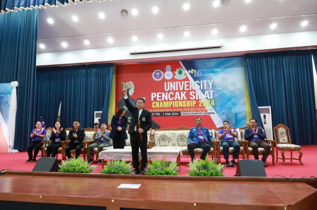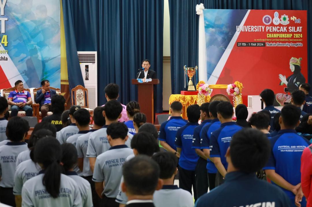 อาจารย์ ดร.เกษม พันธุสะ ในนามของผู้แทนสำนักงานปลัดกระทรวงการอุดมศึกษา วิทยาศาสตร์ วิจัยและนวัตกรรม และมหารวิทยาลัยทักษิณ รายงานการจัดการแข่งขันในครั้งนี้ว่า แข่งขันกีฬาปันจักสีลัต University Pencak Silat Championship 2024 เป็นกิจกรรมหนึ่งที่เปิดโอกาสให้ นิสิต นักศึกษา ในสถาบันอุดมศึกษาได้มีโอกาสแสดงศักยภาพทางกีฬาปันจักสีลัต และยังเป็นการ คัดเลือกตัวแทนนักกีฬาของประเทศไทยเข้าร่วมการแข่งขันกีฬามหาวิทยาลัยอาเขียน ครั้งที่ 21 ในช่วงเดือนกรกฏาคมนี้ มหาวิทยาลัยทักษิณในฐานะเป็นศูนย์กลางการประสานงานการพัฒนากีฬาปันจักลีลัต ตามนโยบายของรัฐบาลและกระทรวงการอุดมศึกษา วิทยาศาสตร์ วิจัยและนวัตกรรม ในการส่งเสริมสนับสนุนสถานศึกษาให้มีความเป็นเลิศทางด้านกีฬาอย่างเป็นรูปธรรมและพัฒนา ศักยภาพด้านกีฬาของนิสิต นักศึกษาในสถาบันอุดมศึกษา พร้อมทั้งจะได้นำองค์ความรู้ทางด้านวิทยาศาสตร์การกีฬาเข้ามามีส่วนช่วยในการสร้างสมรรถนะนักฬา ให้มีโอกาสพัฒนาไปสู่การ แข่งขันเพื่อเป็นตัวแทนทีมชาติต่อไป สำหรับการแข่งขันในครั้งนี้ มหาวิทยาลัยทักษิณได้รับเกียรติเป็นเจ้าภาพการแข่งขัน ขึ้นในระหว่างวันที่ 27 กุมภาพันธ์ - 1 มีนาคม 2567 ณ หอประชุมปาริชาต มหาวิทยาลัยทักษิ ณ วิทยาเขตสงขลา