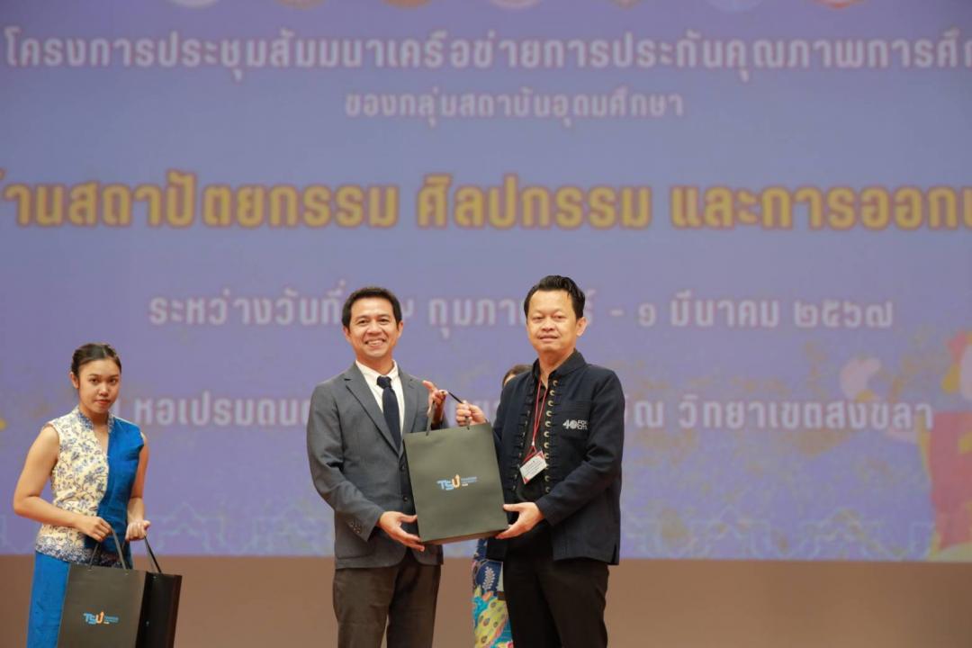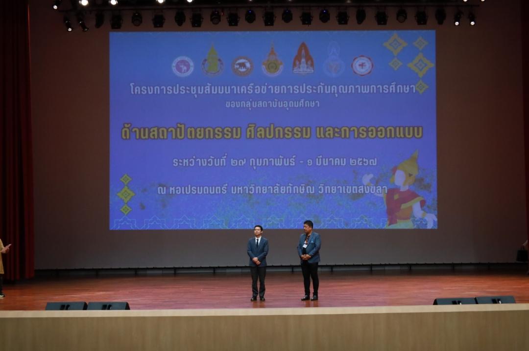 รองศาสตราจารย์ ดร.ณฐพงศ์ จิตรนิรัตน์ อธิการบดี มหาวิทยาลัยทักษิณ กล่าวต้อนรับผู้เข้าร่วมประชุม พร้อมทั้งให้ข้อมูลว่า การประชุมในครั้งนี้แสดงออกถึงการร่วมสานพลังเรียนรู้เพื่อการพัฒนาองค์กรในแบบที่เราต้องการ จะเห็นได้ว่าบริบทความต่างของพื้นที่/ภูมิภาคแต่ละสถาบัน สู่การแลกเปลี่ยนเรียนรู้บริบทของ 7 สถาบันการศึกษา 10 คณะวิชา เป็นแนวทางสู่วางแผนให้เกิดการพัฒนาองค์กรสู่ความเป็นเลิศในอนาคต เกิดกระบวนการเรียนรู้จากการแลกเปลี่ยน ถ่ายทอดแนวทางการดำเนินการที่เป็นเลิศ/แนวปฏิบัติที่ดีด้านการประกันคุณภาพการศึกษาจากคณาจารย์และบุคลากรสายสนับสนุน ที่สามารถนำไปแบบอย่างหรือประยุกต์ใช้ในการปรับปรุงกระบวนการและผลลัพธ์การดำเนินงานของสถาบัน โครงการในวันนี้เป็นโครงการที่สะท้อนความเข้มแข็งของการทำงานร่วมกันกับกลุ่มสถาบันอุดมศึกษาทางด้านสถาปัตยกรรม ศิลปกรรมและการออกแบบ ยกระดับคุณภาพการจัดการศึกษาของสถาบันได้อย่างก้าวกระโดดและยังเป็นศูนย์กลางการสร้างสัมพันธภาพและเวทีแห่งการแลกเปลี่ยนเรียนรู้ เพื่อการดำเนินการที่เป็นเลิศ/แนวปฏิบัติที่ดี ไปใช้ในการประกันคุณภาพการศึกษาของเครือข่ายกลุ่มสถาบันอุดมศึกษาด้านสถาปัตยกรรม ศิลปกรรมและการออกแบบ