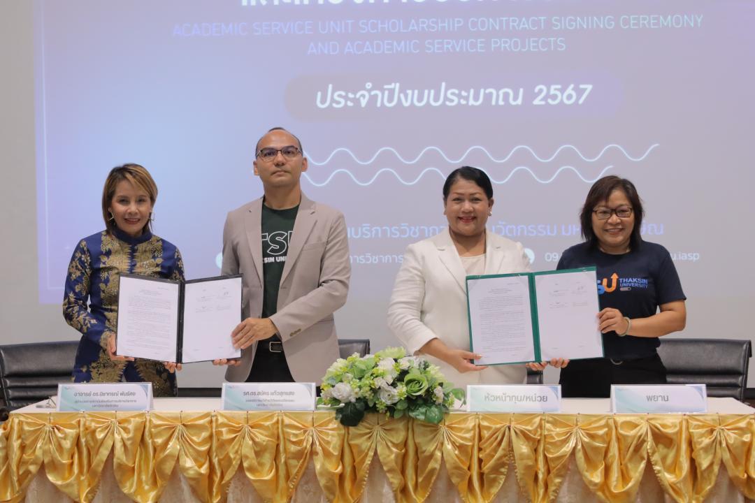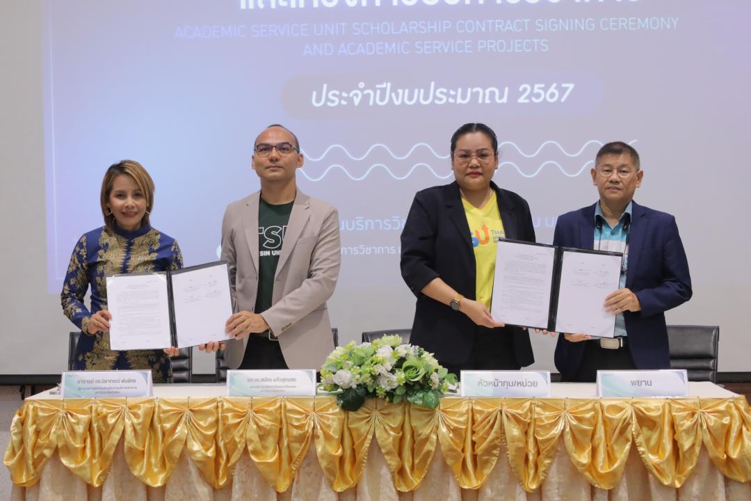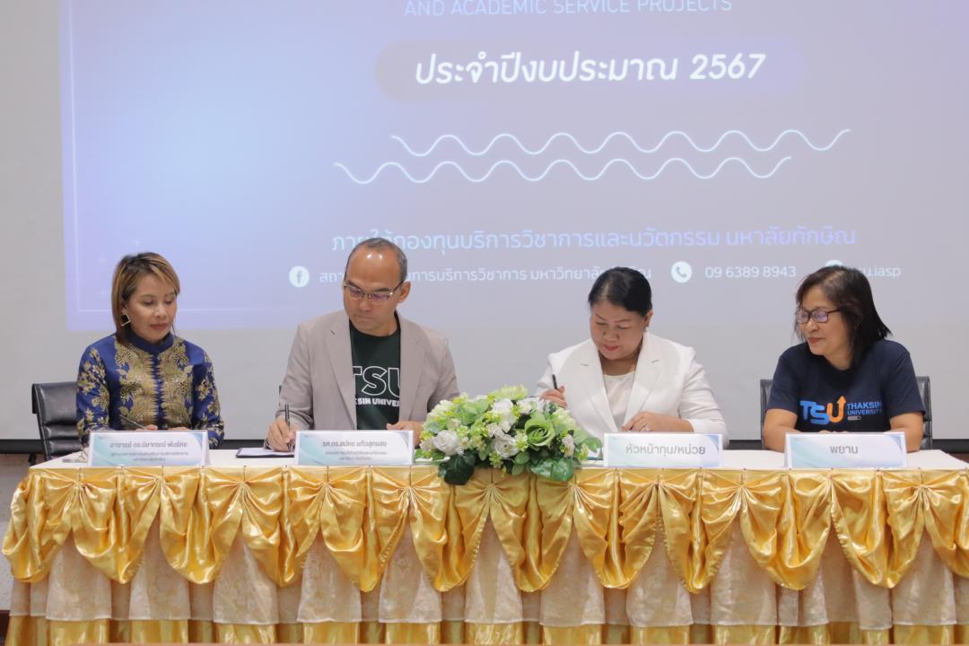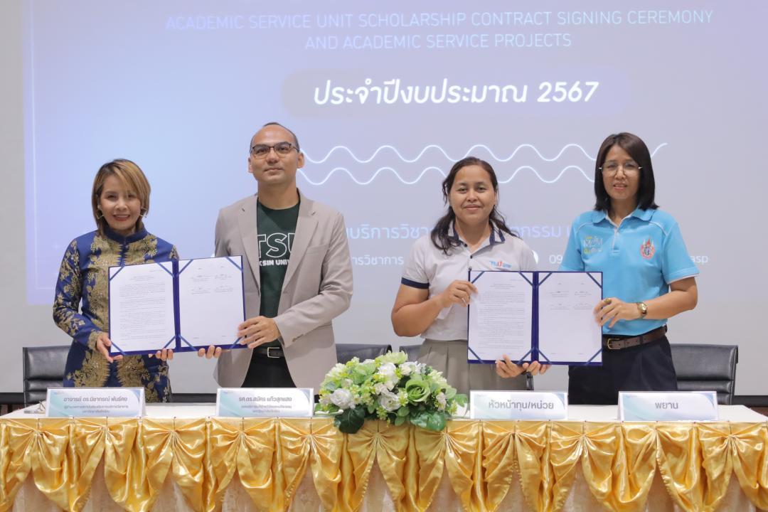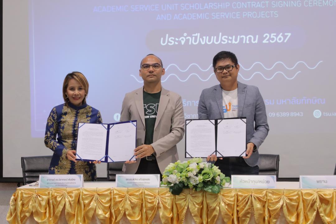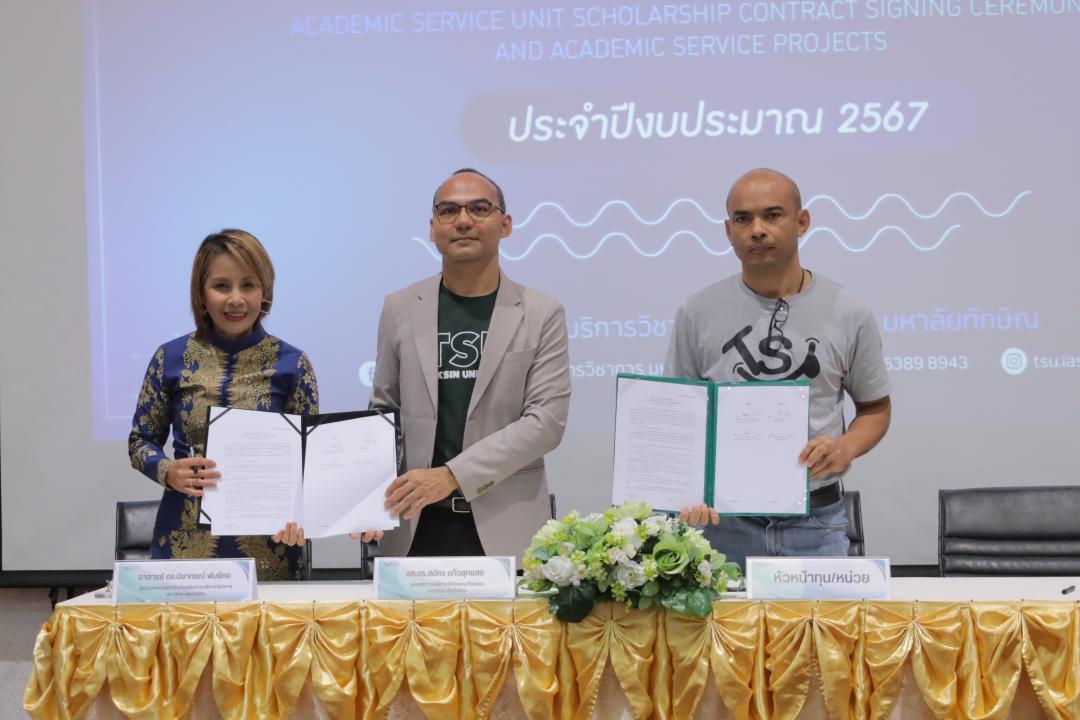 เมื่อวันที่ 21 มีนาคม 2567 สถาบันส่งเสริมการบริการวิชาการ ได้จัดพิธีลงนามสัญญารับทุนหน่วยบริการวิชาการและโครงการบริการวิชาการ ประจำปีงบประมาณ 2567 เมื่อวันที่ 21 มีนาคม 2567 เวลา 08.00 น. – 12.00 น. ณ ห้องประชุมสภามหาวิทยาลัย อาคารบริหารและสำนักงานกลาง มหาวิทยาลัยทักษิณ วิทยาเขตพัทลุง ซึ่งได้รับเกียรติจากรองศาสตราจารย์ ดร.สมัคร แก้วสุกแสง รองอธิการบดีฝ่ายวิจัยและนวัตกรรม กล่าวถึงบทบาทของกองทุนบริการวิชาการและนวัตกรรม มหาวิทยาลัยทักษิณ และการดำเนินงานของหน่วยบริการวิชาการและโครงการที่ได้รับทุนเพื่อตอบค่าเป้าหมาย (KPI) ตามยุทธศาสตร์ของมหาวิทยาลัย ในส่วนของ อาจารย์ ดร.นิชากรณ์ พันธ์คง ผู้อำนวยการสถาบันส่งเสริมการบริการวิชาการ ได้ให้ข้อมูลแนวทางการดำเนินงานและการบริหารจัดการทุนบริการวิชาการที่ได้รับงบประมาณในปี 2567 พร้อมกันนี้ทั้งสองท่านได้ให้เกียรติลงนามเป็นผู้ให้ทุนในสัญญารับทุน โดยมีหน่วยบริการวิชาการที่ผ่านการพิจารณาจัดสรรทุนบริการวิชาการ จำนวน 5 หน่วยบริการวิชาการและโครงการบริการวิชาการ จำนวน 11 โครงการ งบประมาณสนับสนุนประมาณสองล้านบาท รายละเอียดดังนี้