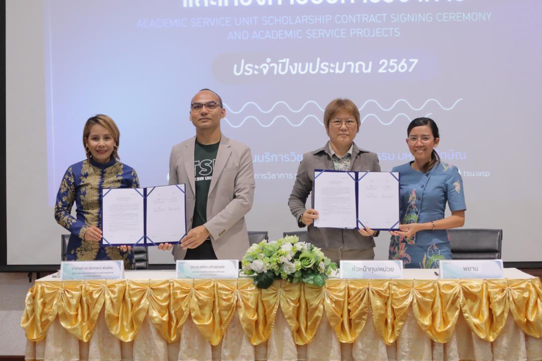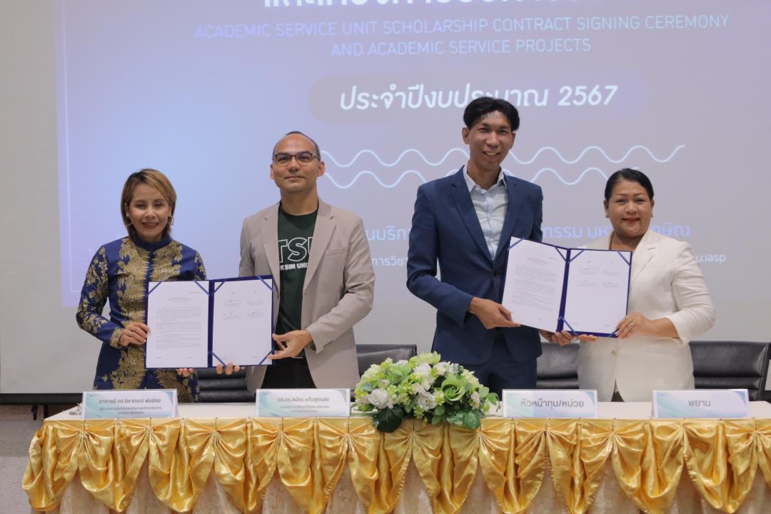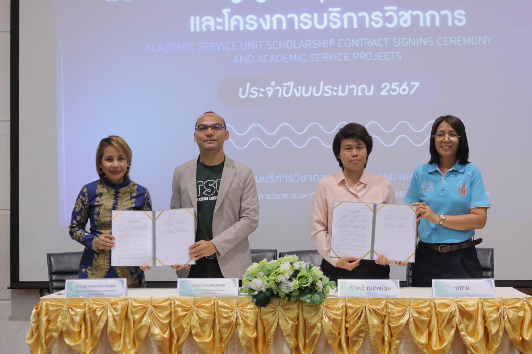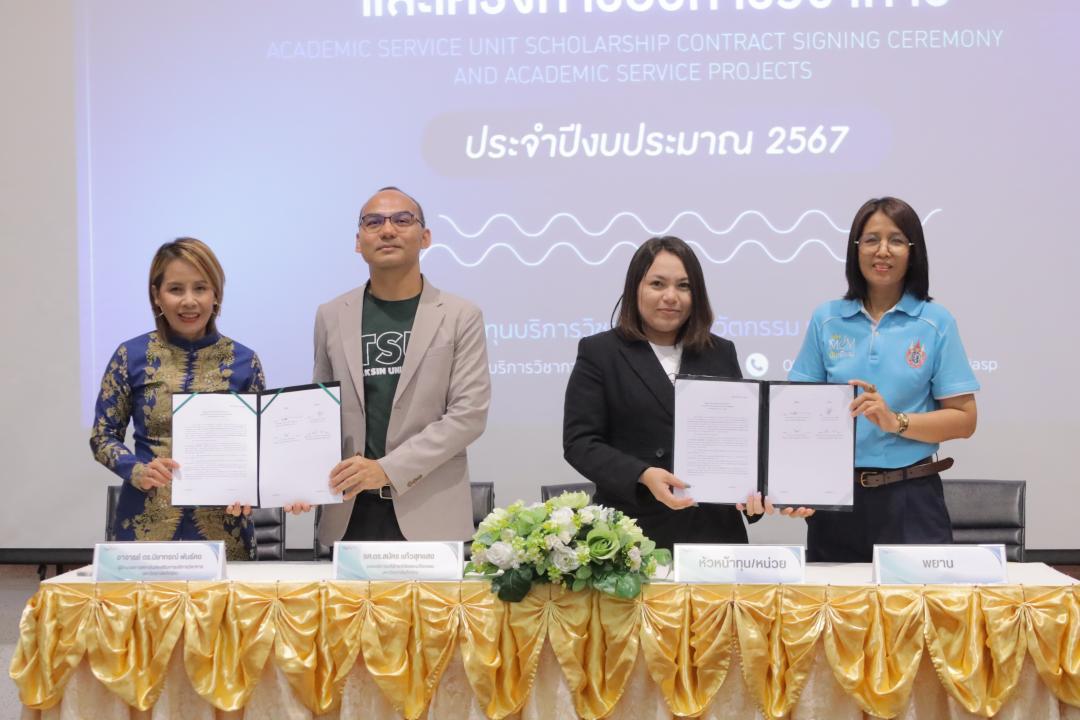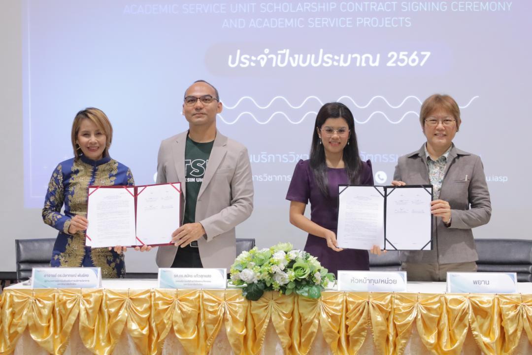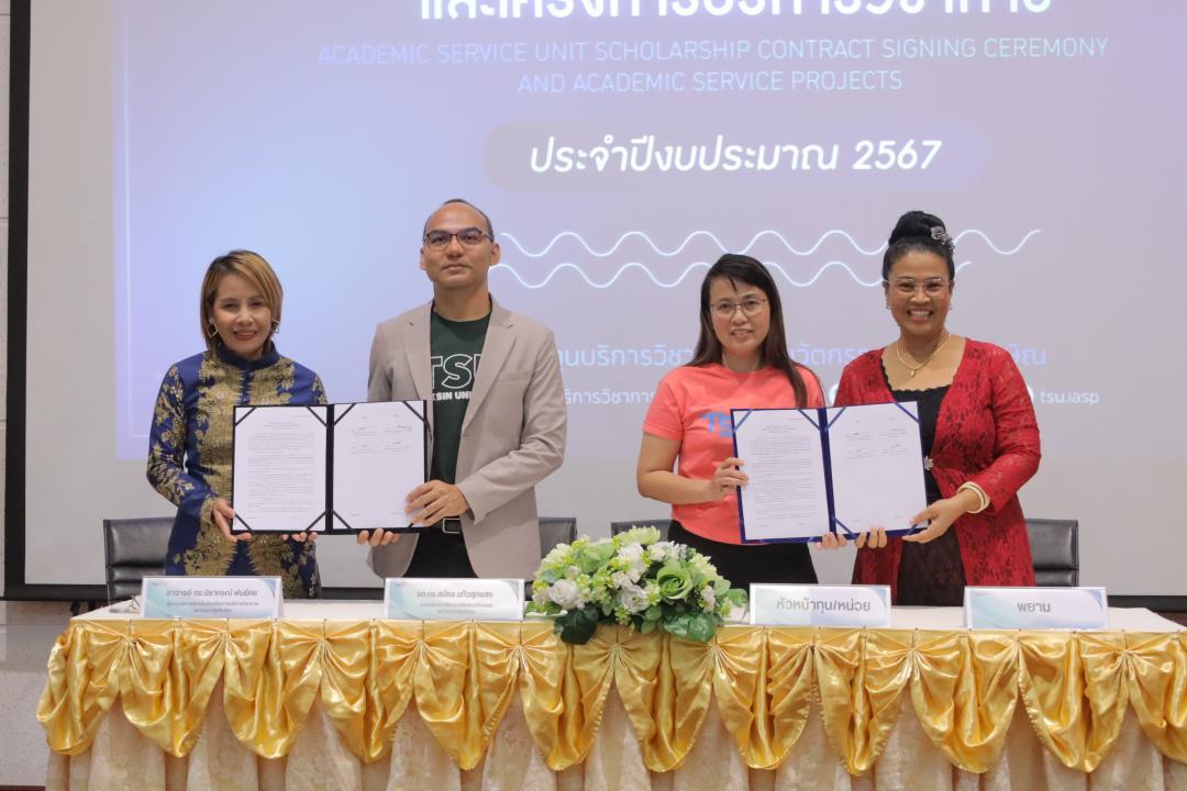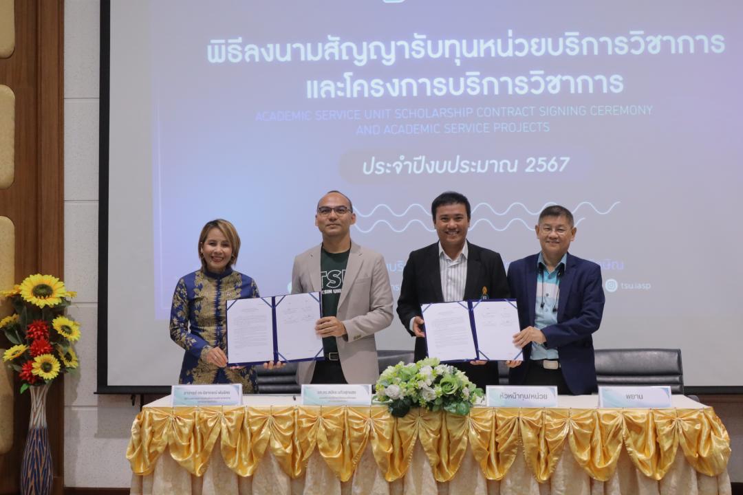 เมื่อวันที่ 21 มีนาคม 2567 สถาบันส่งเสริมการบริการวิชาการ ได้จัดพิธีลงนามสัญญารับทุนหน่วยบริการวิชาการและโครงการบริการวิชาการ ประจำปีงบประมาณ 2567 เมื่อวันที่ 21 มีนาคม 2567 เวลา 08.00 น. – 12.00 น. ณ ห้องประชุมสภามหาวิทยาลัย อาคารบริหารและสำนักงานกลาง มหาวิทยาลัยทักษิณ วิทยาเขตพัทลุง ซึ่งได้รับเกียรติจากรองศาสตราจารย์ ดร.สมัคร แก้วสุกแสง รองอธิการบดีฝ่ายวิจัยและนวัตกรรม กล่าวถึงบทบาทของกองทุนบริการวิชาการและนวัตกรรม มหาวิทยาลัยทักษิณ และการดำเนินงานของหน่วยบริการวิชาการและโครงการที่ได้รับทุนเพื่อตอบค่าเป้าหมาย (KPI) ตามยุทธศาสตร์ของมหาวิทยาลัย ในส่วนของ อาจารย์ ดร.นิชากรณ์ พันธ์คง ผู้อำนวยการสถาบันส่งเสริมการบริการวิชาการ ได้ให้ข้อมูลแนวทางการดำเนินงานและการบริหารจัดการทุนบริการวิชาการที่ได้รับงบประมาณในปี 2567 พร้อมกันนี้ทั้งสองท่านได้ให้เกียรติลงนามเป็นผู้ให้ทุนในสัญญารับทุน โดยมีหน่วยบริการวิชาการที่ผ่านการพิจารณาจัดสรรทุนบริการวิชาการ จำนวน 5 หน่วยบริการวิชาการและโครงการบริการวิชาการ จำนวน 11 โครงการ งบประมาณสนับสนุนประมาณสองล้านบาท รายละเอียดดังนี้
