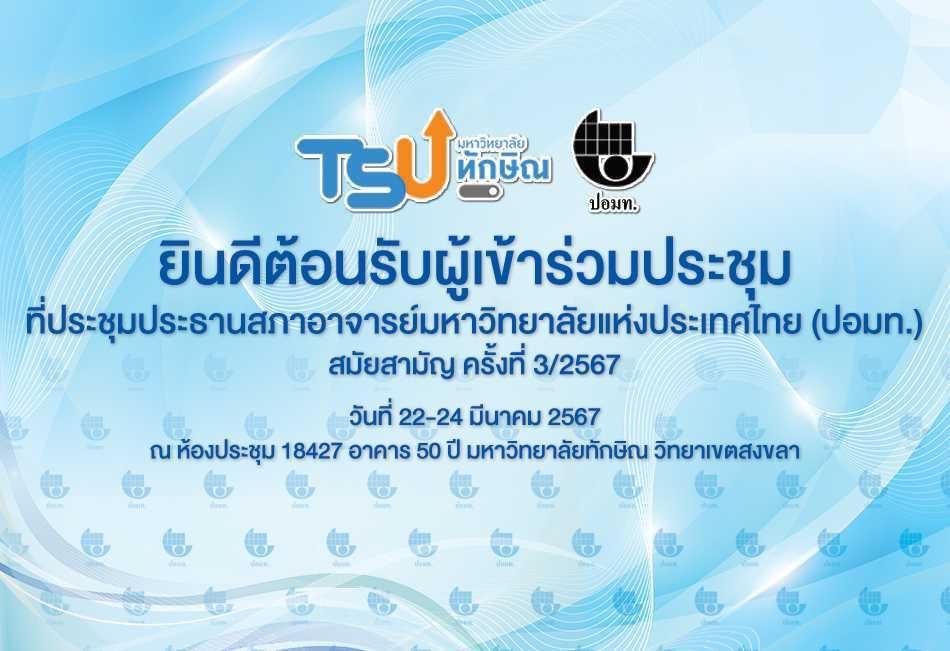 เมื่อวันที่ 23 มีนาคม 2567 สภาคณาจารย์และพนักงาน มหาวิทยาลัยทักษิณ ได้รับเกียรติเป็นเจ้าภาพจัดการประชุมประธานสภาอาจารย์มหาวิทยาลัยแห่งประเทศไทย (ปอมท.) สมัยสามัญ ครั้งที่ 3/2567 นำโดยอาจารย์พลัฏฐ์ ยิ้มประเสริฐ ประธานสภาคณาจารย์และพนักงาน มหาวิทยาลัยทักษิณ และกรรมการสภาคณาจารย์ มหาวิทยาลัยทักษิณ ร่วมให้การต้อนรับ โดยมี รองศาสตราจารย์ ดร.ณฐพงศ์ จิตรนิรัตน์ อธิการบดีมหาวิทยาลัยทักษิณ กล่าวต้อนรับและเปิดการประชุม ณ ห้องประชุม 18427 ชั้น 4 อาคาร 50 ปี มหาวิทยาลัยทักษิณ วิทยาเขตสงขลา สำหรับการจัดการประชุมในครั้งนี้ กำหนดขึ้นระหว่างวันที่ 23-24 มีนาคม 2567 มีวัตถุประสงค์ เพื่อเป็นเวทีที่เปิดโอกาสให้มหาวิทยาลัย และสถาบันอุดมศึกษาได้แลกเปลี่ยน