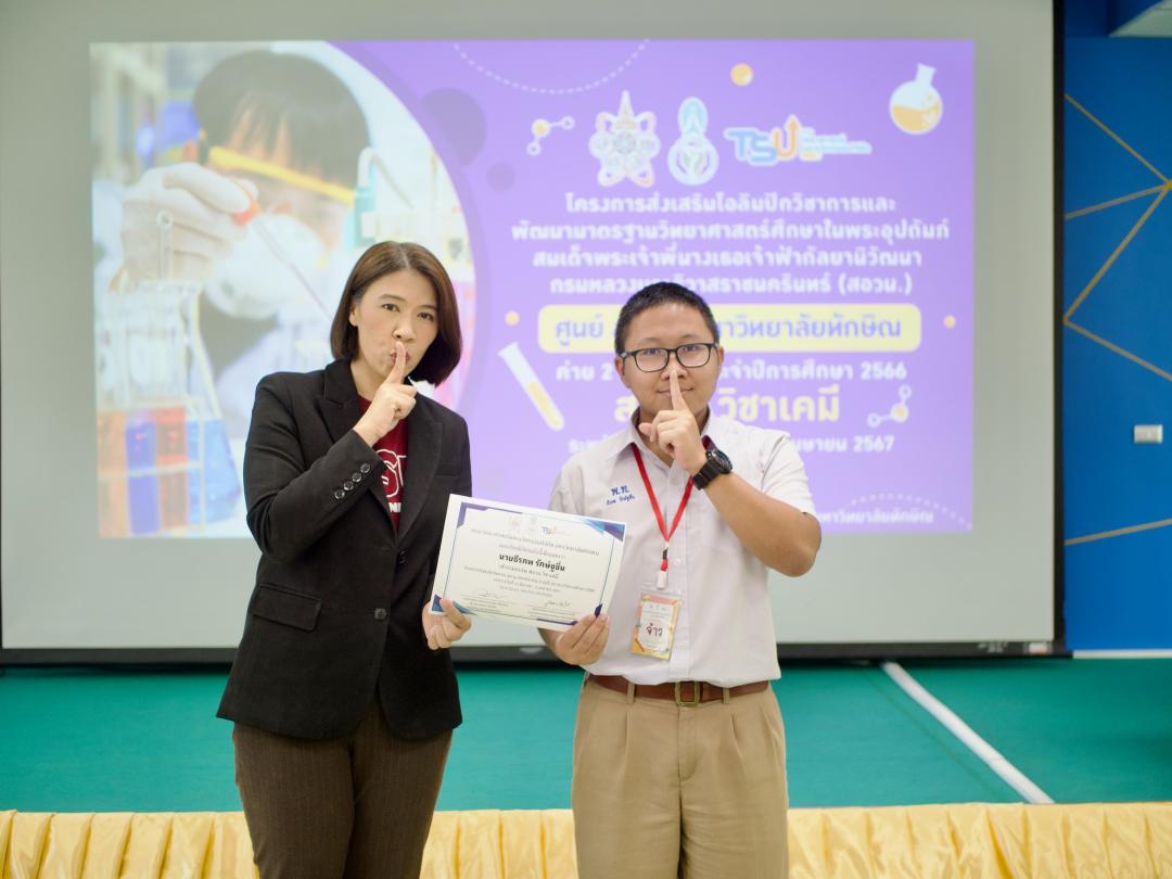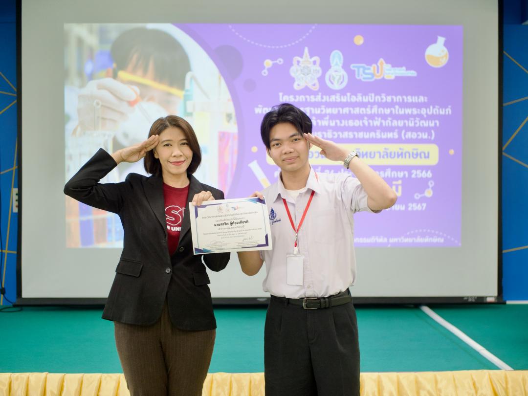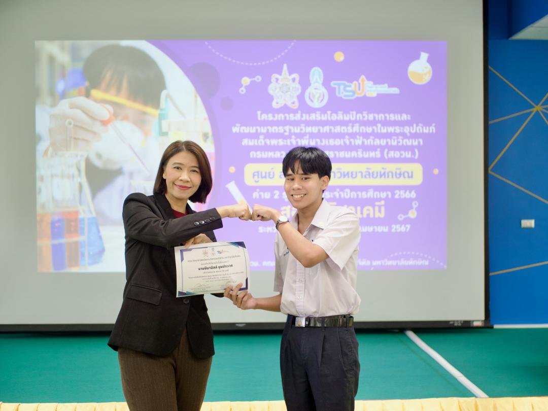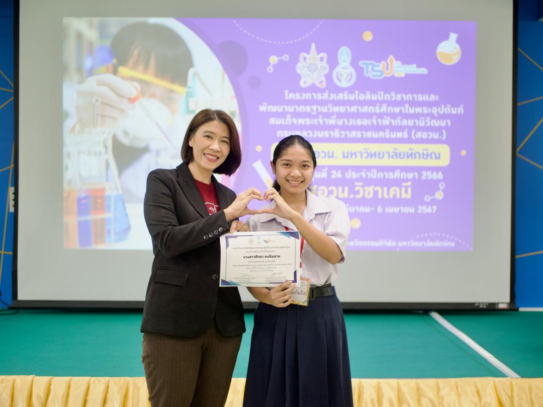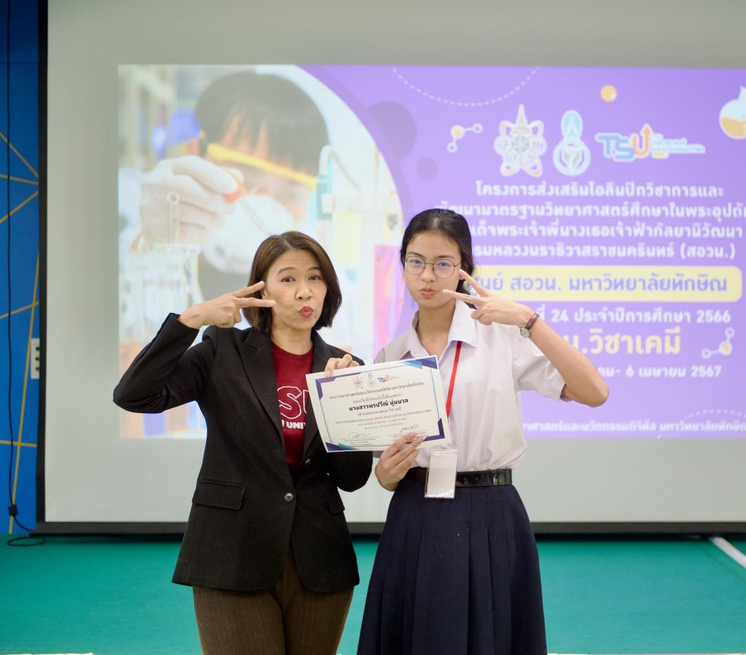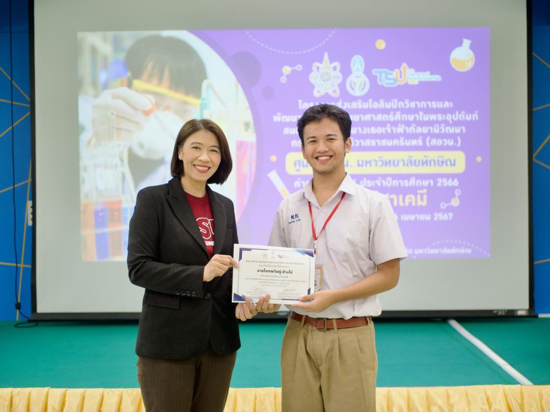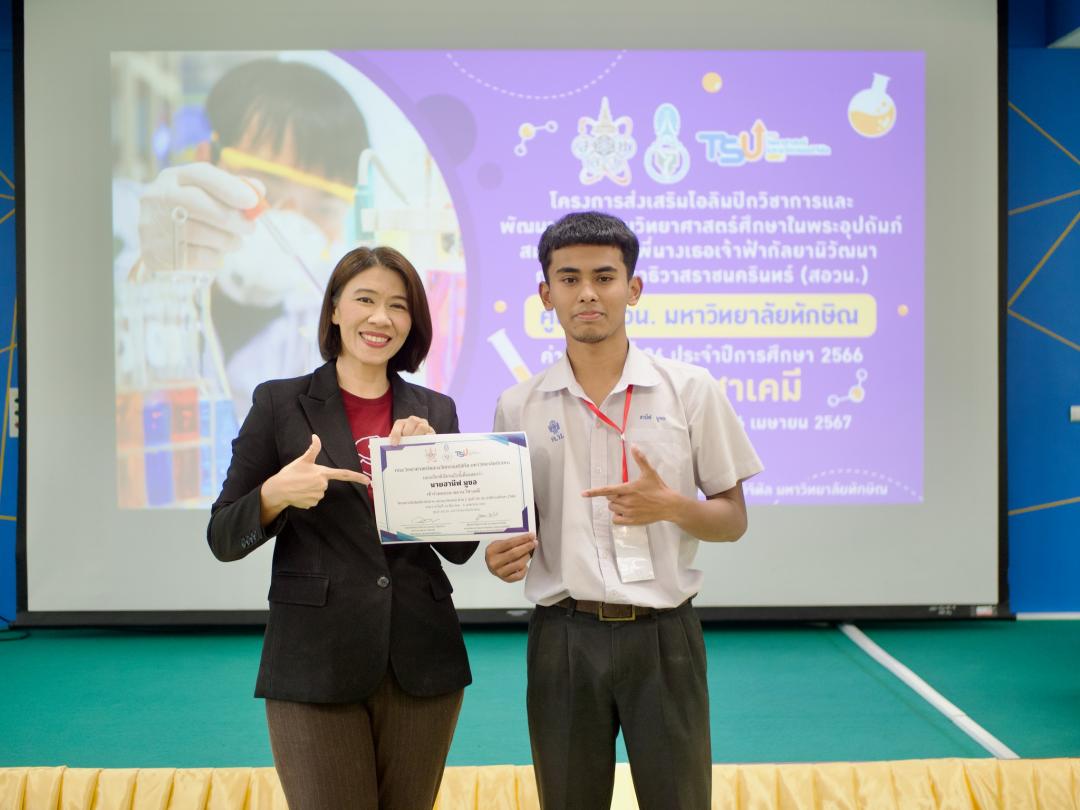 คณะวิทยาศาสตร์และนวัตกรรมดิจิทัล มหาวิทยาลัยทักษิณ จัดกิจกรรมพิธีปิดโครงการส่งเสริมโอลิปิกวิชาการและพัฒนามาตรฐานวิทยาศาสตร์ศึกษาในพระอุปถัมภ์สมเด็จพระเจ้าพี่นางเธอเจ้าฟ้ากัลยานิวัฒนา กรมหลวงนราธิวาสราชนครินทร์ (สอวน.) โดย ผศ.ดร.นพมาศ ปักเข็ม ประธานศูนย์ สอวน. มหาวิทยาลัยหักษิณ คณบดีคณะวิทยาศาสตร์และนวัตกรรมดิจิทัล มหาวิทยาลัยทักษิณ ให้เกียรติกล่าวปิด และมอบเกียรติบัตรให้กับทั้ง 30 คน ที่ผ่านการเข้าค่าย สอวน. ม.ทักษิณ สาขาเคมี ตลอดระยะเวลา 15 วัน เมื่อวันที่ 6 เมษายน 2567 เวลา 13.00 น. ณ ห้อง SC1346 อาคารวิทยาศาสตร์ 1