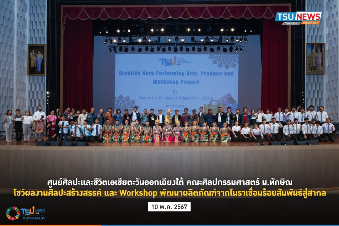 "ศูนย์ศิลปะและชีวิตเอเชียตะวันออกเฉียงไต้" จัดแสดงผลงานศิลปะสร้างสรรค์และWorkshop พัฒนาโนรา เมื่อวันศุกร์ที่ 10 พฤษภาคม 2567 ณ อาคารหอเปรมดนตรี มหาวิทยาลัยทักษิณ วิทยาเขตสงขลา เพื่อต้อนรับผู้ประชุมสัมมนานานาชาติด้านวัฒนธรรมกริช "The International Symposium on Kris Culture" กิจกรรมประกอบด้วย การแสดงโนรา โดย ผู้ช่วยศาสตราจารย์ธรรมนิตย์ นิคมรัตน์ : ศิลปินแห่งชาติ สาขาศิลปะการแสดงโนรา ประจำปี 2564 , การแสดงวงดนตรีไทยปี่พาทย์ โดย สาขาวิชาดุริยางคศาสตร์ไทย, การแสดงดนตรีสากล โดย สาขาวิชาดุริยางคศาสตร์สากล, กิจกรรมWorkshop การร้อยลูกปัดโนรา โดย ผู้ช่วยศาสตราจารย์ ดร.ปาหนัน กฤษณรมย์, นิทรรศการ "โนรา" โดยกลุ่มวิจัยโนรา (คณะศิลปกรรมศาสตร์), นิทรรศการผลงานนิสิตหลักสูตรทัศนศิลป์, และกิจกรรมต่าง ๆ อีกมากมาย