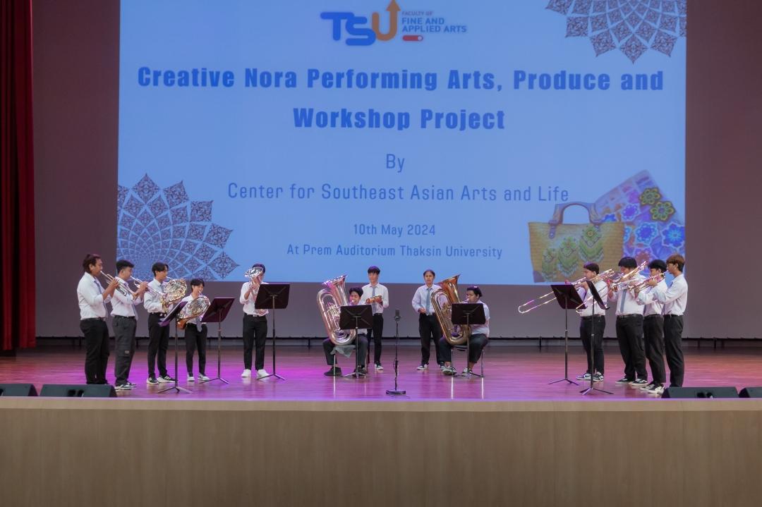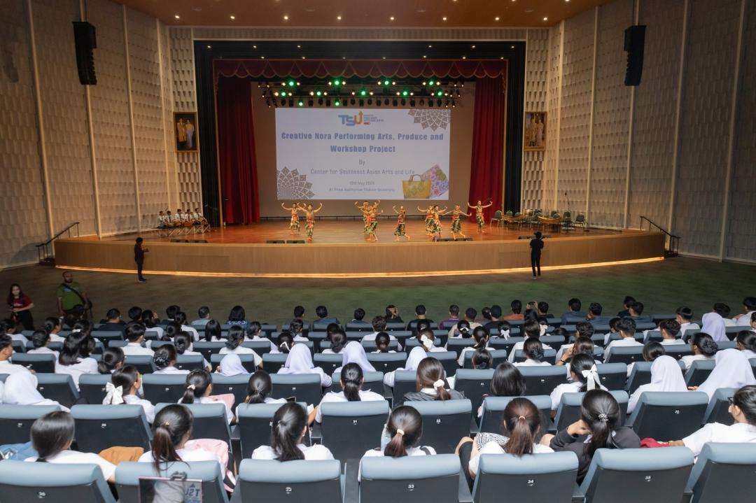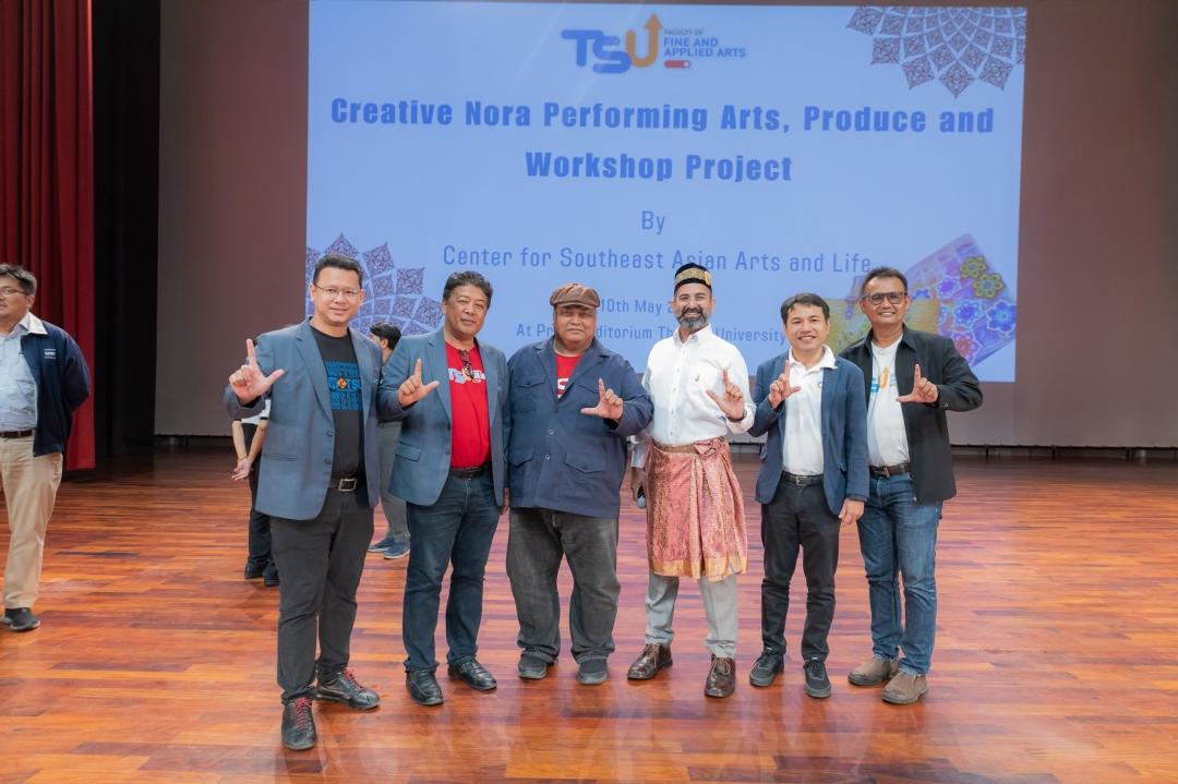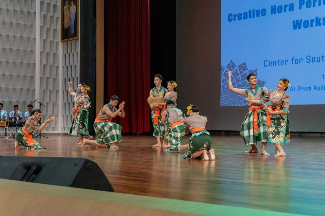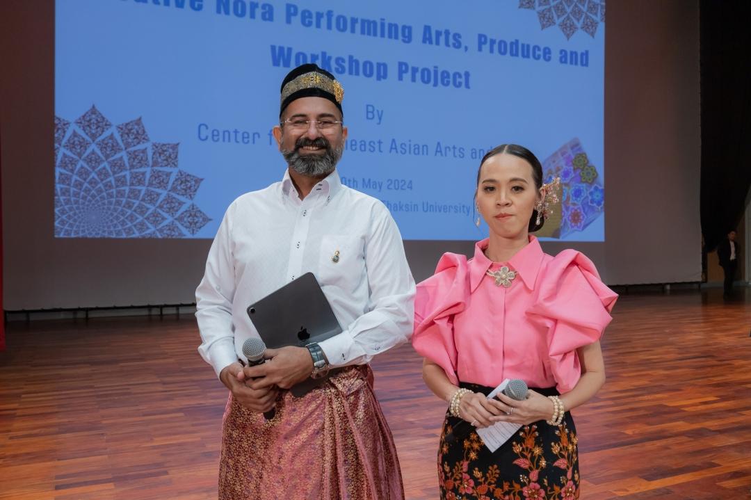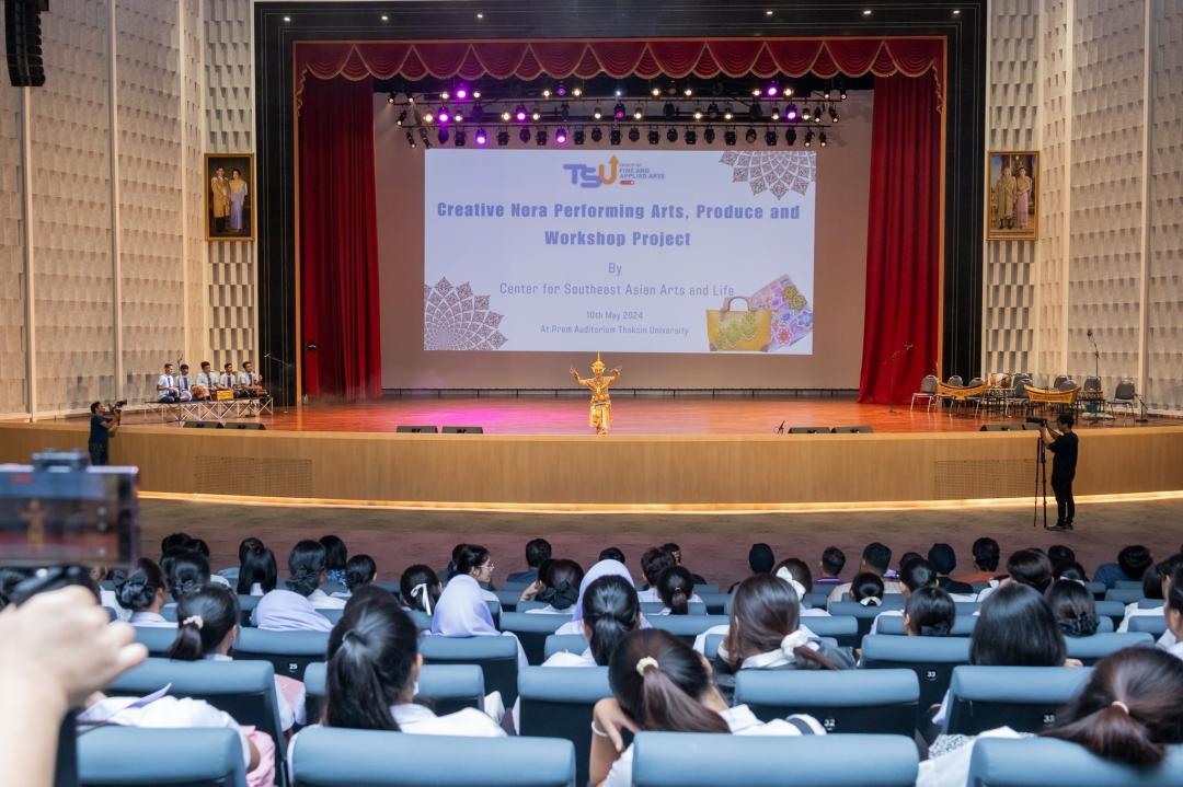 เสียงบทขับโนราของผู้ช่วยศาสตราจารย์ธรรมนิตย์ นิคมรัตน์ : ศิลปินแห่งชาติ สาขาศิลปะการแสดงโนรา ประจำปี 2564 และลูกคู่ที่สอดรับกับท่วงท่าอ่อนช้อย และจังหวะที่เร่งเร้าในบางช่วงบางตอนของการแสดงโนรา ตรึงสายตาอาคันตุกะผู้มาเยือนจากประเทศสาธารณรัฐอินโดนีเซีย, ใต้หวัน, และประเทศมาเลเซีย รวมทั้งผู้ชมภายในหอเปรมดนตรี มหาวิทยาลัยทักษิณ ซึ่งกิจกรรมดังกล่าว เป็นผลจากการดำเนินงานของ ศูนย์ศิลปะและชีวิตเอเชียตะวันออกเฉียงใต้ ที่ได้จัด “โครงการจัดแสดงผลงานศิลปะสร้างสรรค์และ Workshop พัฒนาผลิตภัณฑ์จากโนรา” ซึ่งเป็นโครงการที่สืบเนื่องมาจากมหาวิทยาลัยดำเนินการจัดการประชุมสัมมนานานาชาติด้านวัฒนธรรมกริช "The International Symposium on Kris Culture" ระหว่างวันที่ 9-11 พฤษภาคม 2567 ณ สถาบันทักษิณคดีศึกษา มหาวิทยาลัยทักษิณ จังหวัดสงขลา โดยมีวัตถุประสงค์เพื่อสร้างเครือข่ายใหม่ทางด้านศิลปวัฒนธรรม และจากการจัดการประชุมสัมมนานานาชาติด้านวัฒนธรรมกริช ผู้เข้าร่วมประชุมได้มีโอกาสเข้าเยี่ยมชม "ศูนย์ศิลปะและชีวิตเอเชียตะวันออกเฉียงใต้" คณะศิลปกรรมศาสตร์ มหาวิทยาลัยทักษิณ โดยมี ผู้ช่วยศาสตราจารย์ ดร.ถาวร จันทโชติ รองอธิการบดีฝ่ายยุทธศาสตร์และประกันคุณภาพ มหาวิทยาลัยทักษิณ และผู้ช่วยศาสตราจารย์ ดร.ระวีวัฒน์ ไทยเจริญ คณบดี คณะศิลปกรรมศาสตร์ พร้อมทีมผู้บริหาร คณะศิลปกรรมศาสตร์ ร่วมต้อนรับ