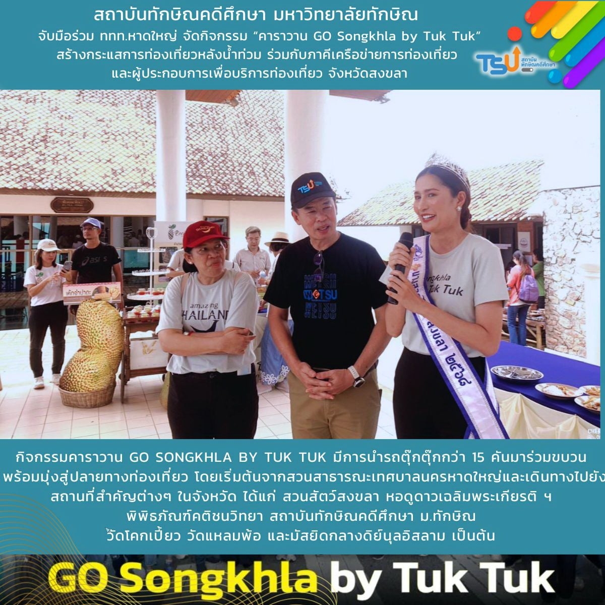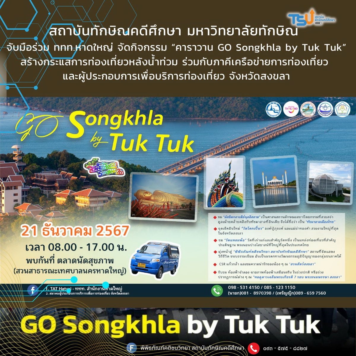 สถาบันทักษิณคดีศึกษา มหาวิทยาลัยทักษิณ ร่วมมือ ททท.หาดใหญ่ จัดกิจกรรม “คาราวาน GO Songkhla by Tuk Tuk” สร้างกระแสส่งเสริมการท่องเที่ยวจังหวัดสงขลา ร่วมกับภาคีเครือข่ายการท่องเที่ยว และผู้ประกอบการเพื่อบริการท่องเที่ยว จังหวัดสงขลา