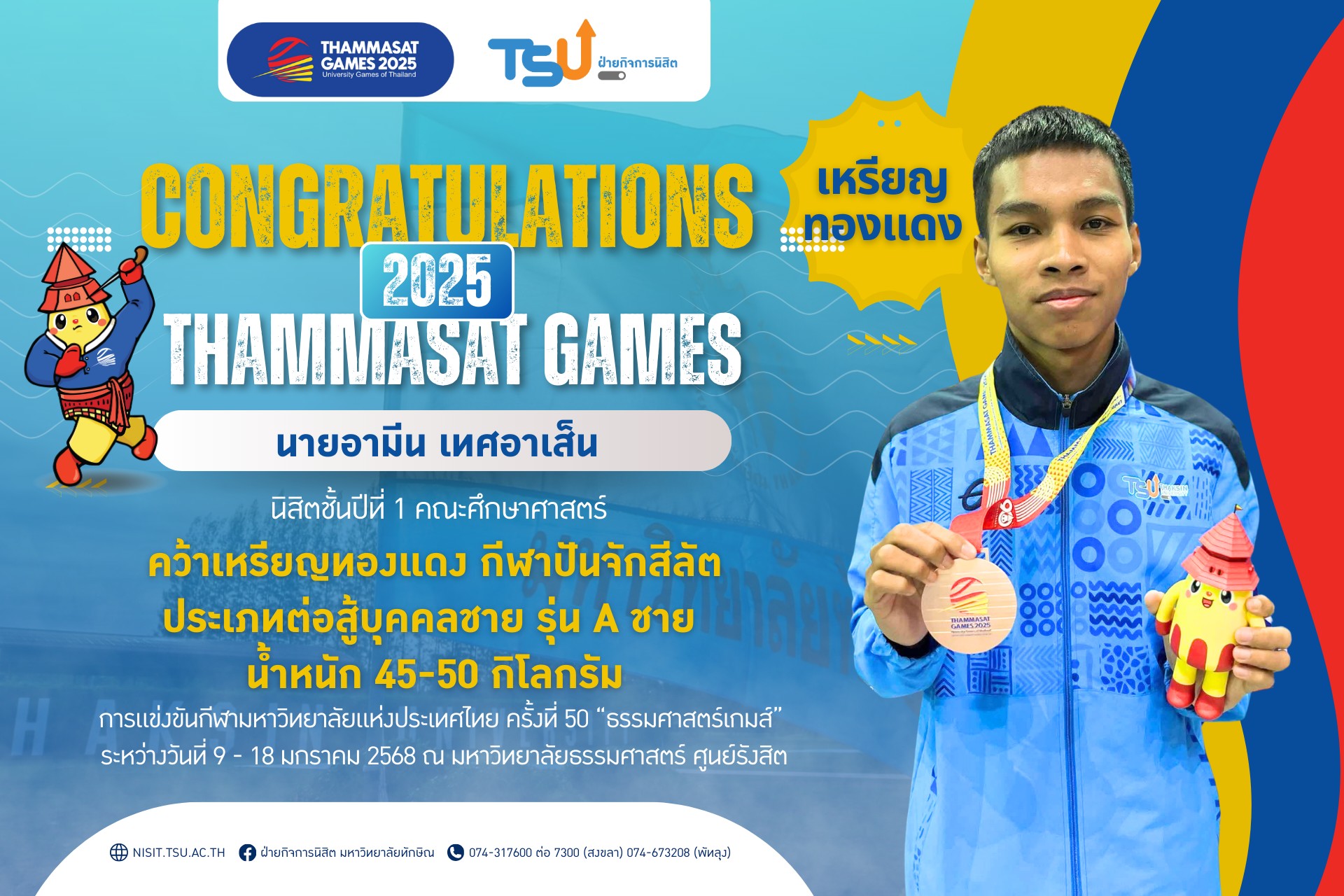 กีฬาปันจักสีลัต ประเภทต่อสู้บุคคลชาย รุ่น A ชาย น้ำหนัก 45-50 กิโลกรัม : นายอามีน เทศอาเส็น นิสิตชั้นปีที่ 1 คณะศึกษาศาสตร์
