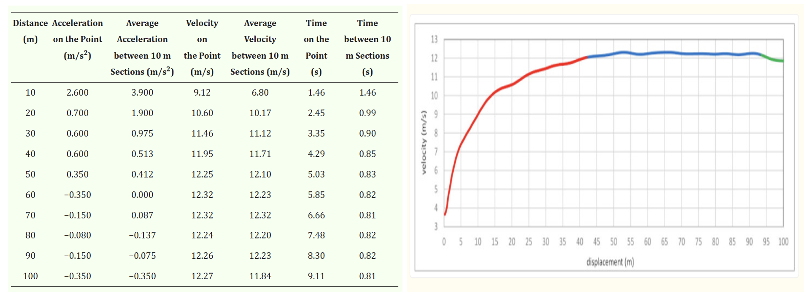 หลังการทำลายสถิติโลกของมนุษย์ที่ได้ชื่อว่าวิ่งเร็วที่สุดในโลก นามยูเซน โบลต์ (Usain Bolt) ในการแข่งขันกรีฑา 100 เมตรชาย ชิงแชมป์โลก ที่ประเทศเยอรมัน เมื่อปี 2009 ด้วยเวลา 9.58 วินาที, ทูเฮค และ คณะ (Stuhec and et al, 2023) ได้ทำการวิเคราะห์จลศาสตร์เฉพาะตัว ที่เน้นความเร็ว พบว่ายูเซน โบลต์ วิ่งทั้งหมด 41 ก้าว น้อยกว่าค่าเฉลี่ยของคู่แข่งถึง 4 ก้าว ความเร็วเฉลี่ยอยู่ที่ 10.44 ม./ วินาที ค่าการเร่งความเร็ว (Acceleration) สูงสุดอยู่ในส่วน 10 เมตรแรก ที่เวลา 3.90 เมตร/ วินาที2 (ตาราง 1) และไปถึงความเร็ว(Velocity สูงสุด ที่ระยะทาง 52.51 ม. ด้วยเวลา 12.33 ม./วินาที ก่อนจะค่อยผ่อนลงเมื่อถึงเส้นชัย (ภาพประกอบ 1)