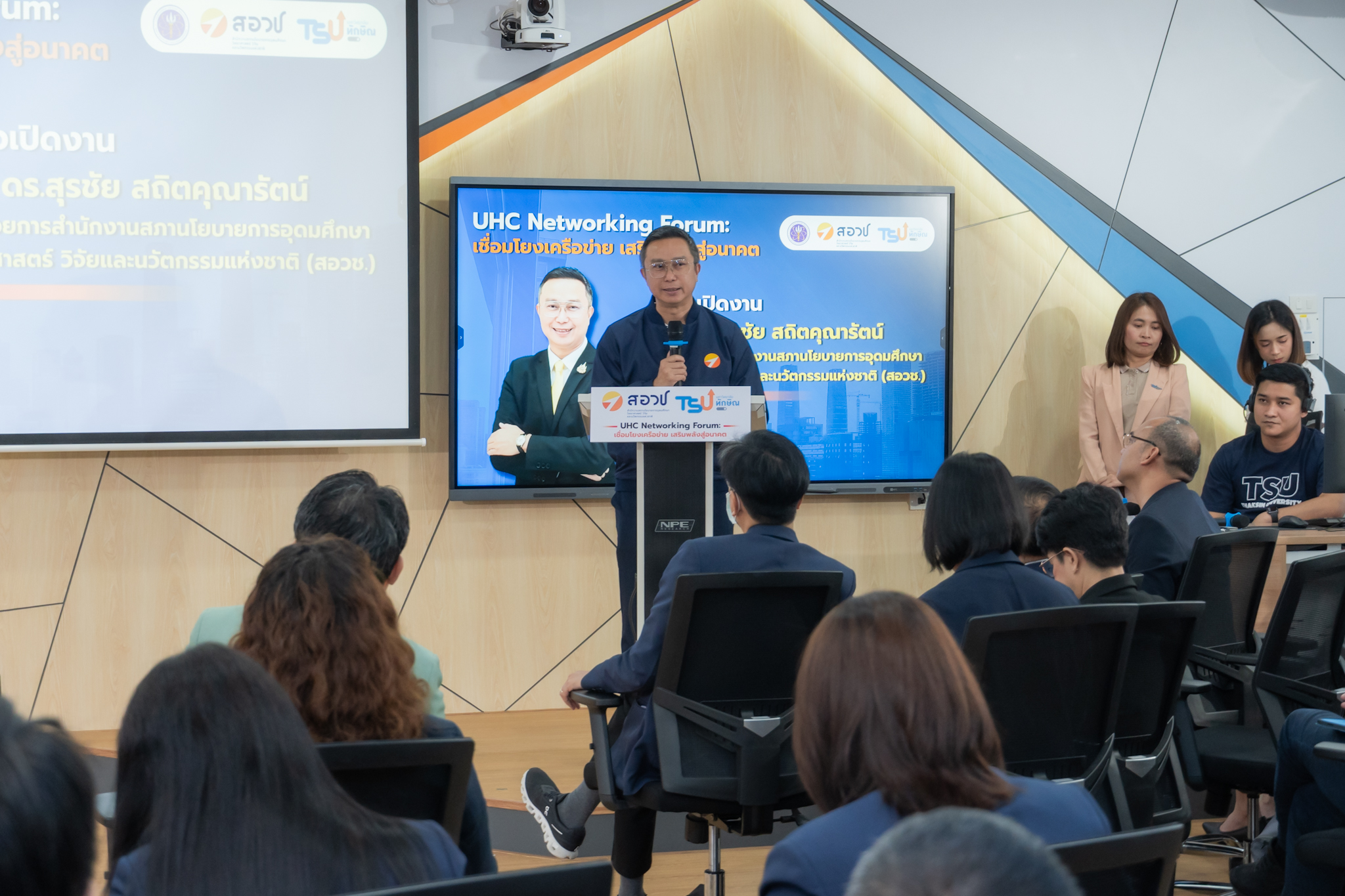 ด้าน ดร.สุรชัย กล่าวว่า กลไก UHC เป็นเครื่องมือสำคัญในการสร้างธุรกิจนวัตกรรม ซึ่ง สอวช. ได้ส่งเสริมผ่านระเบียบสำนักนายกรัฐมนตรีฯ ปี 2566 ปัจจุบันมีมหาวิทยาลัยหลายแห่งจัดตั้ง UHC แล้ว โดยถือเป็นกลไกสำคัญในการสร้างความเชื่อมโยงระหว่างงานวิจัยและภาคเอกชน เพื่อขับเคลื่อนเศรษฐกิจของประเทศ