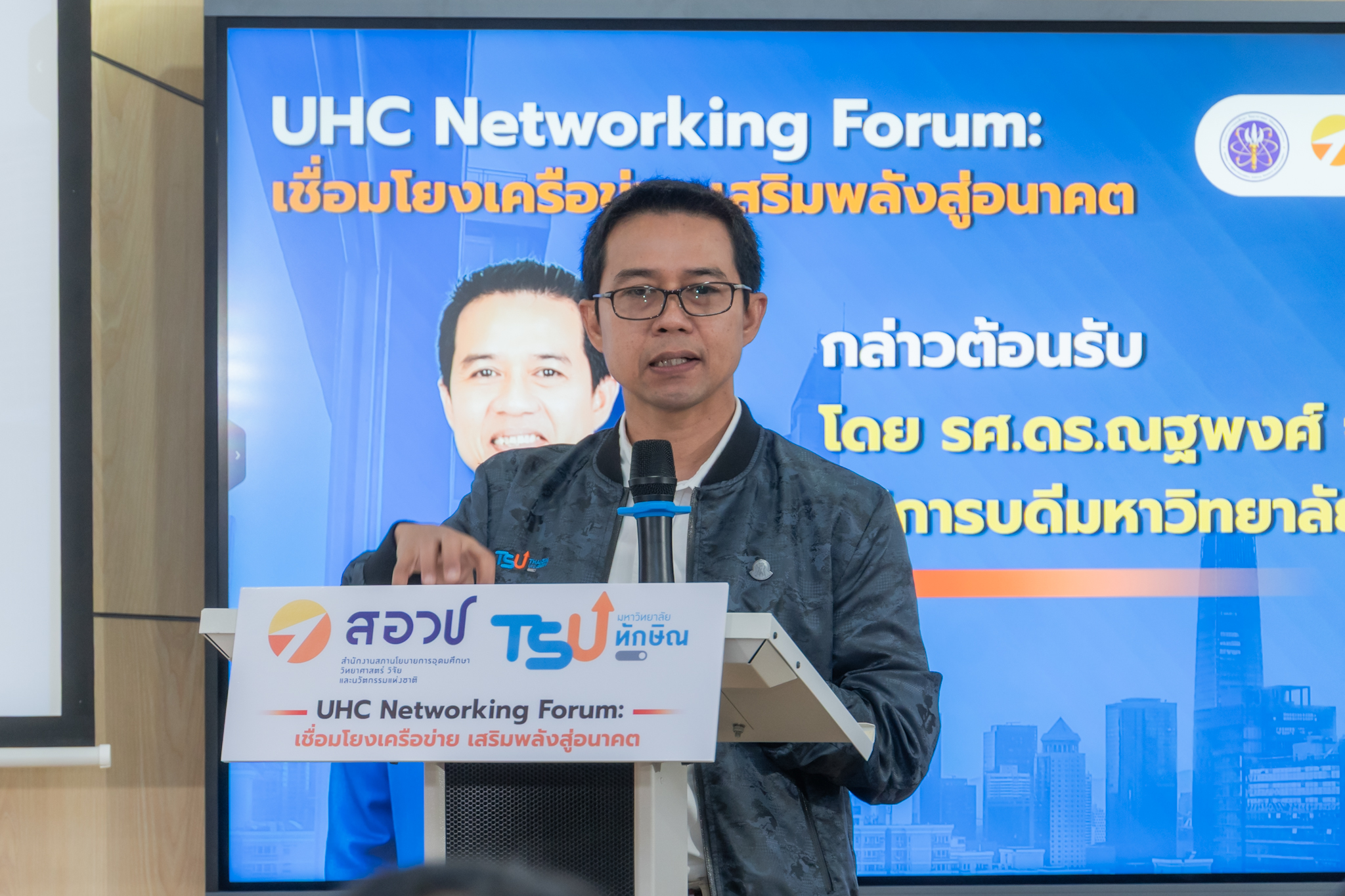 มหาวิทยาลัยทักษิณ ร่วมกับ สำนักงานสภานโยบายการอุดมศึกษา วิทยาศาสตร์ วิจัยและนวัตกรรมแห่งชาติ (สอวช.) จัดประชุม UHC Networking Forum เพื่อเชื่อมโยงเครือข่ายและส่งเสริมความรู้ความเข้าใจเกี่ยวกับกลไก University Holding Company (UHC) ซึ่งเป็นเครื่องมือสำคัญในการผลักดันงานวิจัยและนวัตกรรมสู่เชิงพาณิชย์ ยกระดับเศรษฐกิจนวัตกรรมของประเทศ