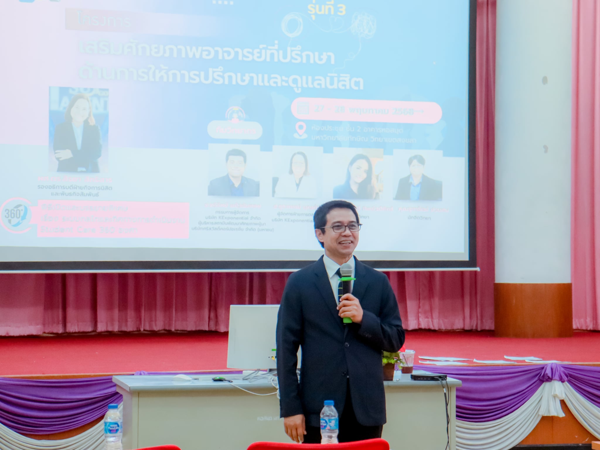 การอบรมในครั้งนี้จัดขึ้นระหว่างวันที่ 27 – 28 พฤษภาคม 2568 ประกอบด้วยการบรรยายพิเศษหัวข้อ "ระบบกลไกและทิศทางการดำเนินงาน Student Care 360 องศา" โดย ผู้ช่วยศาสตราจารย์ ดร.สิรยา สิทธิสาร รองอธิการบดีฝ่ายกิจการนิสิตและพันธกิจสัมพันธ์ มหาวิทยาลัยทักษิณ ที่มุ่งเน้นให้เห็นภาพรวมของการดูแลนิสิตแบบองค์รวม ทั้งระบบสนับสนุน กลไกดำเนินงาน และทิศทางการพัฒนา