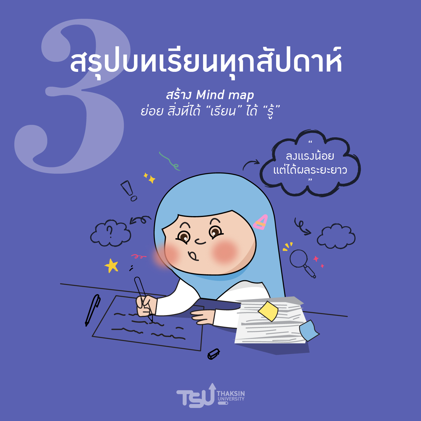 เรียนไปเรื่อย ๆ ไม่ใช่เรื่องยาก แต่ “ทบทวนไปเรื่อย ๆ” นี่แหละคือไม้เด็ด... ลองจัดเวลาแค่สัปดาห์ละ 1 ครั้ง เช่น ทุกเย็นวันศุกร์หรือบ่ายวันอาทิตย์ เพื่อสรุป ย่อย สิ่งที่ได้ “เรียน” และ ได้ “รู้” ในสัปดาห์นั้นลงสมุด หรือทำ mind map จะช่วยให้ไม่หลงลืม และทำให้เข้าใจเนื้อหาแบบยาวๆ ไม่ใช่แค่จำสั้นๆ แถมยังเก็บไว้อ่านทบทวนเมื่อถึงฤดูกาลสอบ