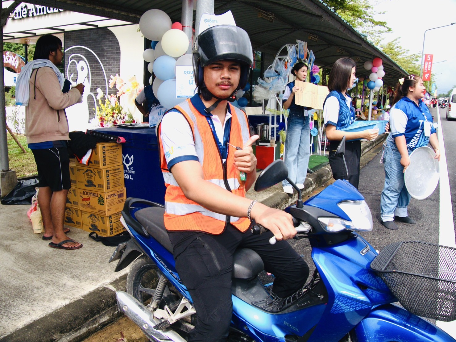 และแล้ว…ก็ปรากฏร่างของหนุ่มวินมอเตอร์ไซค์ในเสื้อสีส้มแปร๊ด พร้อมคำถามสุดคลาสสิก... “ให้พี่ไปส่งไหมน้อง?” เขาคือ วุฒติชัย จันทร์แก้ว (นิ) นิสิตปี 2 คณะนิติศาสตร์ ผู้ที่อาสานำรถมอเตอร์ไซค์ส่วนตัวมาวิ่งรับ-ส่งฟรีแก่ทุกคนในงาน ผ่านโครงการน่ารักน่าเอ็นดูที่ชื่อว่า “องค์การ พัทลุง แง๊นๆ”