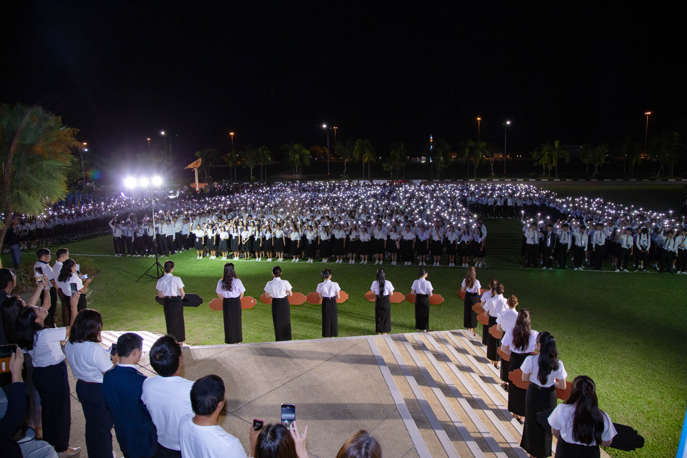 บรรยากาศเริ่มต้นขึ้นเมื่อพระอาทิตย์ลาลับขอบฟ้า เวลา 18.00 น. นิสิตชั้นปีที่ 1 พร้อมใจกันรวมตัว ณ ลานหน้าเสาธง ร่วมกันร้องเพลงชาติไทยอย่างพร้อมเพรียง จากนั้นขบวนเกียรติยศแห่งความภาคภูมิใจได้เริ่มต้นขึ้น นิสิตเดินลอดซุ้มริ้วธงของมหาวิทยาลัยอย่างสง่างาม มุ่งหน้าสู่ลานกิจกรรมหน้าอาคารหอประชุมเฉลิมพระเกียรติ ก่อนจะร่วมกันแปรอักษรเป็นคำว่า “TSU 68” สะท้อนพลังของนิสิตรุ่นใหม่ที่เต็มเปี่ยมด้วยจิตวิญญาณแห่งความเป็นทักษิณ