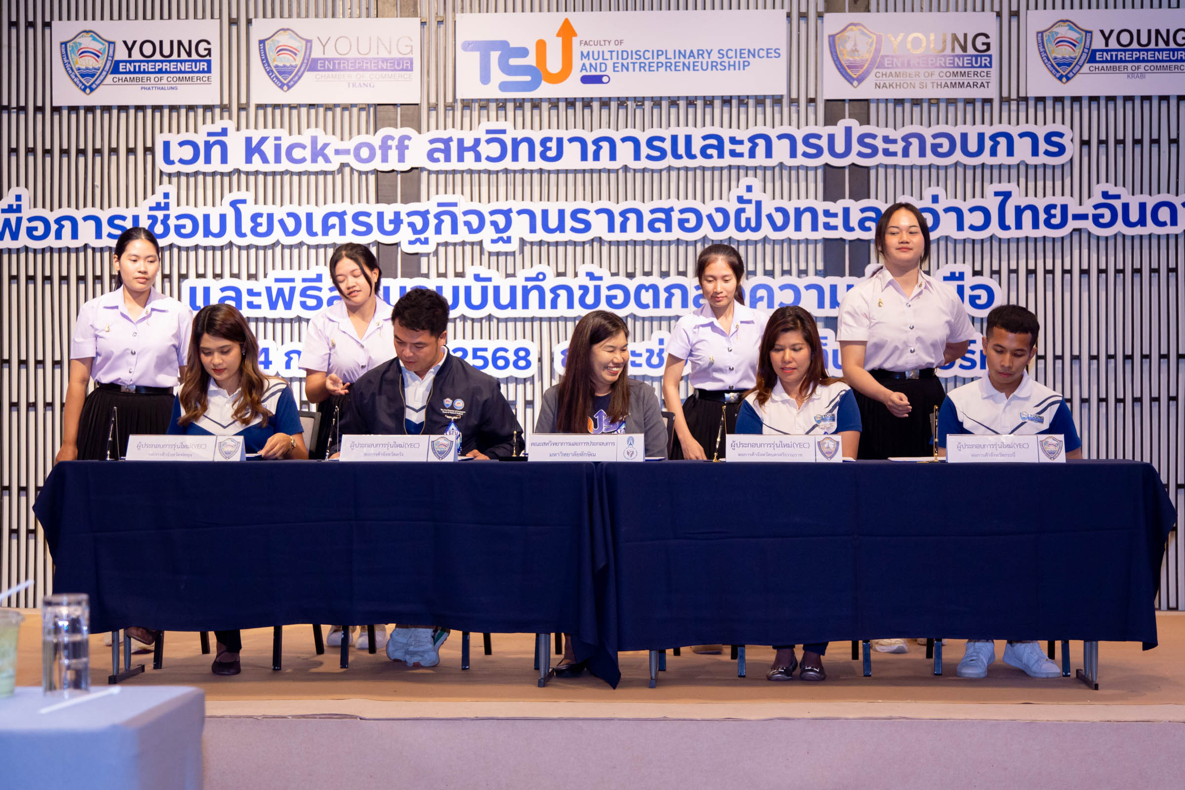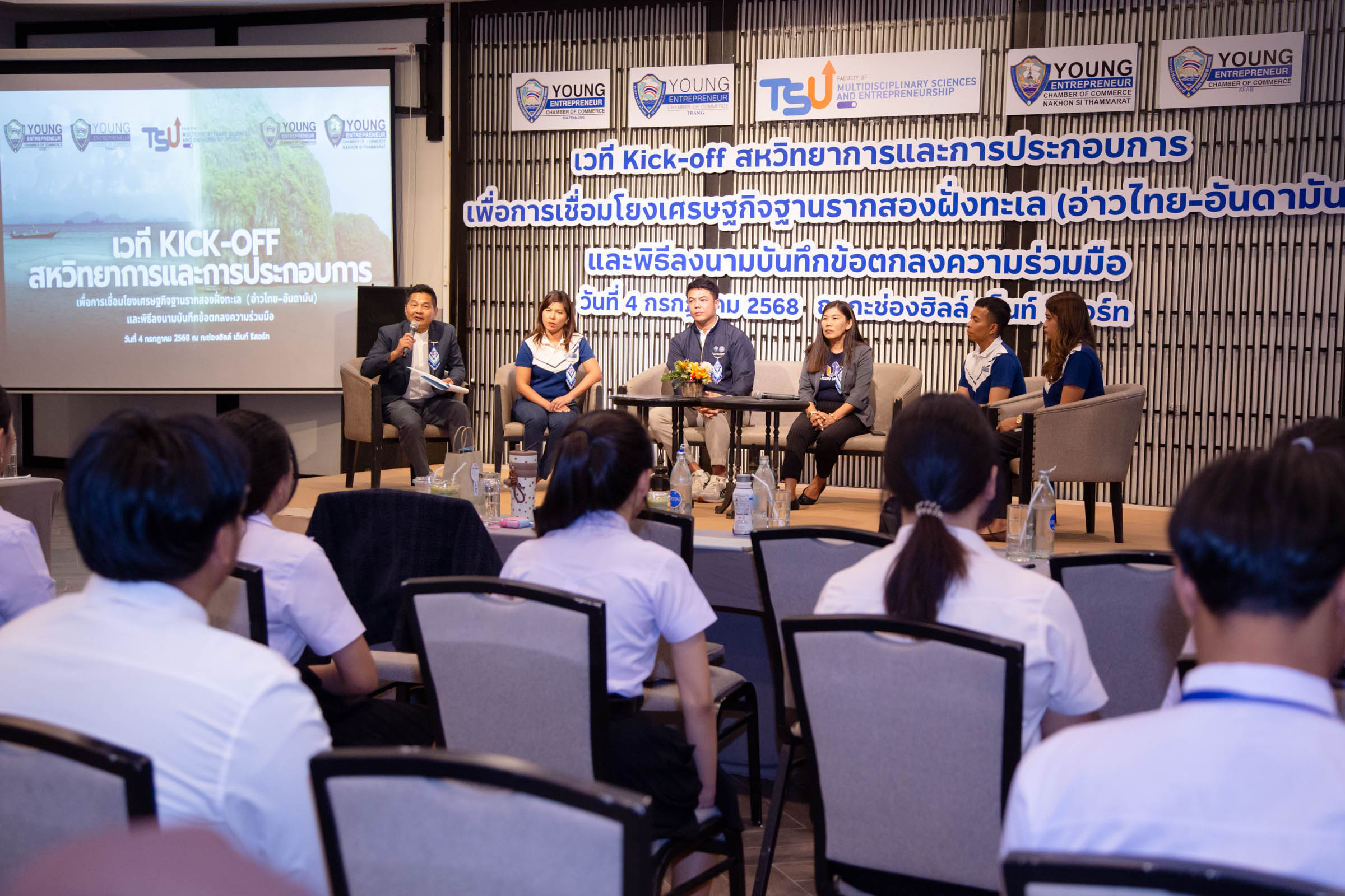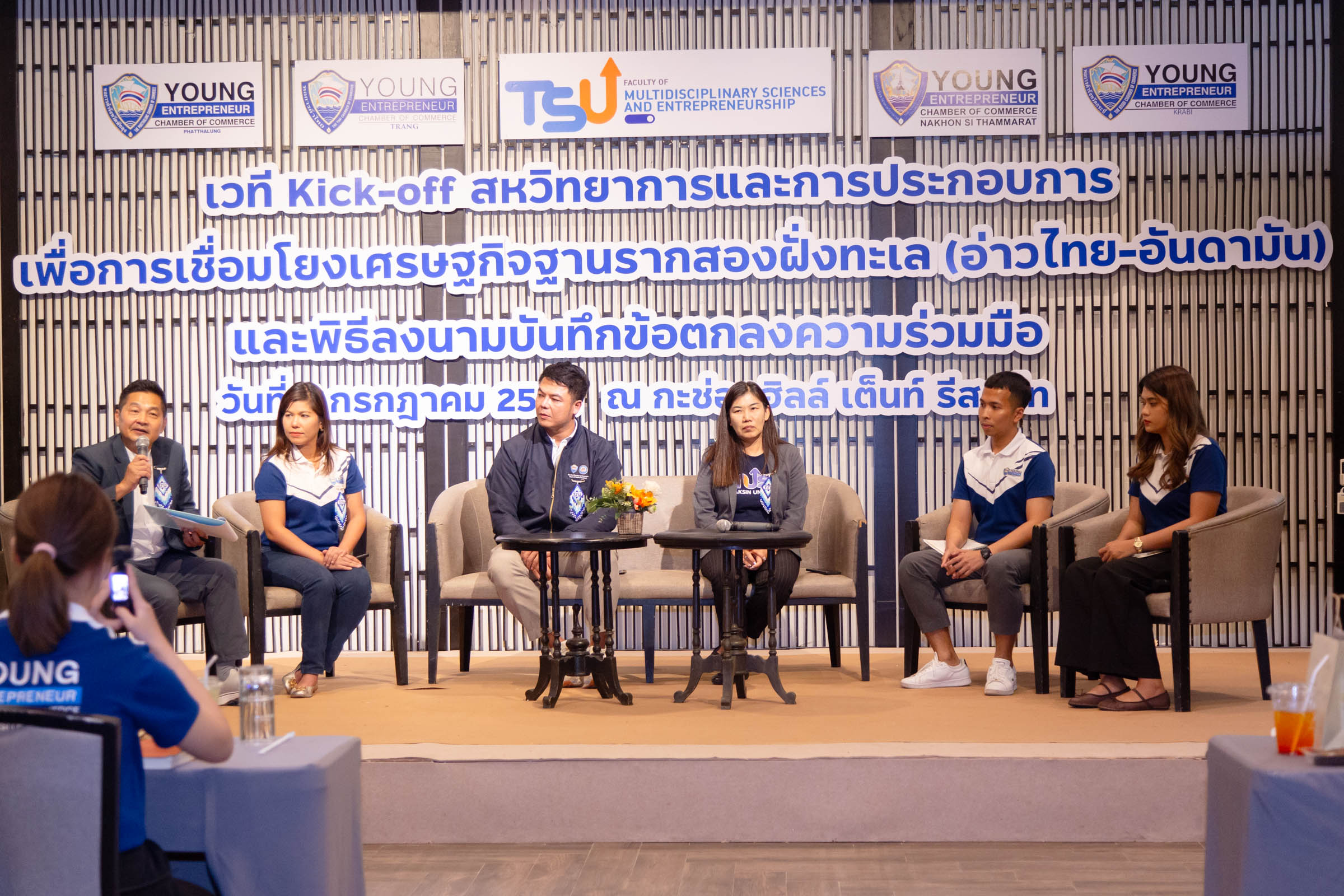 คณะสหวิทยาการและการประกอบการ มหาวิทยาลัยทักษิณ จัดเวที Kick-off “TSU MuSE x 4 YEC” สร้างเครือข่าย TGA CONNEXT ผนึกกำลังผู้ประกอบการรุ่นใหม่ 4 จังหวัดภาคใต้ สร้างเครือข่ายพัฒนาเศรษฐกิจฐานรากสองฝั่งทะเลอ่าวไทย-อันดามัน ณ กะช่องฮิลล์ เต็นท์ รีสอร์ท จังหวัดตรัง มุ่งยกระดับกำลังคนและธุรกิจนวัตกรรม พร้อมเปิดเวทีเสวนาและลงนามความร่วมมือระหว่างภาคการศึกษาและภาคธุรกิจเพื่ออนาคตเศรษฐกิจใต้ที่เข้มแข็งและยั่งยืน