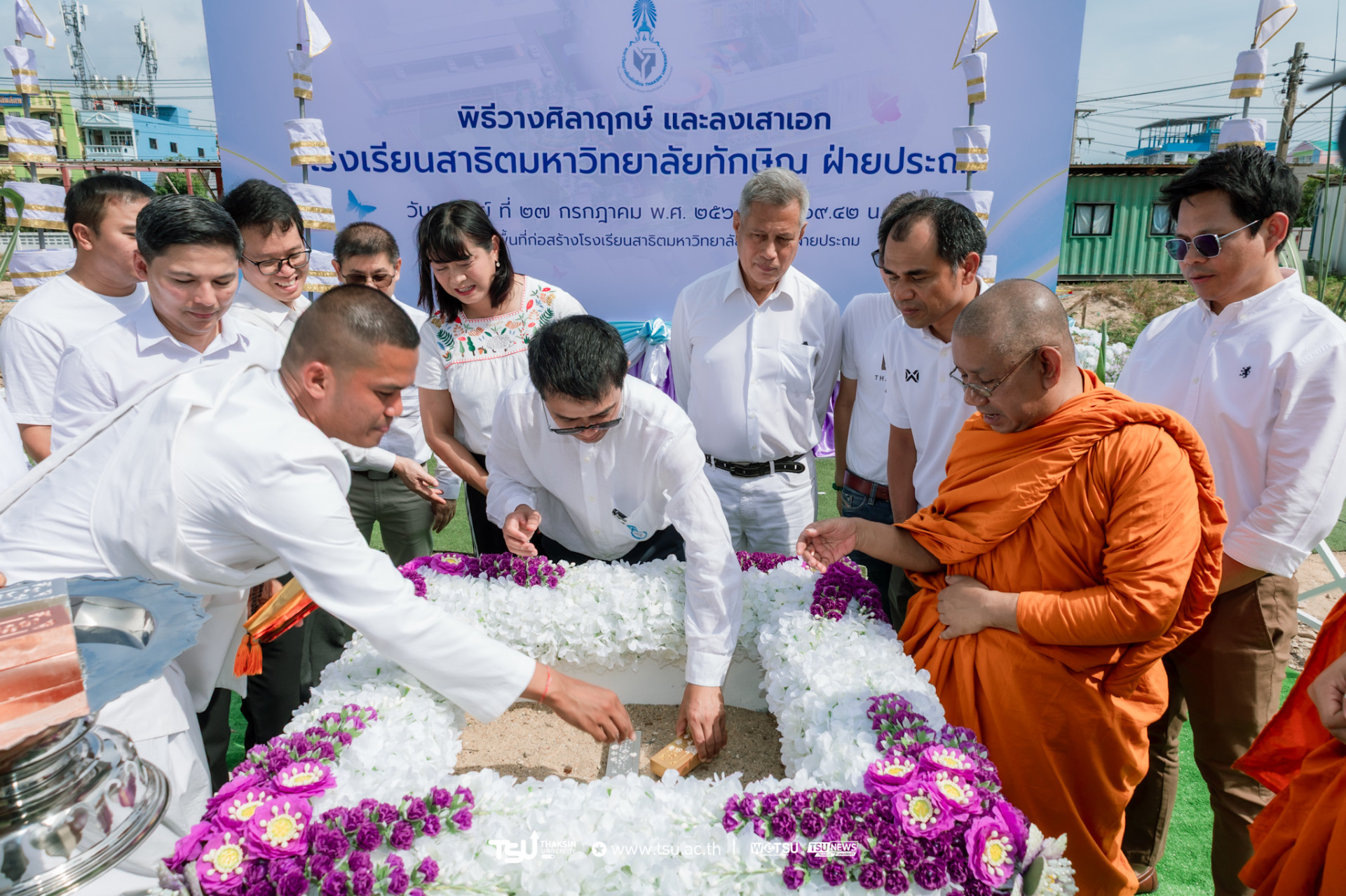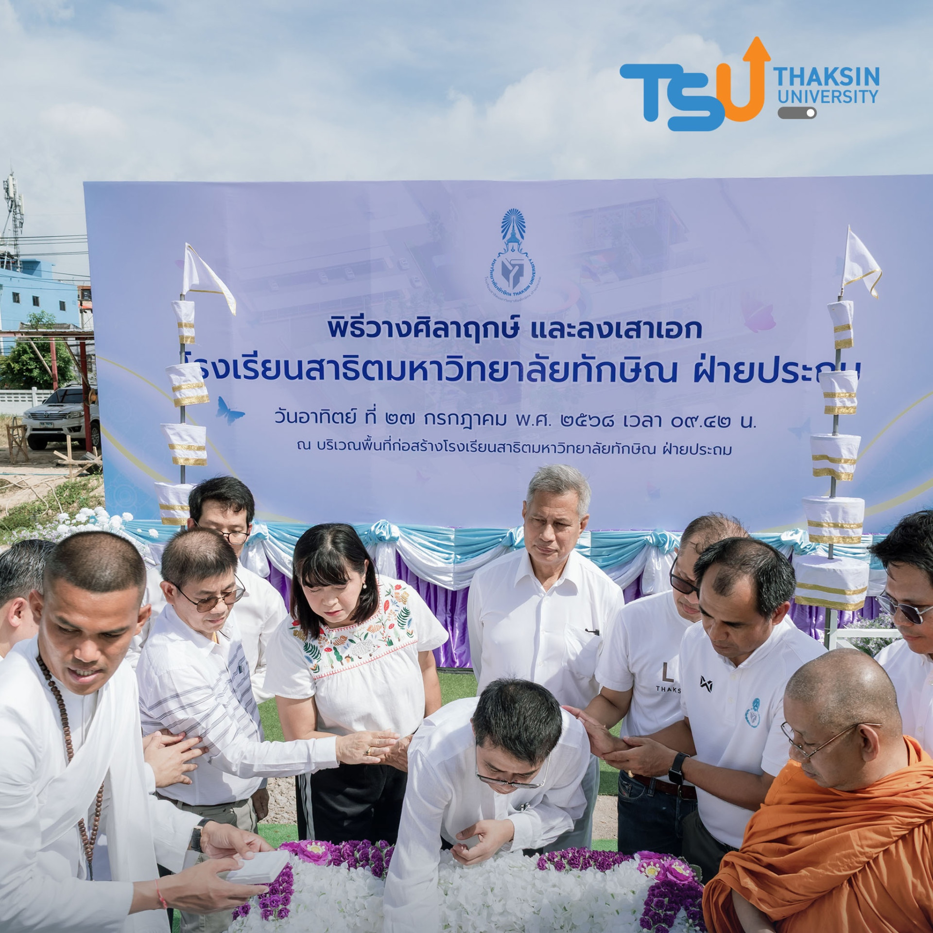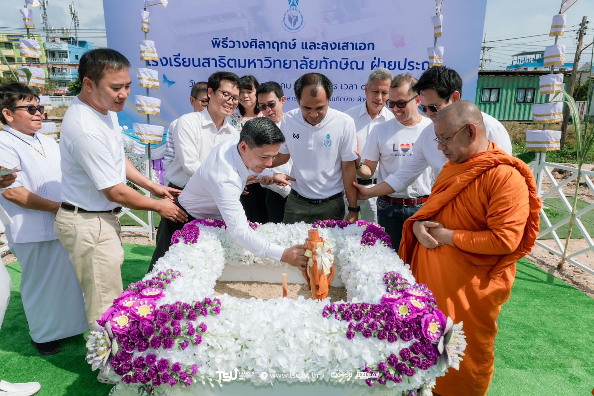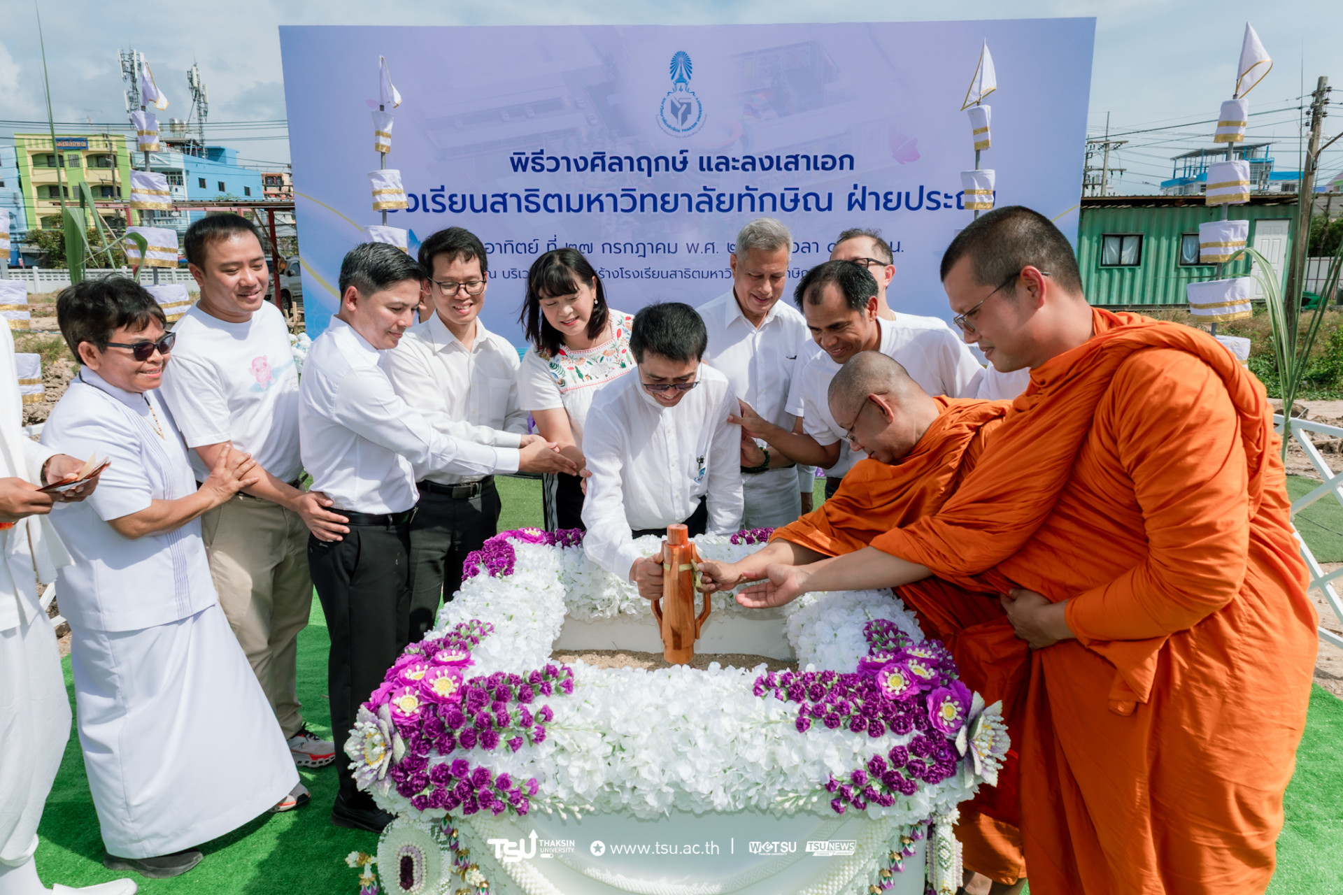 โรงเรียนสาธิตมหาวิทยาลัยทักษิณ ฝ่ายประถม จัดพิธีวางศิลาฤกษ์และลงเสาเอก เพื่อความเป็นสิริมงคลมงคลในการก่อสร้าง