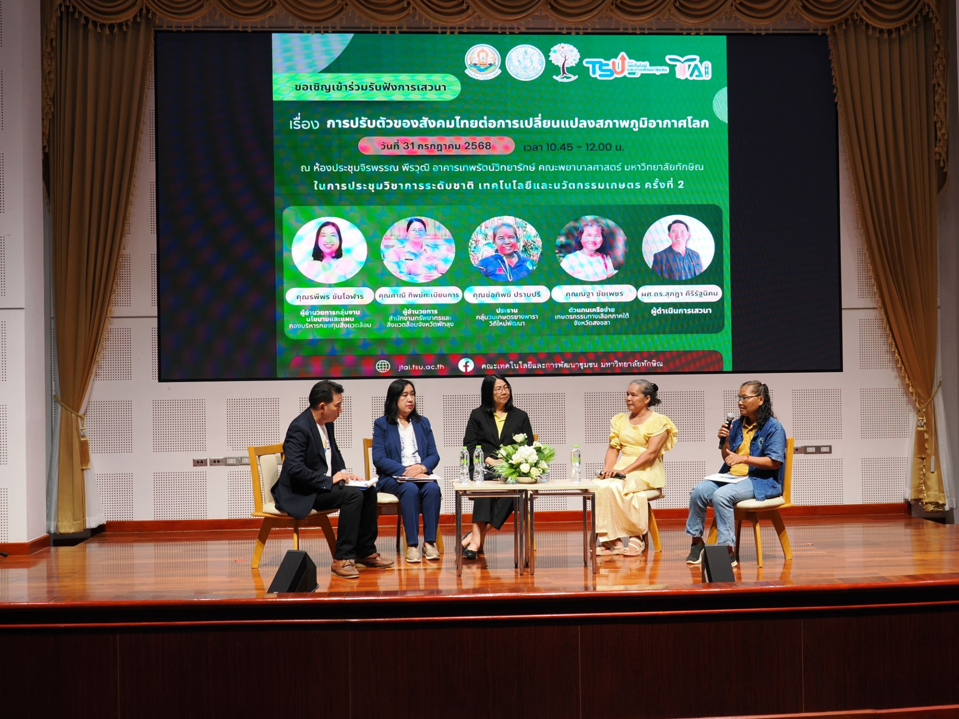 วันที่ 31 กรกฎาคม 2568 ณ ห้องประชุมจิรพรรณ พีรวุฒิ อาคารเทพรัตน์วิทยารักษ์ ชั้น 1 คณะพยาบาลศาสตร์ มหาวิทยาลัยทักษิณ วิทยาเขตพัทลุง ผู้ช่วยศาสตราจารย์ ดร.ธัญญา พันธ์ฤทธิ์ดำ รองอธิการบดีวิทยาเขตพัทลุง เป็นประธานพิธีเปิดงานการประชุมวิชาการระดับชาติ “เทคโนโลยีและนวัตกรรมการเกษตร” ครั้งที่ 2 TAI 2025 : The 2nd National Conference of Technology and Agricultural Innovation ระหว่างวันที่ 31 กรกฎาคม – 1 สิงหาคม 2568 และฟังการบรรยายพิเศษในหัวข้อ “แนวทางการสนับสนุนเงินกองทุนสิ่งแวดล้อม ด้านการเปลี่ยนแปลงสภาพภูมิอากาศ” โดยนางรพีพร ขันโอฬาร ผู้อำนวยการกลุ่มงานนโยบายและแผน กองบริหารกองทุนสิ่งแวดล้อม ต่อจากนั้นเป็นการเสวนาในหัวข้อ “การปรับตัวของสังคมไทยต่อการเปลี่ยนแปลงสภาพภูมิอากาศโลก” โดยมีผู้ร่วมเสวนา ได้แก่