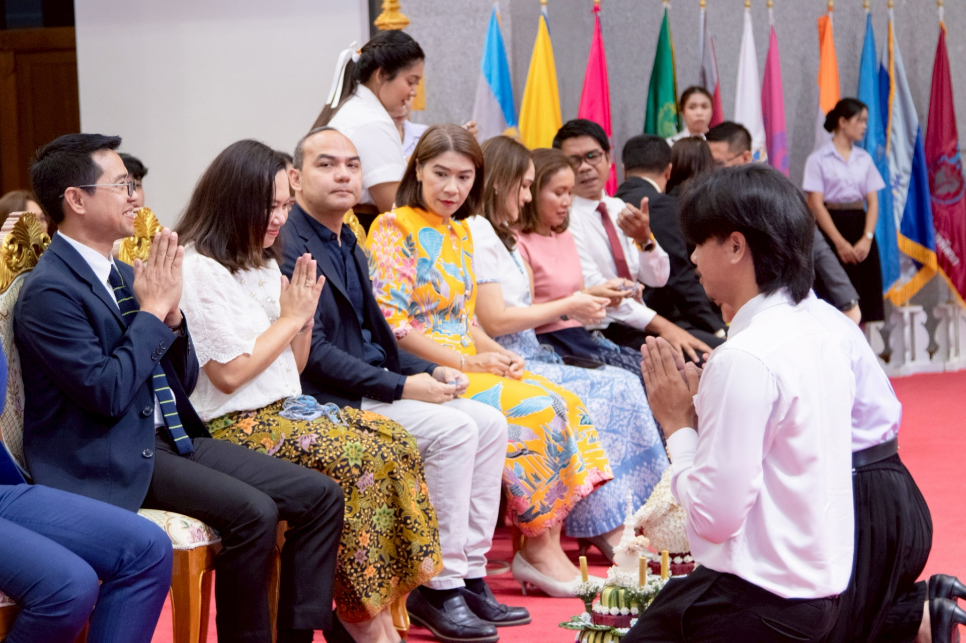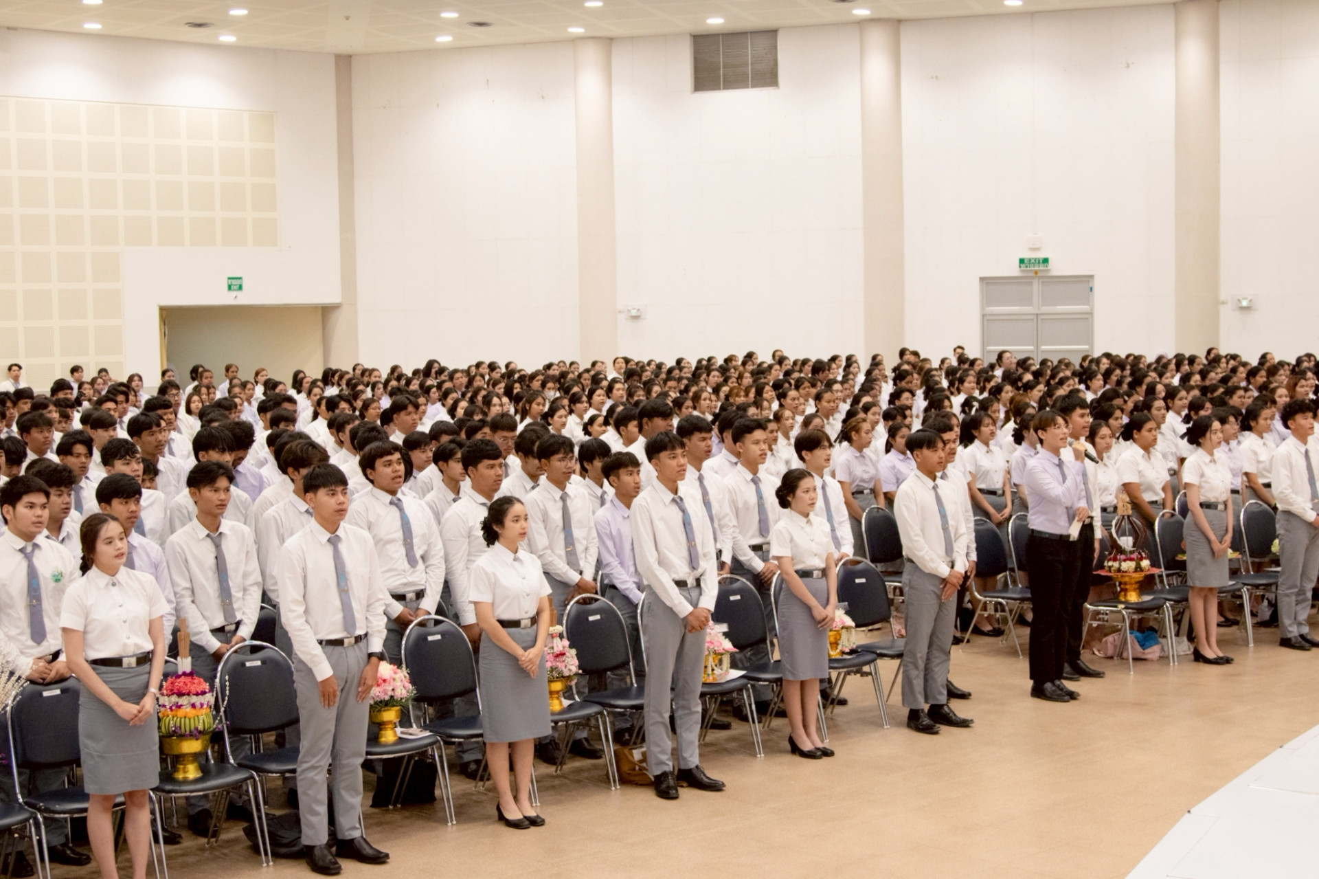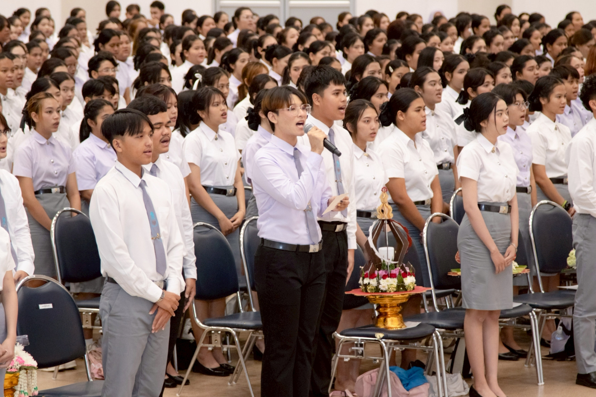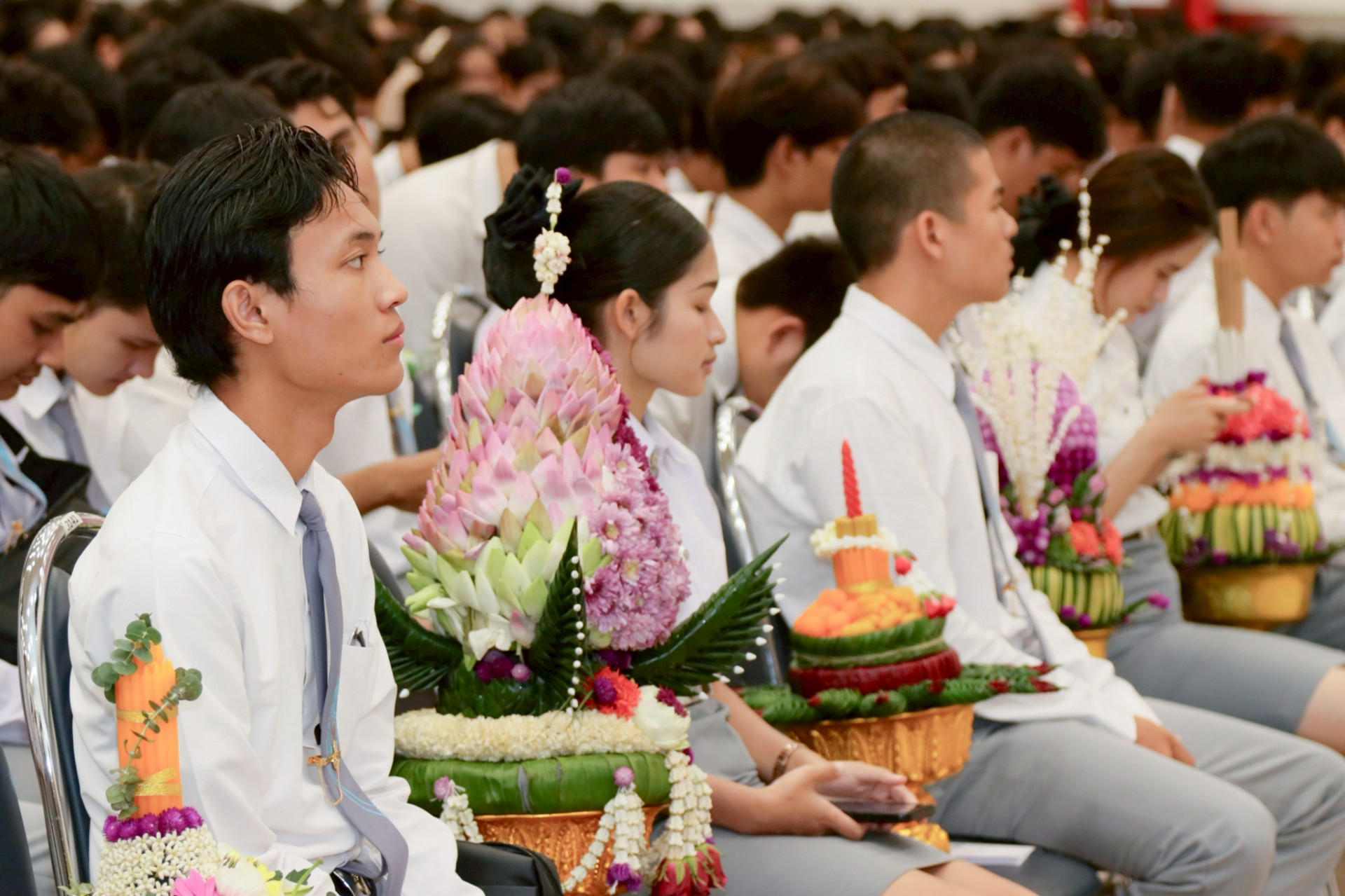 พิธีเริ่มต้นด้วยความสงบ งดงาม และเปี่ยมไปด้วยความหมาย นิสิตชั้นปีที่ 1 พร้อมใจกันแต่งกายด้วยชุดพิธีการ ขณะเดียวกัน คณาจารย์ร่วมงานด้วยชุดผ้าไทย บรรยากาศในหอประชุมเฉลิมพระเกียรติอบอวลไปด้วยความเคารพและศรัทธา