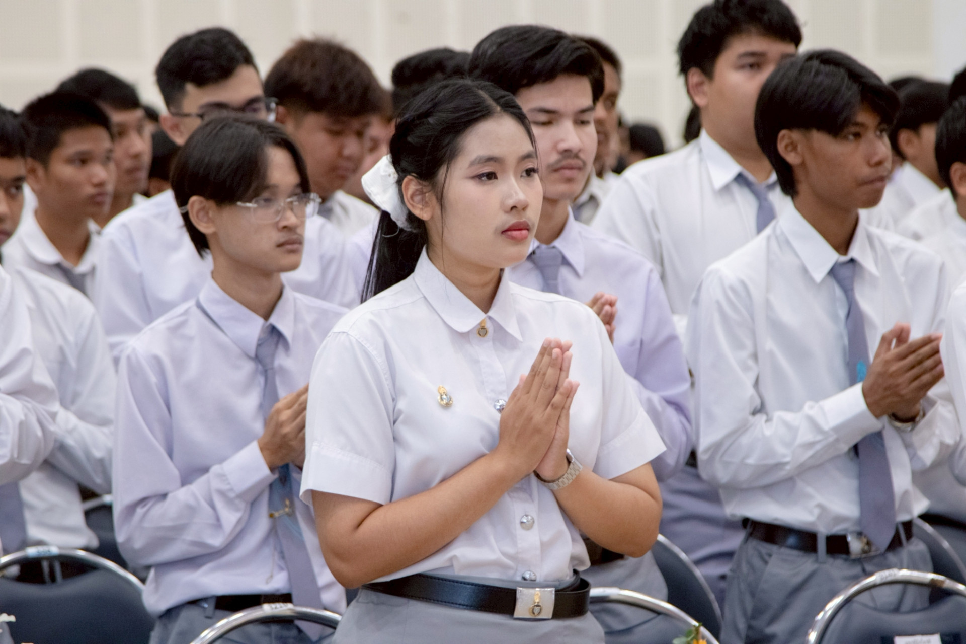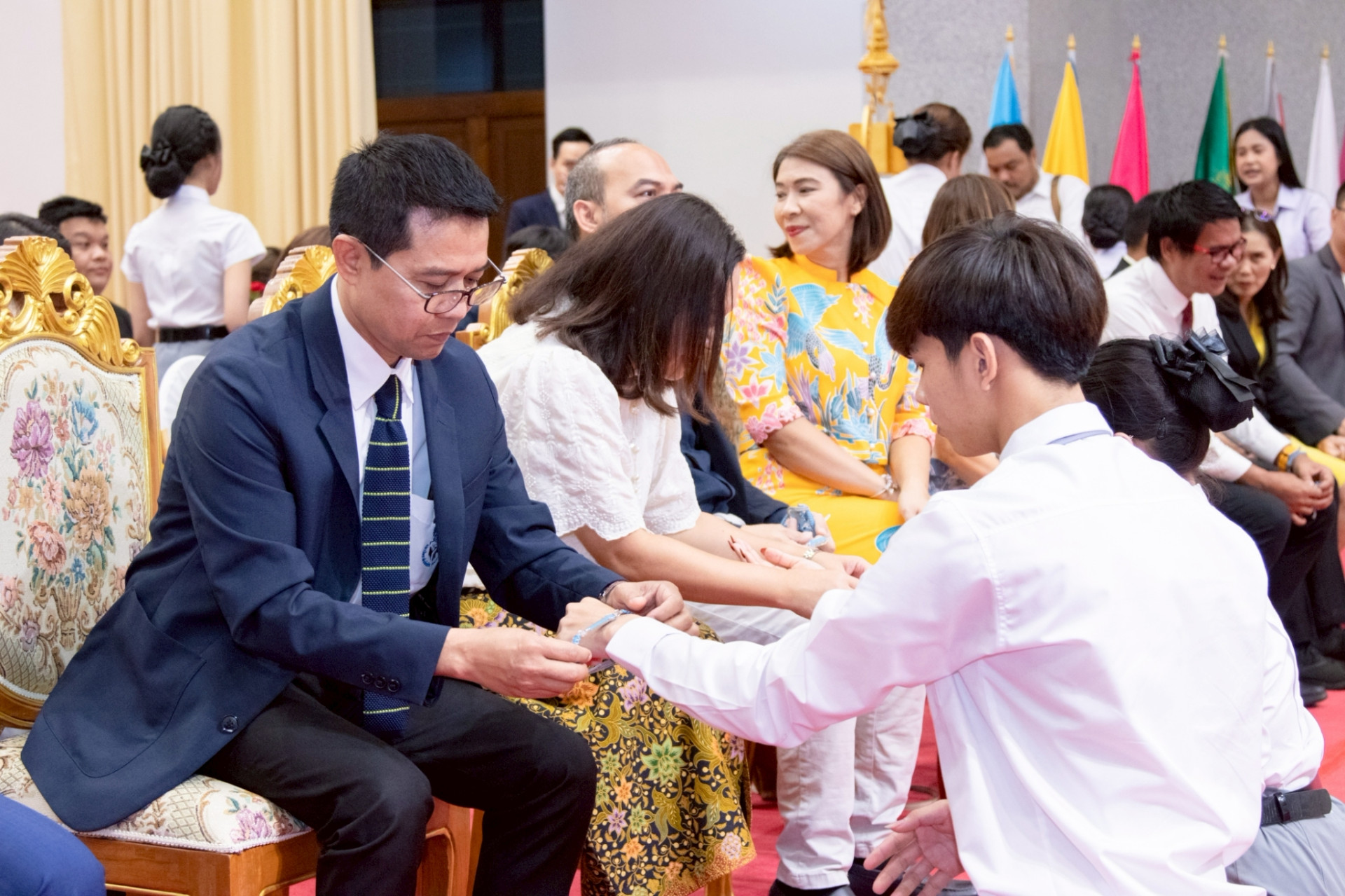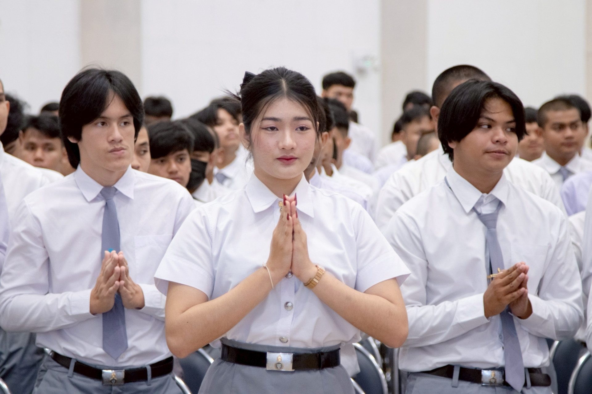 พิธีเริ่มต้นด้วยความสงบ งดงาม และเปี่ยมไปด้วยความหมาย นิสิตชั้นปีที่ 1 พร้อมใจกันแต่งกายด้วยชุดพิธีการ ขณะเดียวกัน คณาจารย์ร่วมงานด้วยชุดผ้าไทย บรรยากาศในหอประชุมเฉลิมพระเกียรติอบอวลไปด้วยความเคารพและศรัทธา