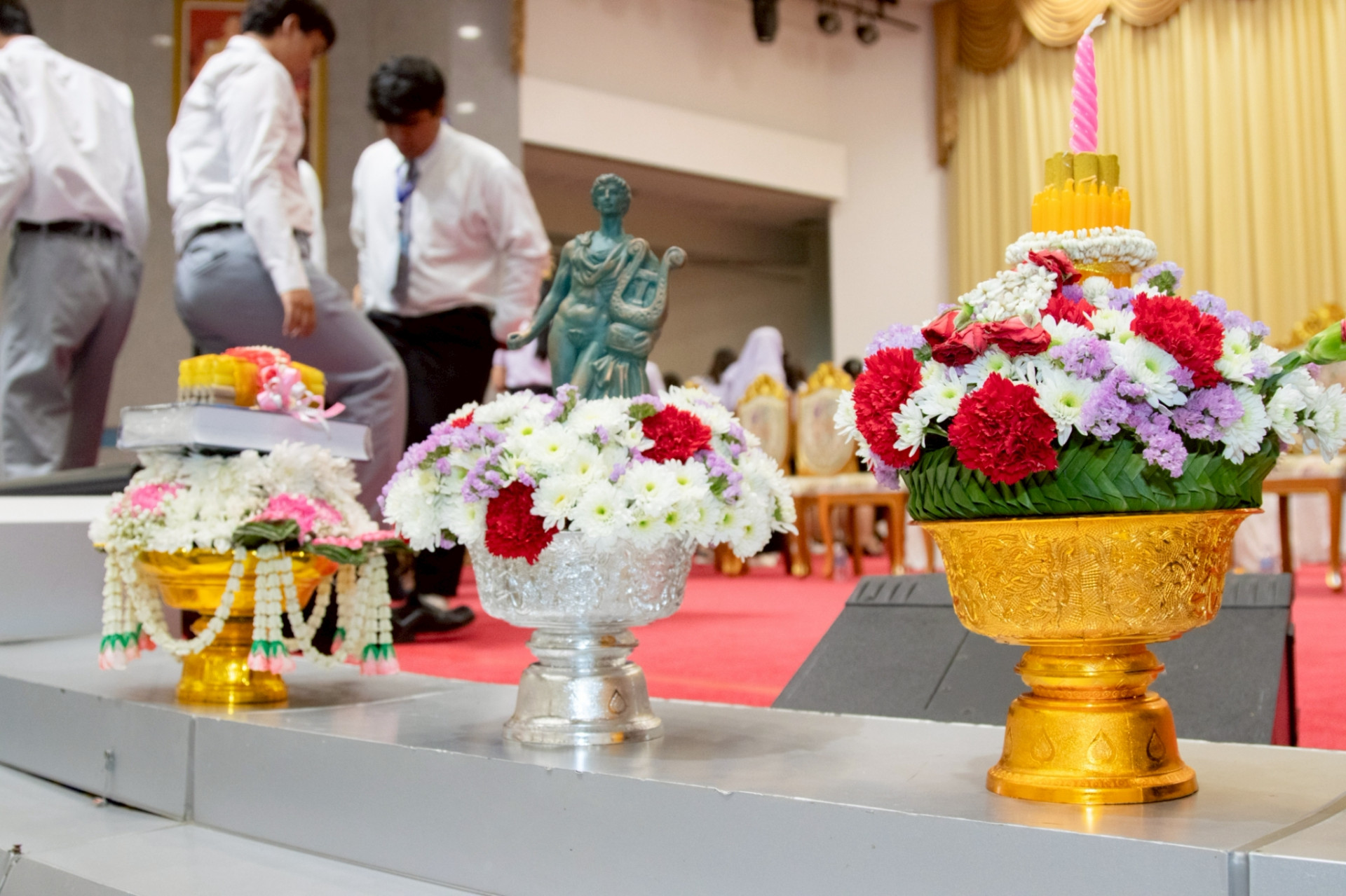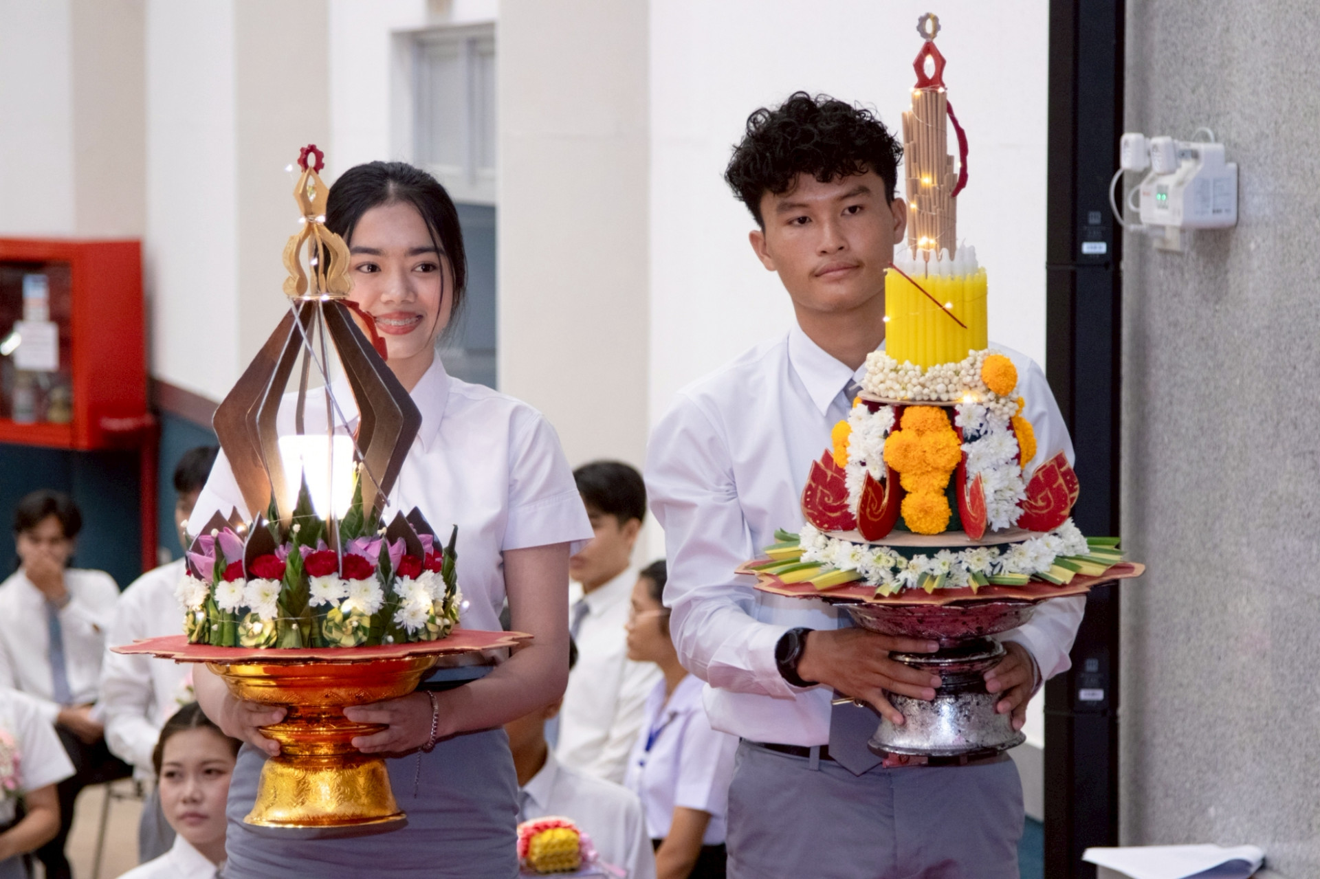 รศ.ดร.ณฐพงศ์ จิตรนิรัตน์ อธิการบดีมหาวิทยาลัยทักษิณ ประธานในพิธีจุดเทียนบูชาพระรัตนตรัย และเจิมสื่อการเรียนการสอน ถือเป็นการเริ่มต้นพิธีอย่างเป็นทางการ นิสิตร่วมกันร้องเพลง “ไหว้ครู” ด้วยน้ำเสียงที่กังวาน สะท้อนถึงความตั้งใจในการมอบตนเป็นศิษย์อย่างแท้จริง