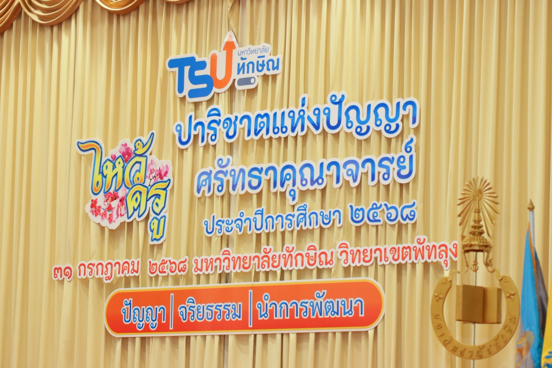 มหาวิทยาลัยทักษิณ วิทยาเขตพัทลุง โดยฝ่ายกิจการนิสิต และองค์การนิสิต วิทยาเขตพัทลุง จัดพิธีไหว้ครู “ปาริชาตแห่งปัญญา ศรัทธาคุณาจารย์” เพื่อสืบสานประเพณีอันดีงามของไทย ตอกย้ำสายสัมพันธ์อันแน่นแฟ้นระหว่างลูกศิษย์กับครู และเป็นการแสดงความกตัญญูกตเวทีต่อคณาจารย์ เมื่อวันที่ 31 กรกฎาคม 2568 ณ หอประชุมเฉลิมพระเกียรติ