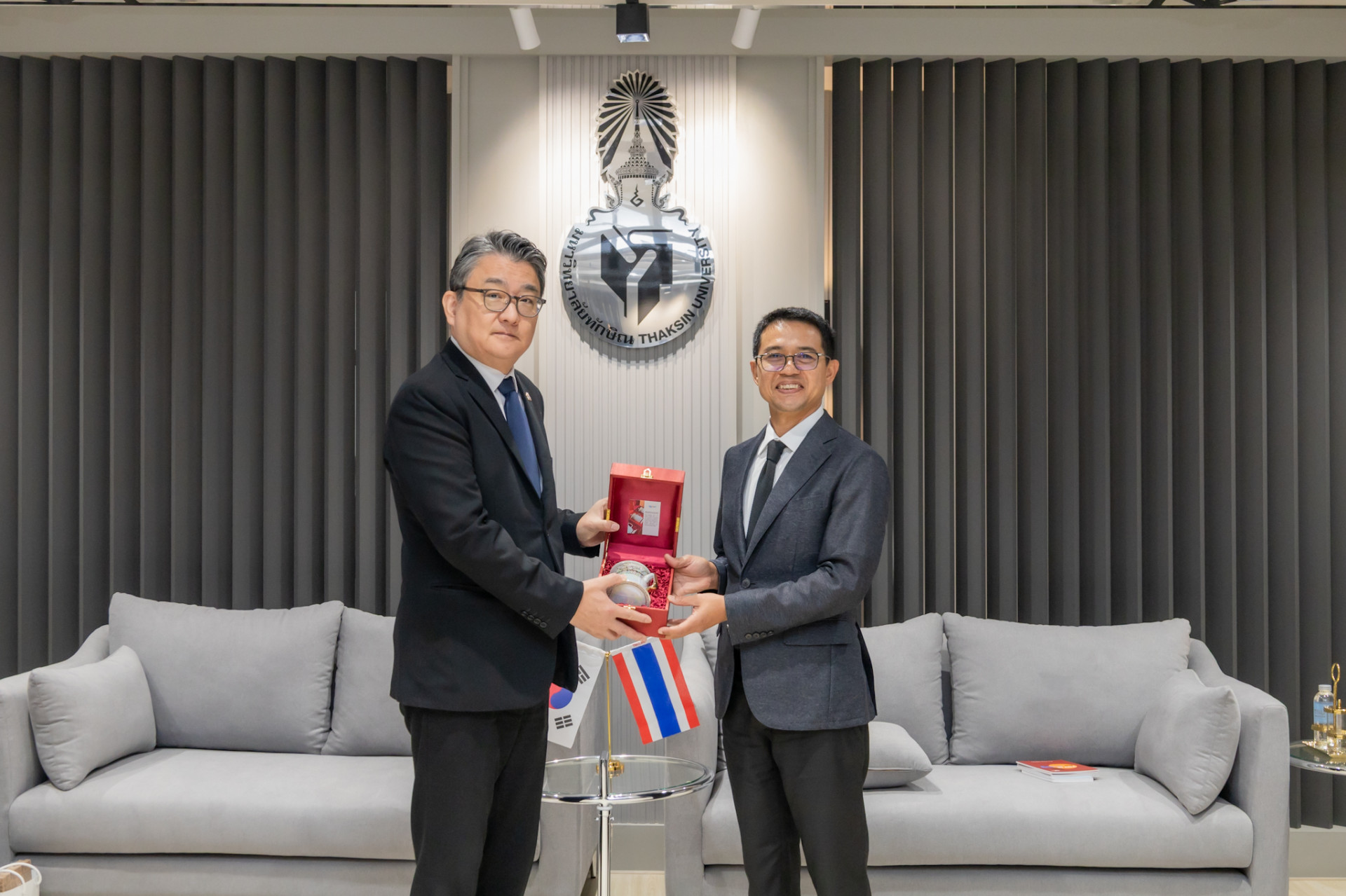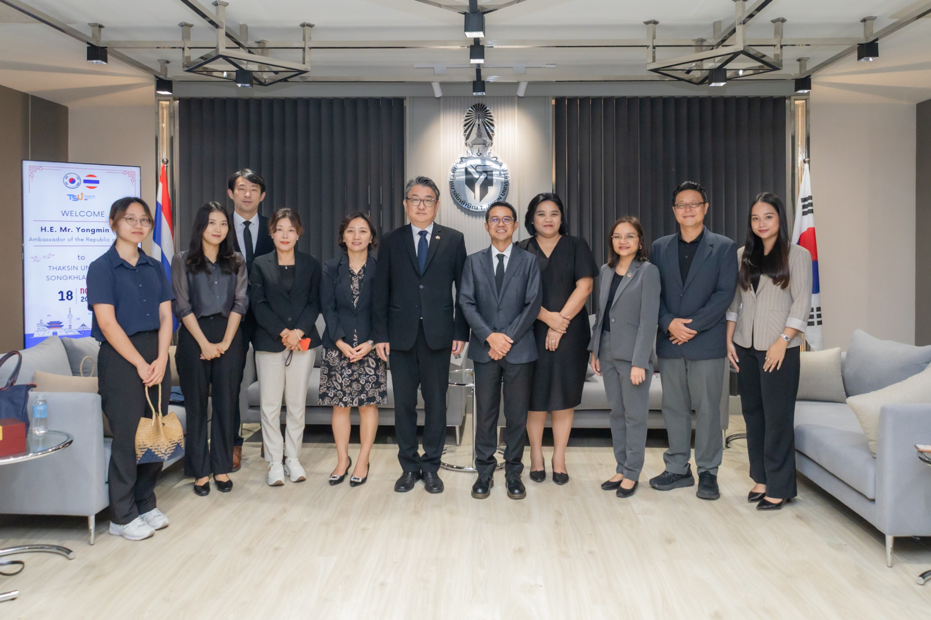 วันที่ 18 พฤศจิกายน 2568 มหาวิทยาลัยทักษิณ วิทยาเขตสงขลา ต้อนรับคณะผู้แทนจากสถานเอกอัครราชทูตสาธารณรัฐเกาหลีประจำประเทศไทย นำโดย H.E. Yongmin Park เอกอัครราชทูตสาธารณรัฐเกาหลี ในโอกาสเดินทางเยือนมหาวิทยาลัยเพื่อหารือความร่วมมือด้านการศึกษา วัฒนธรรม และแนวทางการสร้างเครือข่ายวิชาการร่วมกัน โดยมีรองศาสตราจารย์ ดร. ณฐพงศ์ จิตรนิรัตน์ อธิการบดีมหาวิทยาลัยทักษิณให้การต้อนรับ พร้อมแลกเปลี่ยนมุมมองเกี่ยวกับการพัฒนาความร่วมมือด้านการศึกษา การวิจัย และกิจกรรมทางวัฒนธรรมระหว่างสองประเทศ รวมทั้งแนวทางขยายความร่วมมือในอนาคต ไม่ว่าจะเป็นการแลกเปลี่ยนนักศึกษา การร่วมผลิตองค์ความรู้ และกิจกรรมเชื่อมโยง Soft Power ที่สามารถผลักดันให้เกิดประโยชน์ต่อสังคมไทยและเกาหลีใต้