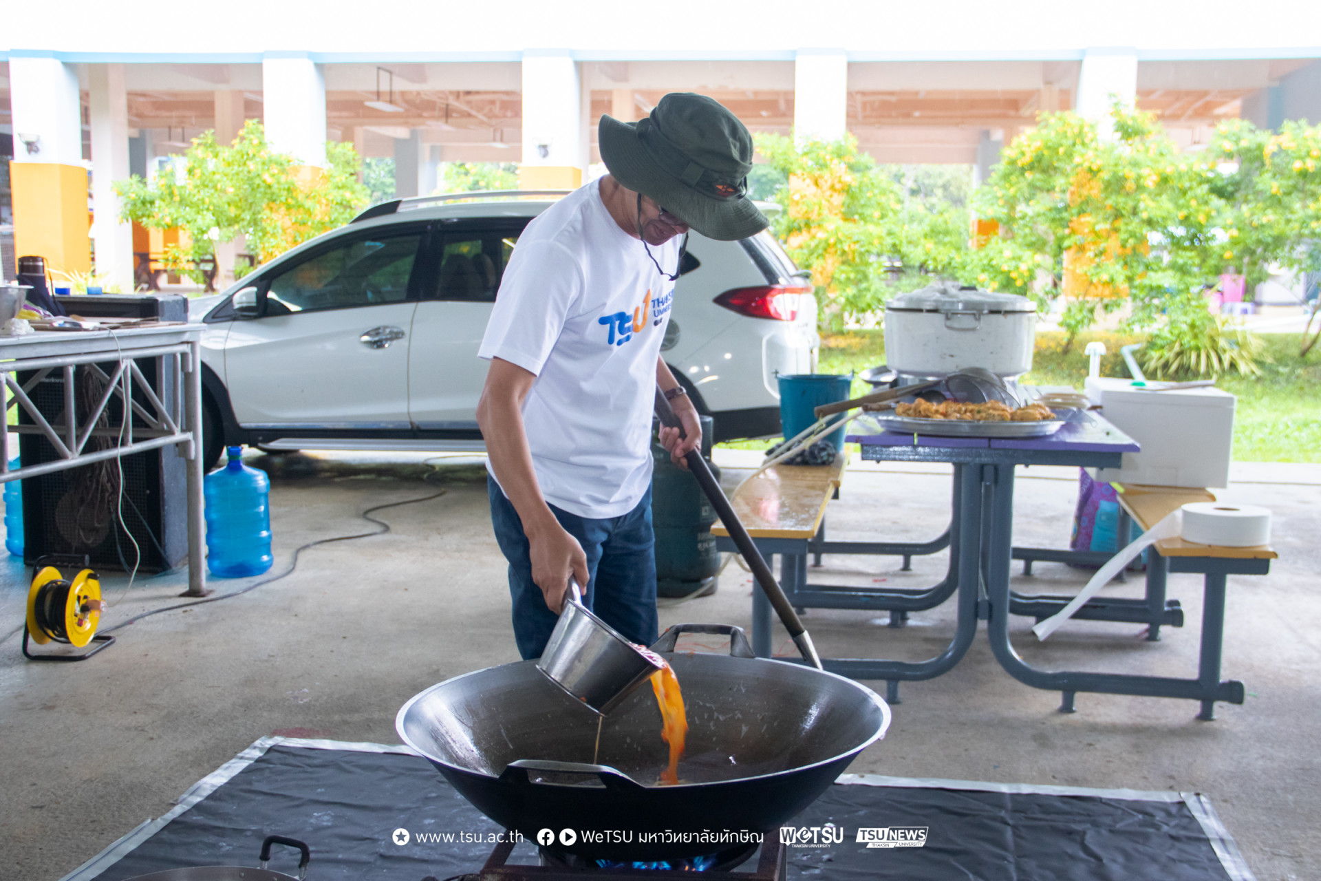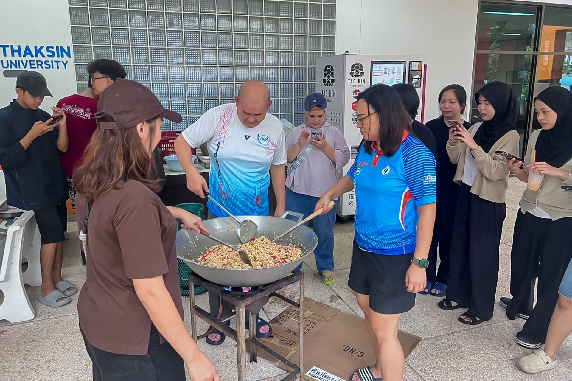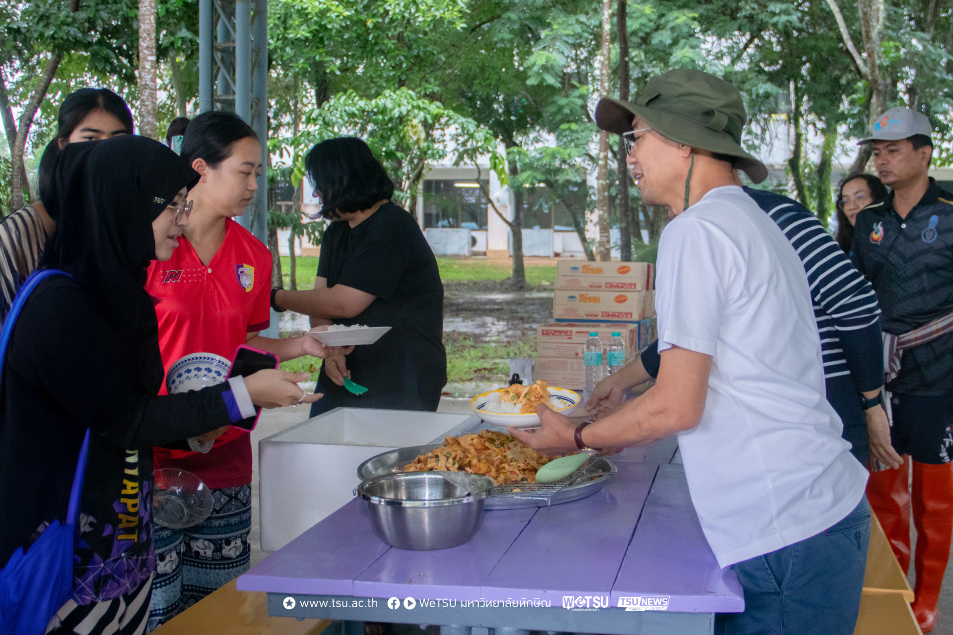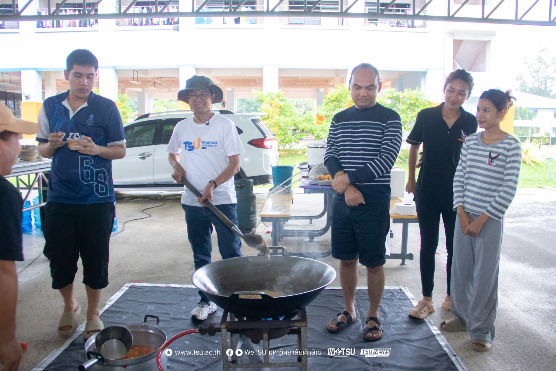 ทางด้านของวิทยาเขตพัทลุง สำหรับมื้อกลางวันยังพิเศษยิ่งขึ้น เมื่อรองศาสตราจารย์ ดร.ณฐพงศ์ จิตรนิรัตน์ อธิการบดีมหาวิทยาลัยทักษิณ ลงมือปรุงอาหารด้วยตนเองเคียงข้างรองศาสตราจารย์ ดร.สมัคร แก้วสุกแสง รองอธิการบดีฝ่ายวิจัยและนวัตกรรม พร้อมด้วยบุคลากรและนิสิตจิตอาสา ที่ร่วมแรงร่วมใจกันสร้างมื้ออุ่นใจให้กับน้อง ๆ นิสิตท่ามกลางสายฝนที่โปรยปรายตลอดทั้งวัน กับเมนูข้าวไข่เจียว มาม่าต้ม–ผัด ต่อด้วยเมนูมื้อเย็นอย่างหมี่ผัดซีอิ๊ว พร้อมไข่ไก่อารมณ์ดีต้มสุกกว่า 1,700 ฟอง จากฟาร์ม “ชัยบุรีโมเดล ไข่ไก่อารมณ์ดี–แฮปปี้ฟาร์ม” ภายใต้โครงการวิจัยและนวัตกรรมแก้ไขปัญหาความยากจนแบบเบ็ดเสร็จและแม่นยำ จังหวัดพัทลุง เพื่อให้ทุกคนอิ่มท้อง อุ่นใจ และไม่ต้องกังวลเรื่องค่าใช้จ่ายหรือการเดินทางออกไปซื้ออาหารในช่วงสภาพอากาศไม่เอื้ออำนวย