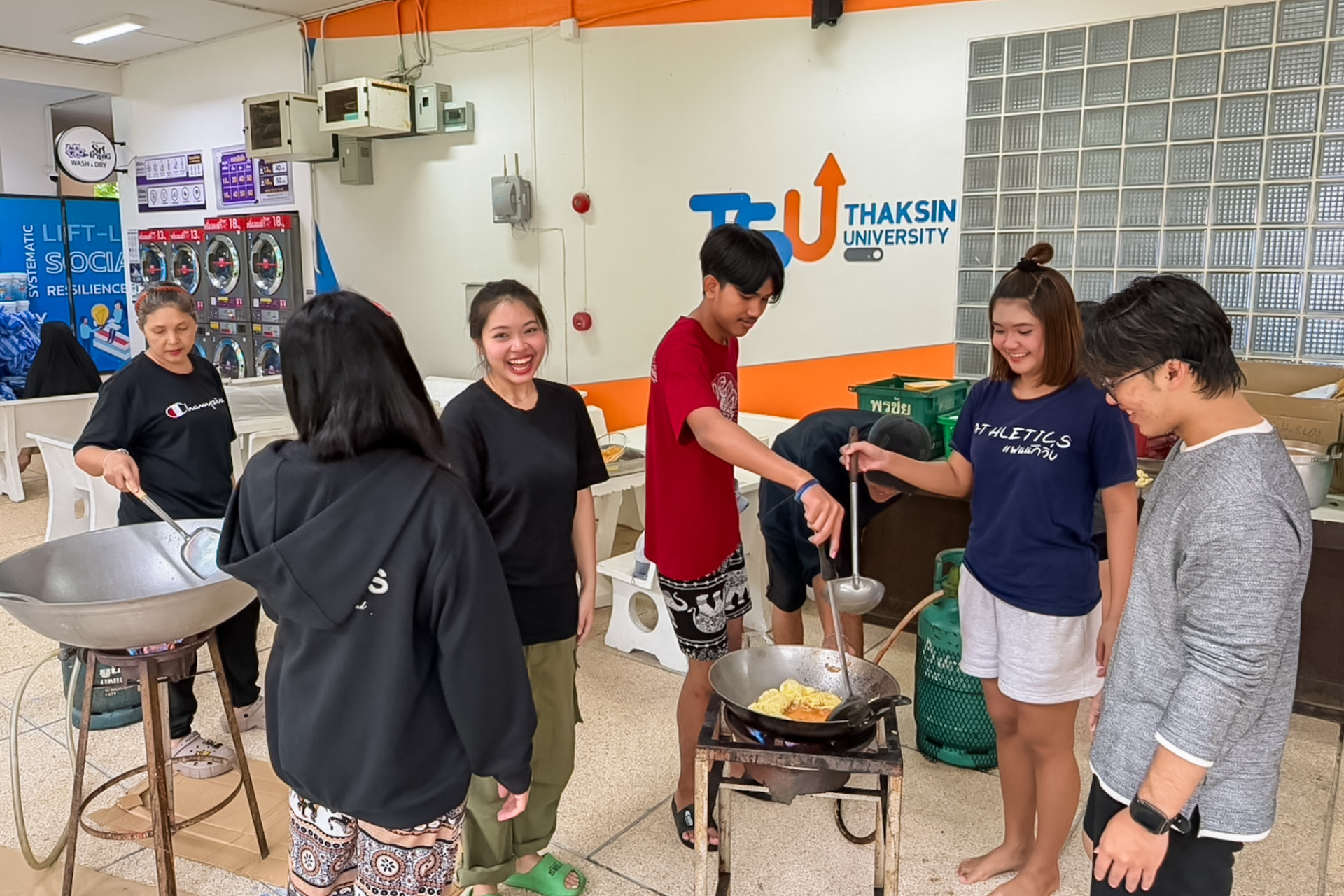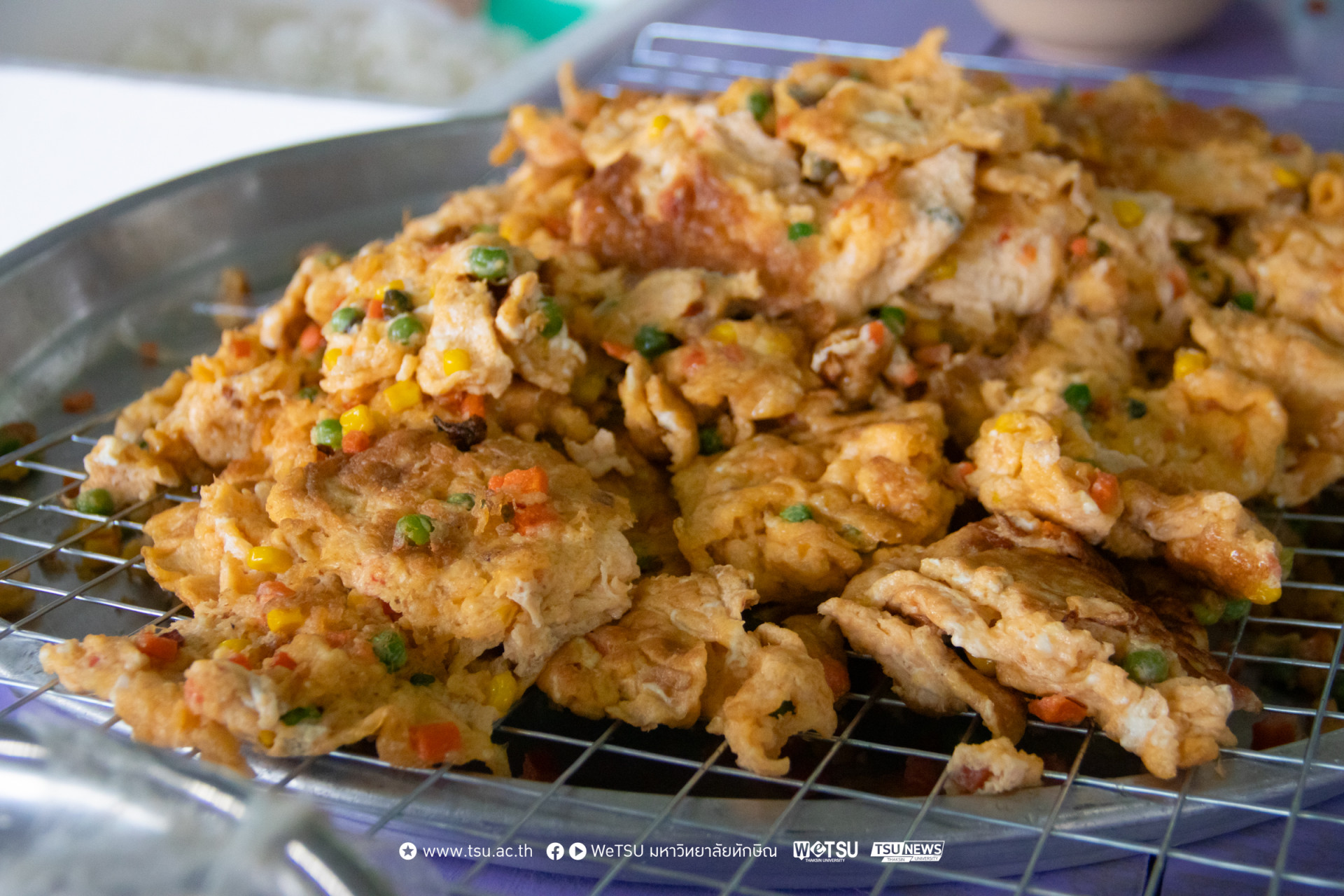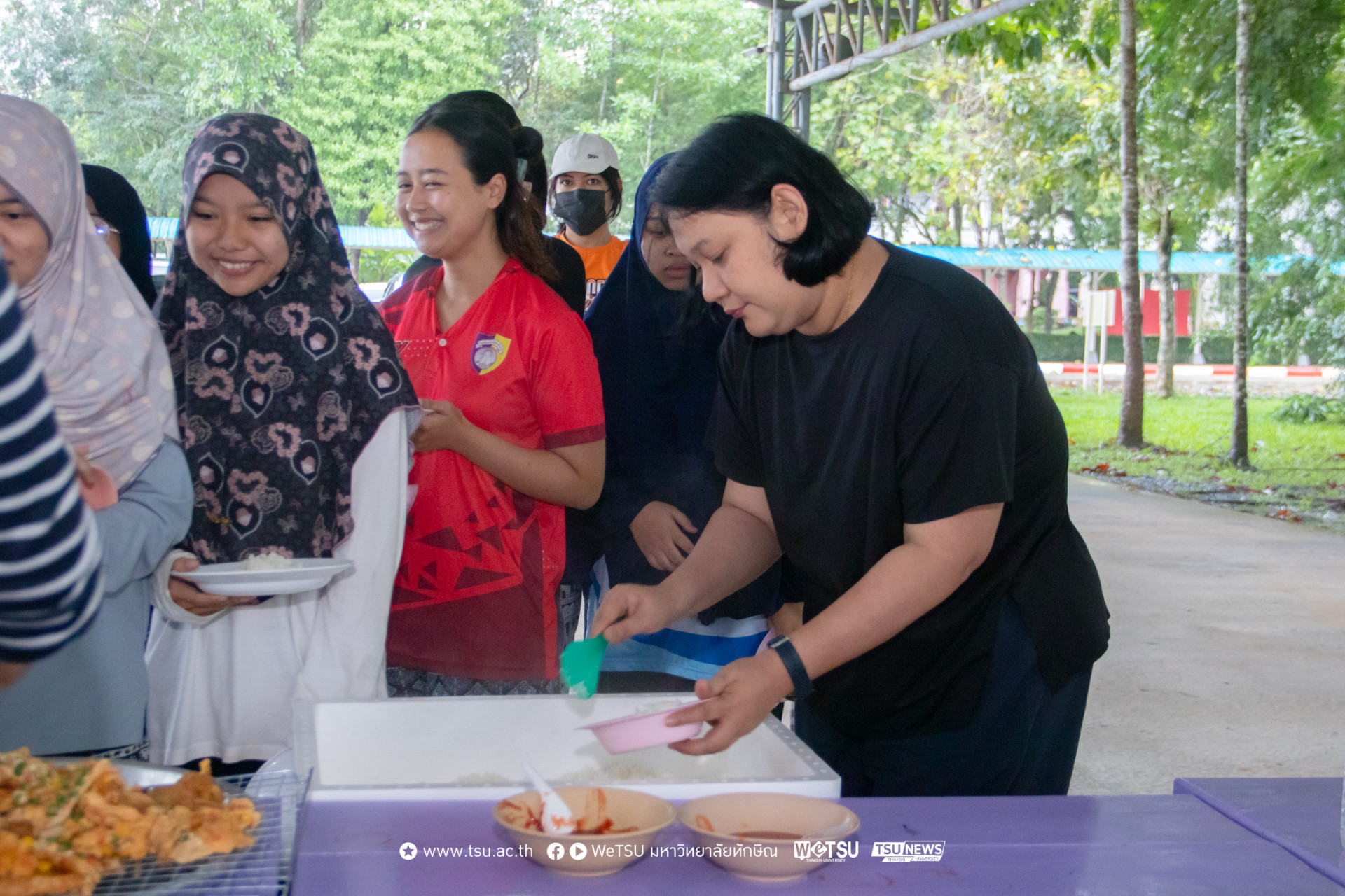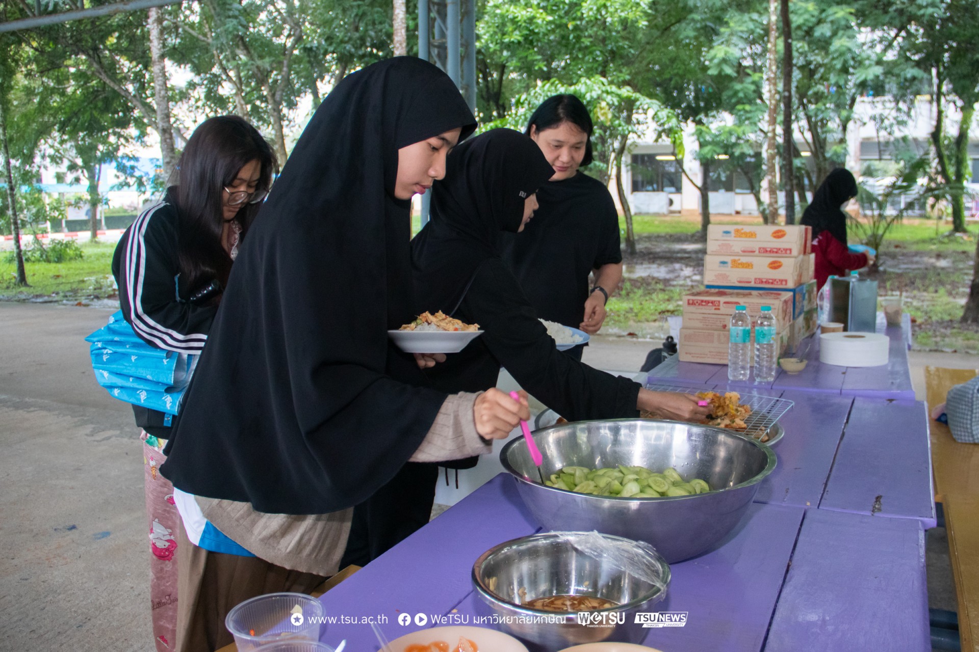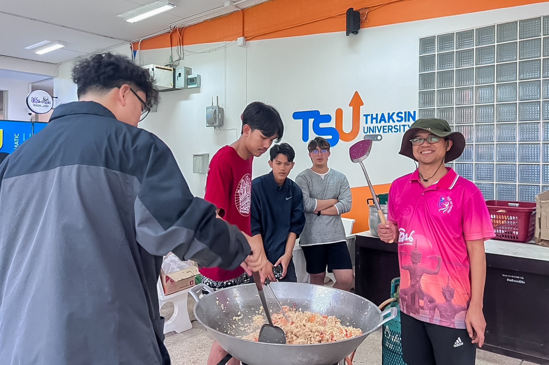 ทางด้านของวิทยาเขตพัทลุง สำหรับมื้อกลางวันยังพิเศษยิ่งขึ้น เมื่อรองศาสตราจารย์ ดร.ณฐพงศ์ จิตรนิรัตน์ อธิการบดีมหาวิทยาลัยทักษิณ ลงมือปรุงอาหารด้วยตนเองเคียงข้างรองศาสตราจารย์ ดร.สมัคร แก้วสุกแสง รองอธิการบดีฝ่ายวิจัยและนวัตกรรม พร้อมด้วยบุคลากรและนิสิตจิตอาสา ที่ร่วมแรงร่วมใจกันสร้างมื้ออุ่นใจให้กับน้อง ๆ นิสิตท่ามกลางสายฝนที่โปรยปรายตลอดทั้งวัน กับเมนูข้าวไข่เจียว มาม่าต้ม–ผัด ต่อด้วยเมนูมื้อเย็นอย่างหมี่ผัดซีอิ๊ว พร้อมไข่ไก่อารมณ์ดีต้มสุกกว่า 1,700 ฟอง จากฟาร์ม “ชัยบุรีโมเดล ไข่ไก่อารมณ์ดี–แฮปปี้ฟาร์ม” ภายใต้โครงการวิจัยและนวัตกรรมแก้ไขปัญหาความยากจนแบบเบ็ดเสร็จและแม่นยำ จังหวัดพัทลุง เพื่อให้ทุกคนอิ่มท้อง อุ่นใจ และไม่ต้องกังวลเรื่องค่าใช้จ่ายหรือการเดินทางออกไปซื้ออาหารในช่วงสภาพอากาศไม่เอื้ออำนวย