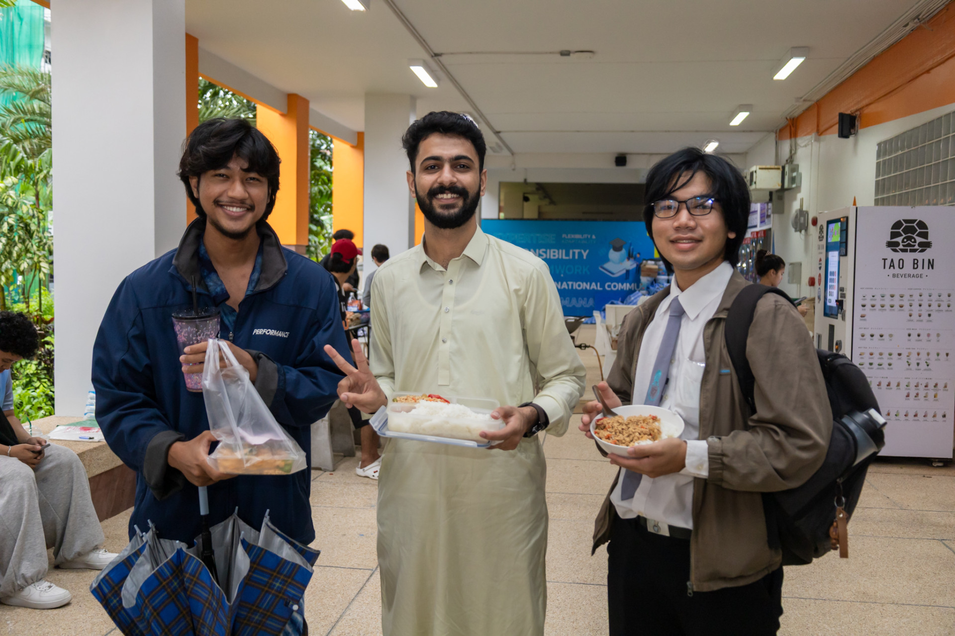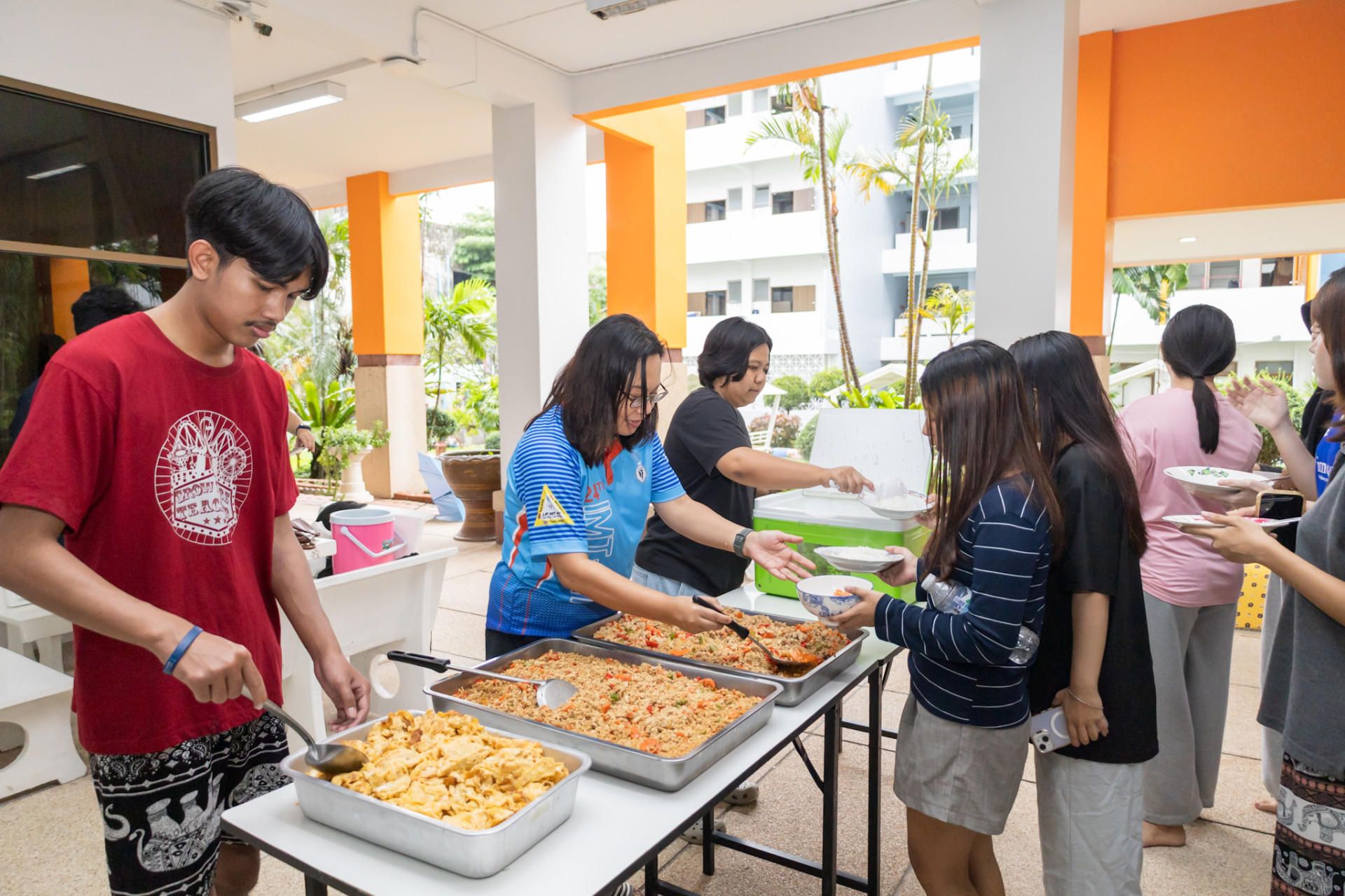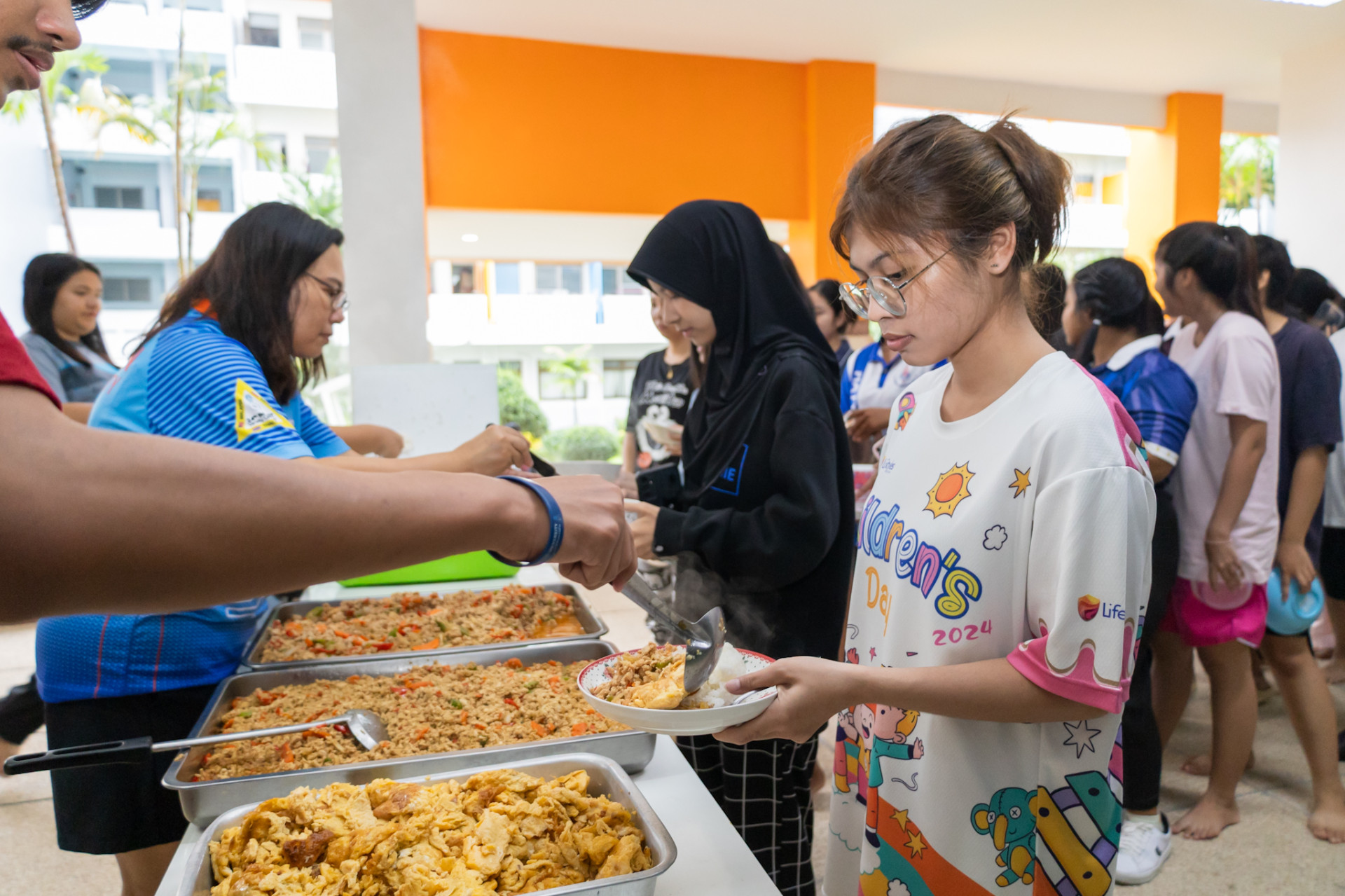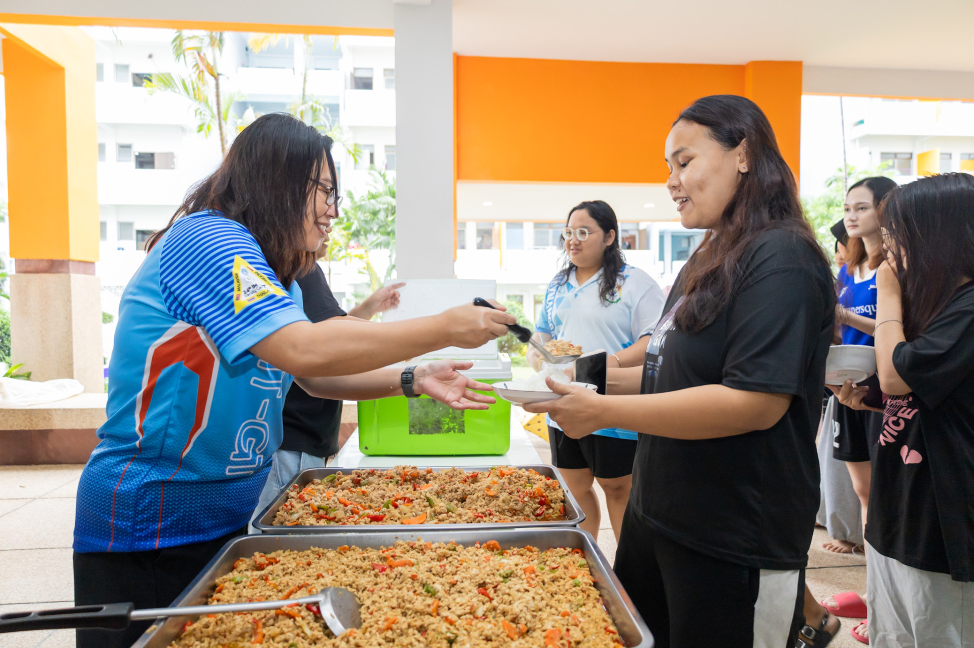 ทางด้านของวิทยาเขตพัทลุง สำหรับมื้อกลางวันยังพิเศษยิ่งขึ้น เมื่อรองศาสตราจารย์ ดร.ณฐพงศ์ จิตรนิรัตน์ อธิการบดีมหาวิทยาลัยทักษิณ ลงมือปรุงอาหารด้วยตนเองเคียงข้างรองศาสตราจารย์ ดร.สมัคร แก้วสุกแสง รองอธิการบดีฝ่ายวิจัยและนวัตกรรม พร้อมด้วยบุคลากรและนิสิตจิตอาสา ที่ร่วมแรงร่วมใจกันสร้างมื้ออุ่นใจให้กับน้อง ๆ นิสิตท่ามกลางสายฝนที่โปรยปรายตลอดทั้งวัน กับเมนูข้าวไข่เจียว มาม่าต้ม–ผัด ต่อด้วยเมนูมื้อเย็นอย่างหมี่ผัดซีอิ๊ว พร้อมไข่ไก่อารมณ์ดีต้มสุกกว่า 1,700 ฟอง จากฟาร์ม “ชัยบุรีโมเดล ไข่ไก่อารมณ์ดี–แฮปปี้ฟาร์ม” ภายใต้โครงการวิจัยและนวัตกรรมแก้ไขปัญหาความยากจนแบบเบ็ดเสร็จและแม่นยำ จังหวัดพัทลุง เพื่อให้ทุกคนอิ่มท้อง อุ่นใจ และไม่ต้องกังวลเรื่องค่าใช้จ่ายหรือการเดินทางออกไปซื้ออาหารในช่วงสภาพอากาศไม่เอื้ออำนวย