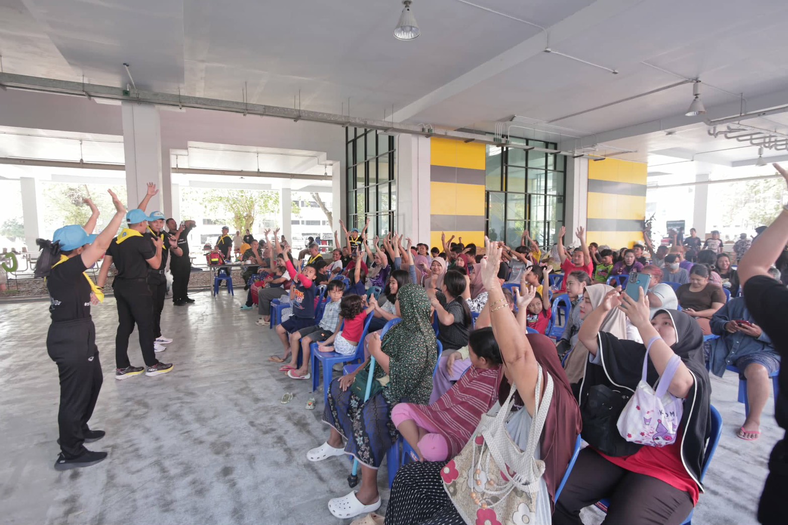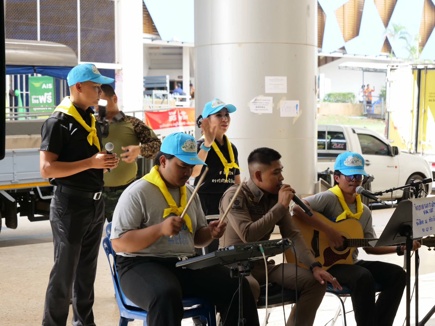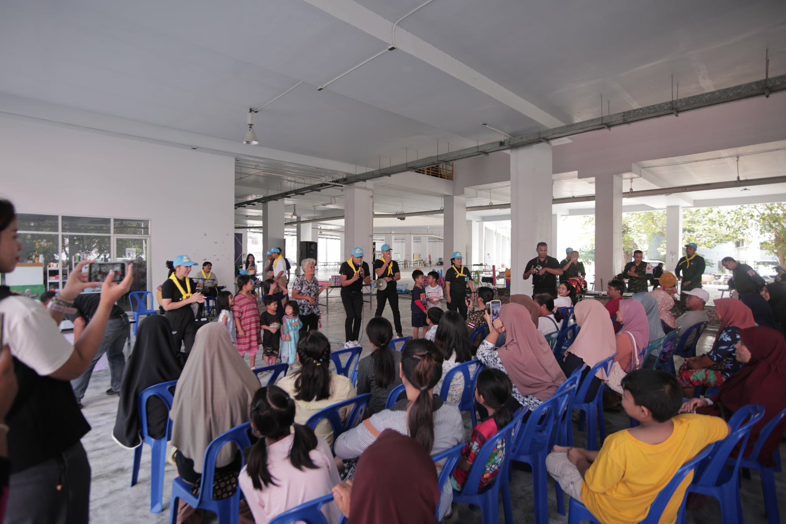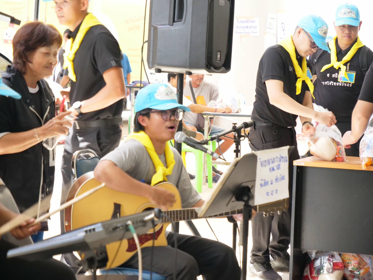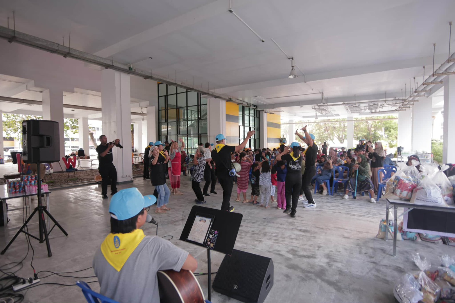 ในการนี้อาจารย์และนิสิตสาขาวิชาดุริยางคศาสตร์ เอกดนตรีสากล และเอกเทคโนโลยีธุรกิจดนตรี ได้ร่วมจัดการแสดงดนตรีโฟล์คซอง พร้อมนำอุปกรณ์ระบบเสียงลงพื้นที่ เพื่อสร้างบรรยากาศแห่งความผ่อนคลาย และเป็นกำลังใจให้แก่ผู้ประสบภัยที่พักอาศัยอยู่ภายในศูนย์พักพิงดังกล่าว โดยมีผู้ประสบภัยเข้าร่วมกิจกรรมเป็นจำนวนมาก ทั้งร่วมร้องเพลงกับวงดนตรี กิจกรรมสันทนาการ และการเต้นรำ รวมถึงสนทนาแลกเปลี่ยนเพื่อสร้างขวัญกำลังใจ ซึ่งผู้เข้าร่วมกิจกรรมต่างแสดงความพึงพอใจต่อบทเพลงจากอาจารย์และนิสิตมหาวิทยาลัยทักษิณ