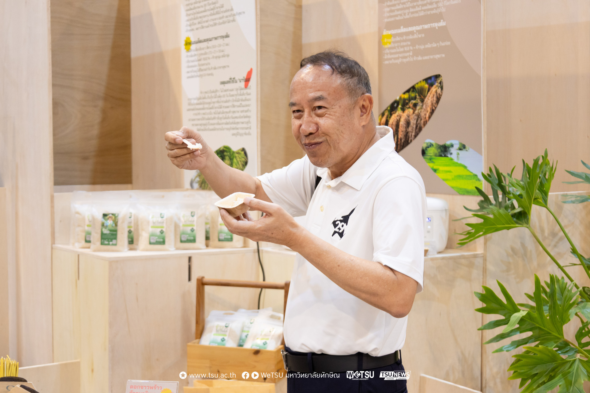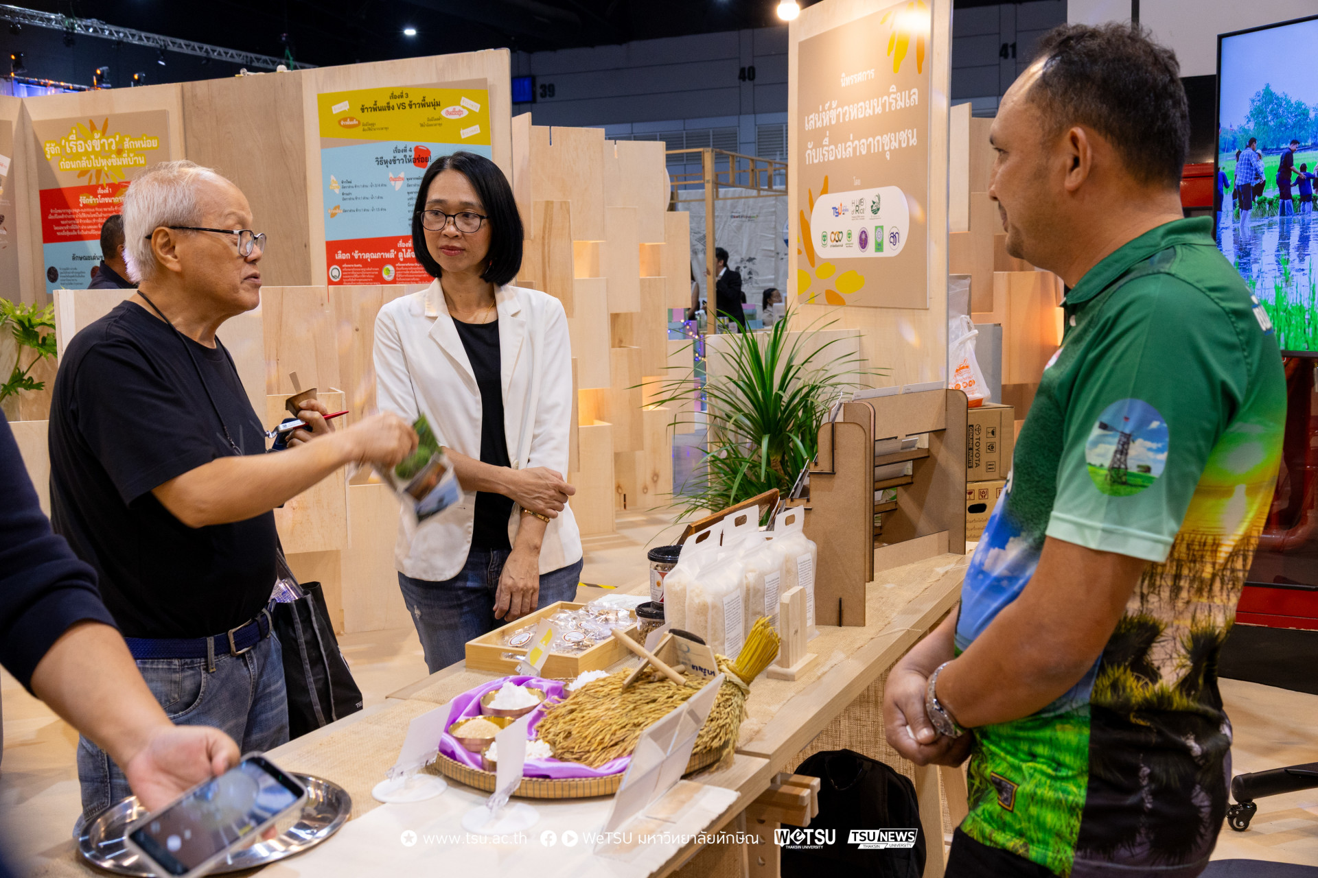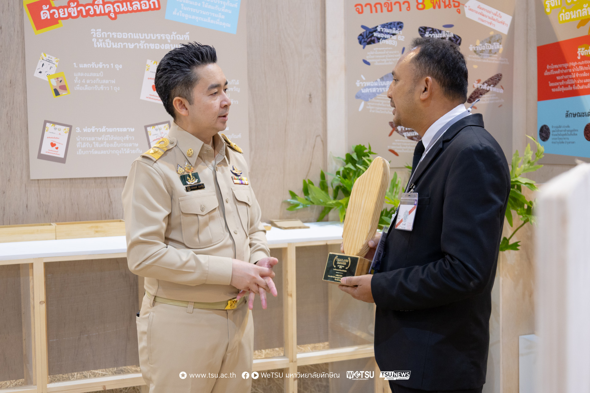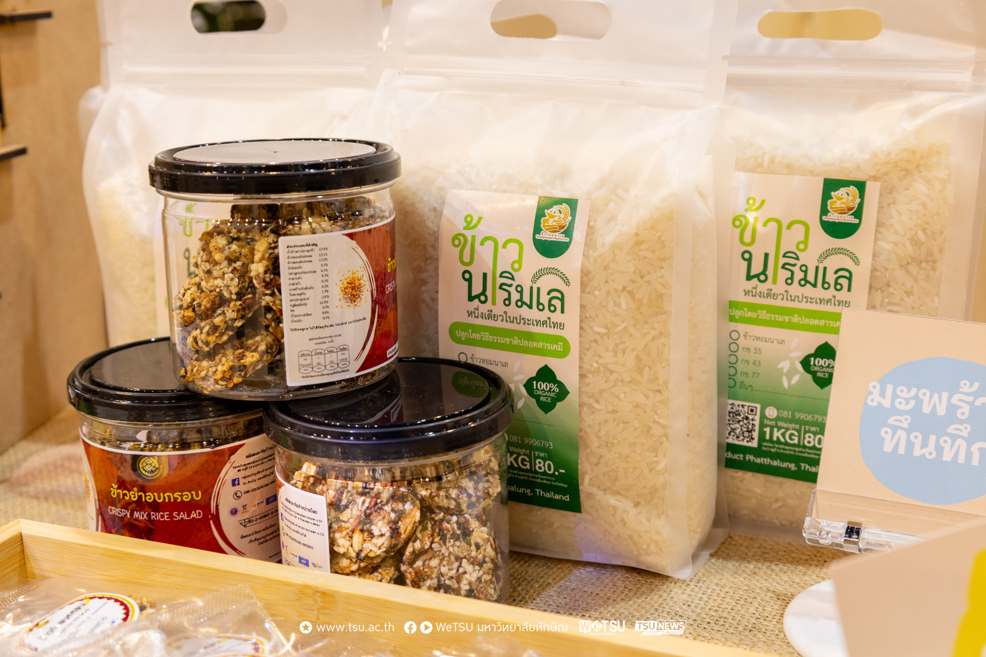 ในปีนี้ นับเป็นพระมหากรุณาธิคุณอย่างสูงยิ่งเมื่อสมเด็จพระกนิษฐาธิราชเจ้า กรมสมเด็จพระเทพรัตนราชสุดาฯ สยามบรมราชกุมารี เสด็จพระราชดำเนินทรงเปิดงานในวันที่ 5 ธันวาคม 2568 โดยมีนักวิจัยจากมหาวิทยาลัยทักษิณร่วมเฝ้ารับเสด็จ พร้อมนำเสนอนวัตกรรมด้านข้าวเพื่อสังคมไทยจากหลากหลายสาขา หนึ่งในพื้นที่จัดแสดงที่ได้รับความสนใจอย่างมากคือ นิทรรศการ “เสน่ห์ข้าวหอมนาริมเล กับเรื่องเล่าจากชุมชน” ภายใต้โครงการ “การบริหารจัดการข้าวนาริมเลพัทลุงภายใต้ภาวะน้ำท่วม–น้ำแล้ง เพื่อเพิ่มรายได้อย่างยั่งยืน” โดย ผศ.ดร.นันทิยา พนมจันทร์ คณะเทคโนโลยีและการพัฒนาชุมชน มหาวิทยาลัยทักษิณ ถ่ายทอดอัตลักษณ์ วิถี และภูมิปัญญาการปลูกข้าวในทะเลของชุมชนบ้านปากประ จังหวัดพัทลุง ที่สืบทอดกันมานานกว่า 200 ปี ผู้เข้าชมยังได้ร่วมกิจกรรมหลากหลาย ตั้งแต่การชิม–ช็อปข้าวจากนาริมเล 2 สายพันธุ์ ได้แก่ ข้าวหอมนาริมเลและข้าว กข43 Workshop การทำ “ตอกซาวพร้าว” ลิ้มลองข้าวยำอบกรอบจากข้าวนาริมเล ไปจนถึงได้รับของที่ระลึกอย่างโปสการ์ดภาพถ่ายวิถีนาริมเล อีกทั้งยังการันตีเพื่อตอกย้ำคุณภาพของงานวิจัยด้วยรางวัล “เกษตรกรแห่งปี 2568 (Thailand Farmer of The Year)” จาก The Cloud มอบแก่นวัตกรชุมชน คุณสายัณ รักดำ ประธานวิสาหกิจชุมชนทำนาริมเลบ้านปากประ พัทลุง นวัตกรที่ร่วมในโครงการวิจัยดังกล่าว