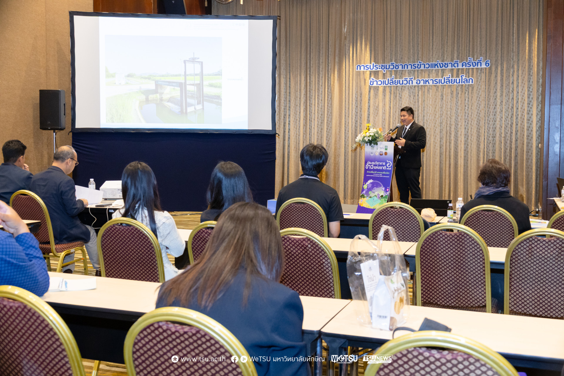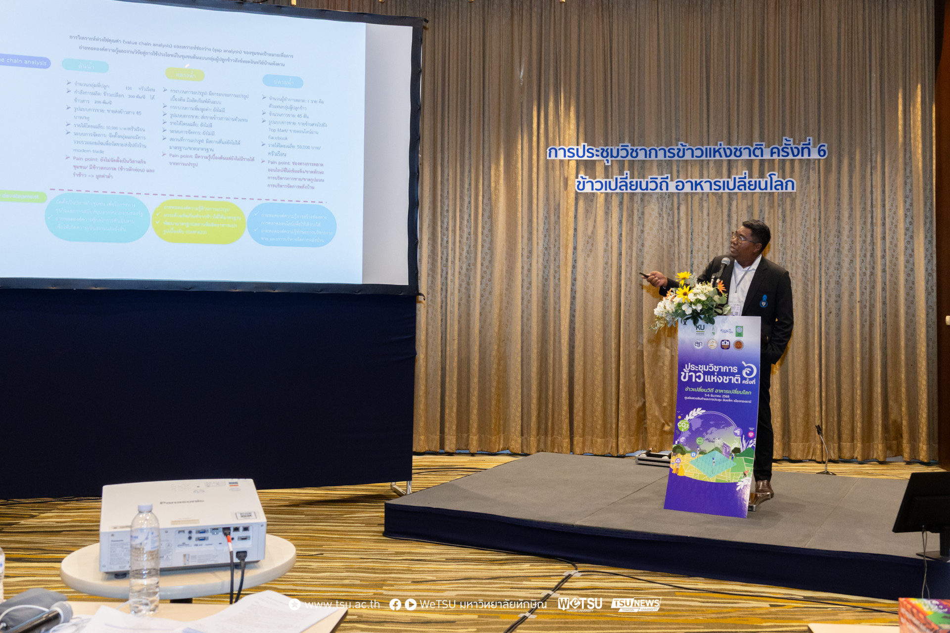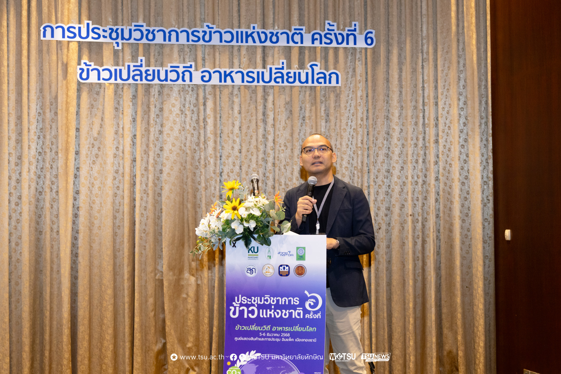 ภายในงานยังมีการจัดประชุมวิชาการข้าวแห่งชาติ ครั้งที่ 6 ประจำปี 2568 โดยมีมหาวิทยาลัยเกษตรศาสตร์เป็นเจ้าภาพ พร้อมมหาวิทยาลัยทักษิณหนึ่งในภาคีเครือข่ายศูนย์กลางความรู้ด้านวิทยาศาสตร์และการวิจัยข้าวของประเทศไทย (Hub of Rice) ร่วมกับหน่วยงานหลัก อาทิ มูลนิธิข้าวไทยฯ สวทช. วช. สวก. ธ.ก.ส. และสำนักงานคณะกรรมการการอาชีวศึกษา ภายใต้หัวข้อ “ข้าวเปลี่ยนวิถี อาหารเปลี่ยนโลก” การประชุมครั้งนี้ได้รับเกียรติจาก รศ.ดร. สมัคร แก้วสุกแสง รองอธิการบดีฝ่ายวิจัยและนวัตกรรม มหาวิทยาลัยทักษิณ ทำหน้าที่ประธานการประชุมกลุ่มย่อยในหัวข้อ งานวิจัยข้าวระดับท้องถิ่นและวิถีชีวิตชาวนา ร่วมกับ ผศ.ดร.สมพงศ์ จันทร์แก้ว มหาวิทยาลัยขอนแก่น และ ผศ. ดร. สุไลมาน เจ๊ะอาบู มหาวิทยาลัยนราธิวาสราชนครินทร์ เพื่อแลกเปลี่ยนองค์ความรู้และแนวคิดจากนักวิจัยหลายสถาบัน มุ่งยกระดับงานวิจัยด้านข้าวท้องถิ่นและพัฒนาคุณภาพชีวิตชาวนาไทยอย่างยั่งยืน