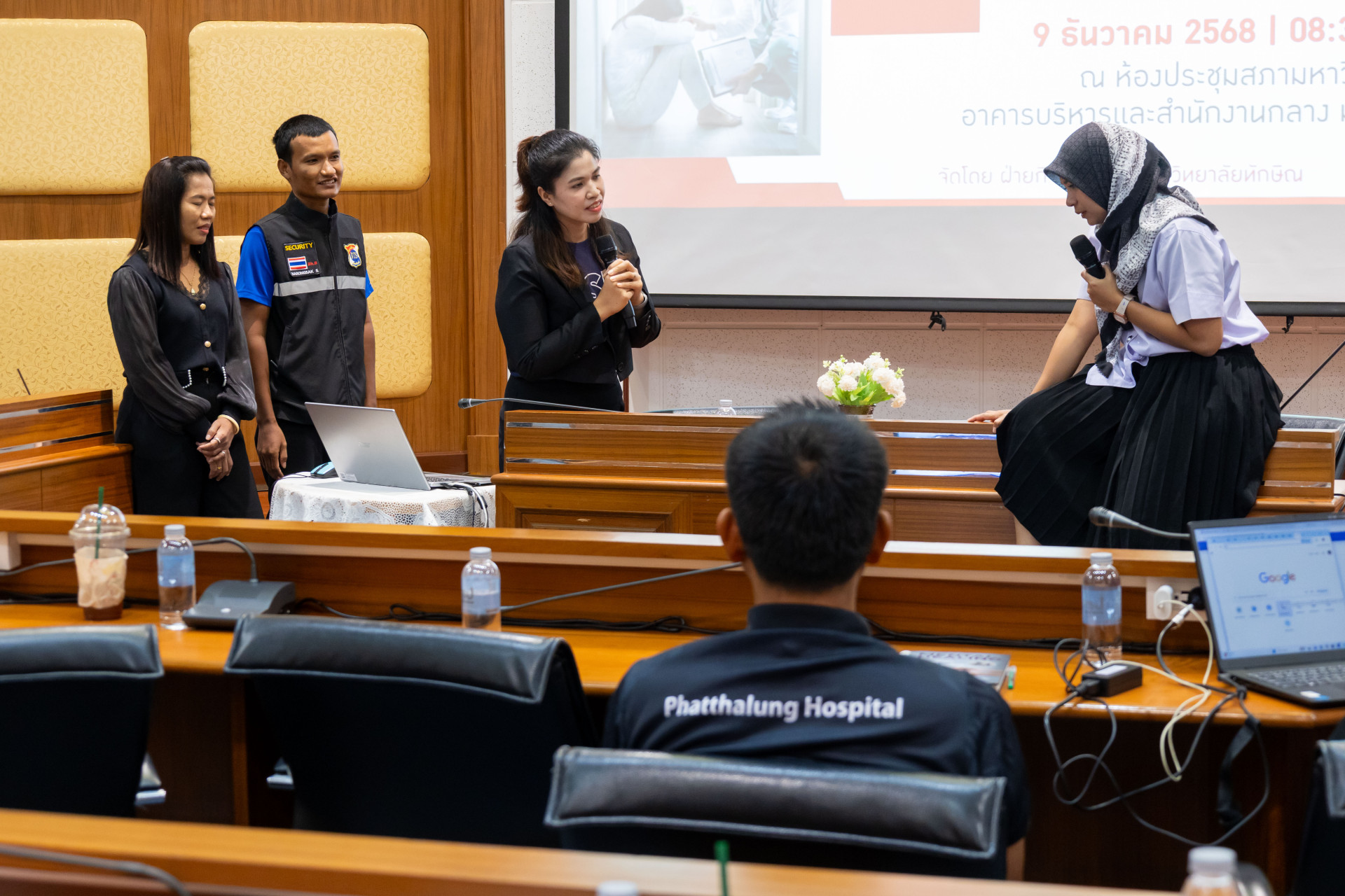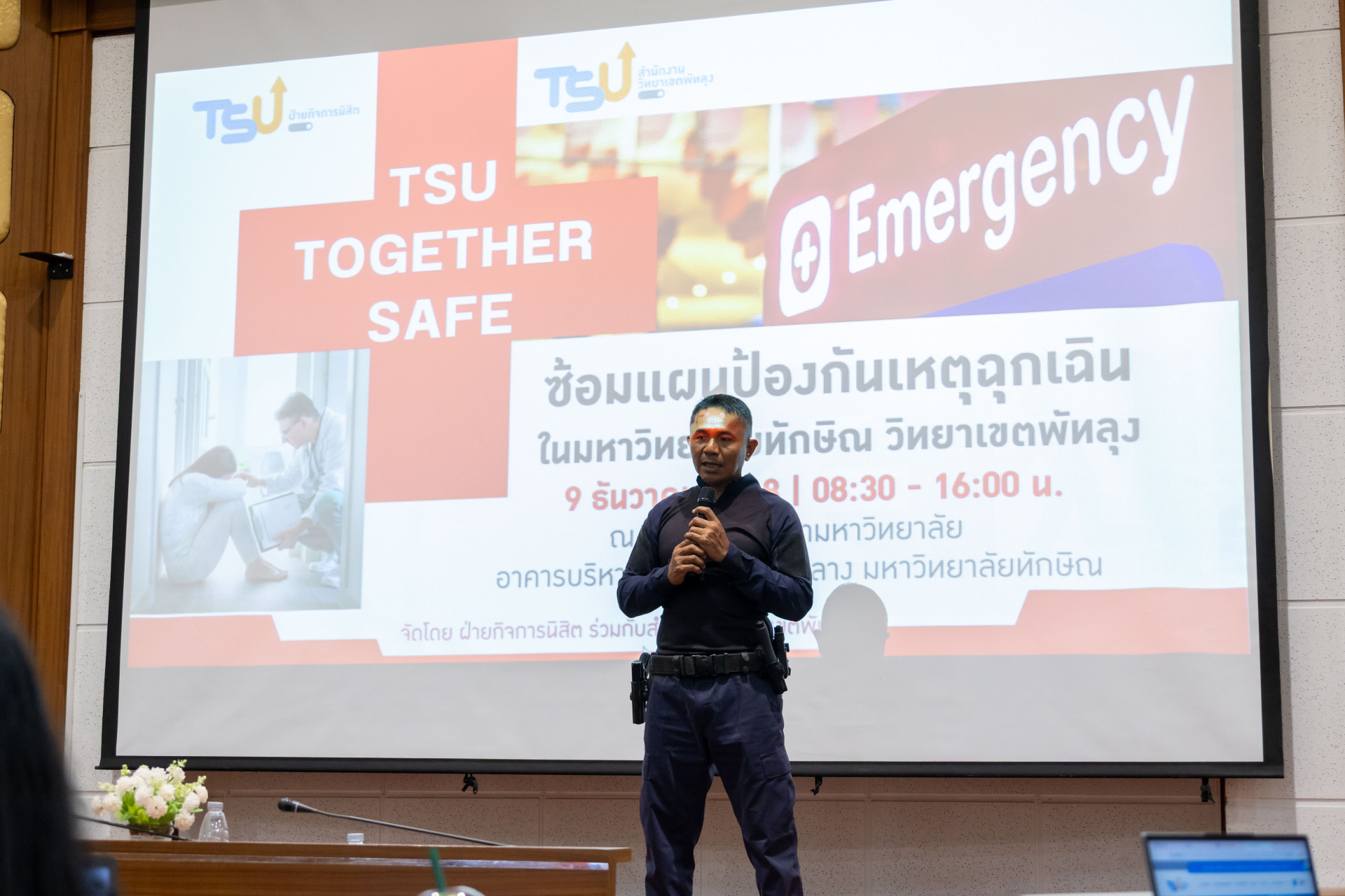 ฝ่ายกิจการนิสิต ร่วมกับสำนักงานวิทยาเขตพัทลุง จัดโครงการ TSU Together Safe : ซ้อมแผนป้องกันเหตุฉุกเฉิน เมื่อวันที่ 9 ธันวาคม 2568 ณ ห้องประชุมสภามหาวิทยาลัย อาคารบริหารและสำนักงานกลาง  มหาวิทยาลัยทักษิณ วิทยาเขตพัทลุง  เพื่อสร้างความรู้ ความเข้าใจและเตรียมพร้อมรับมือกับสถานการณ์ฉุกเฉินที่อาจเกิดขึ้นภายในมหาวิทยาลัย โดยได้รับเกียรติจาก ผู้ช่วยศาสตราจารย์ ดร.สิรยา สิทธิสาร รองอธิการบดีฝ่ายกิจการนิสิตและพันธกิจสัมพันธ์ เป็นประธานเปิดงาน