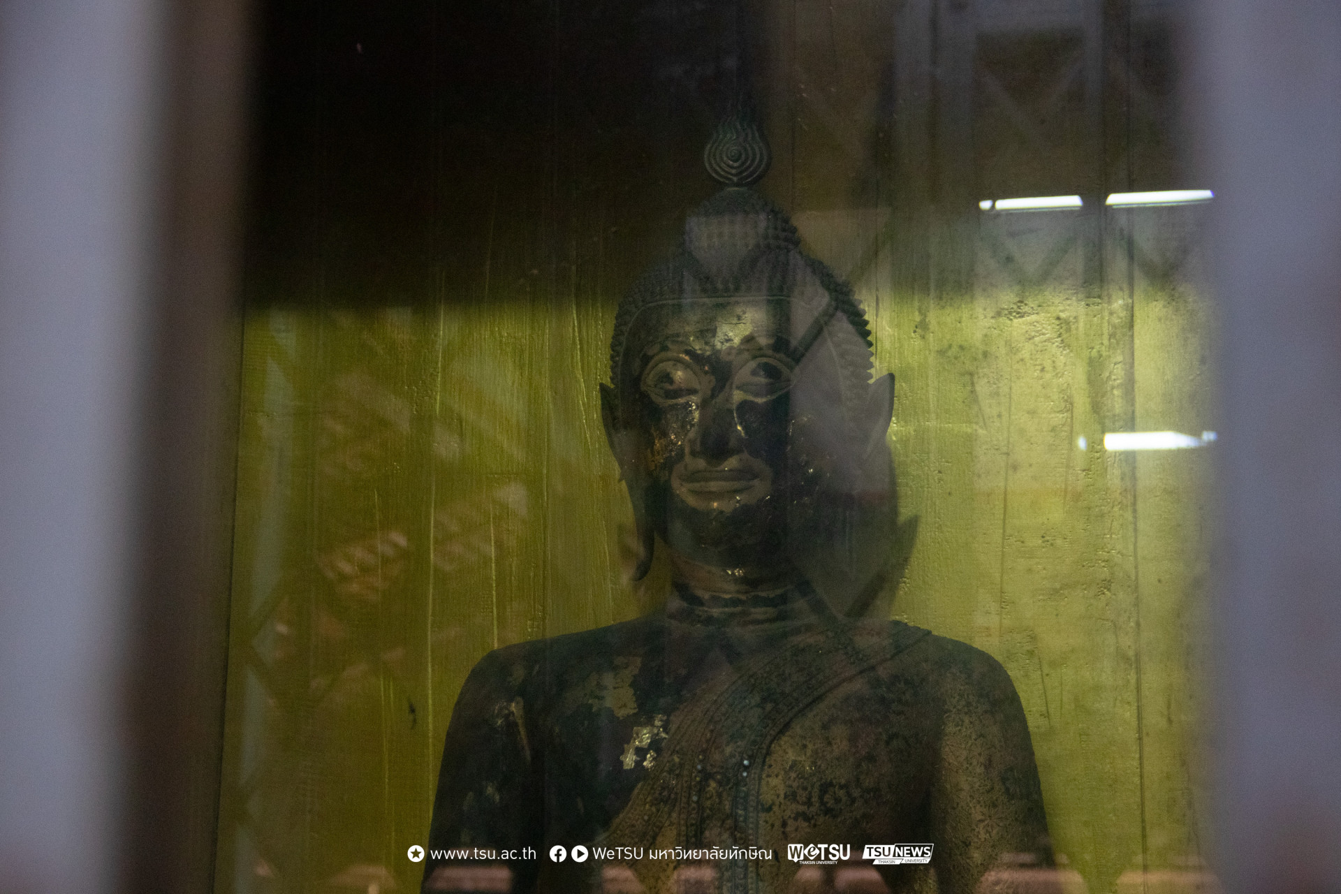 ภายในของอุโบสถ หลังคาและพื้นทำมาจากเครื่องดินเผาแบบโบราณ มีพระไตรปิฎกใบลานและพระประธานปางมารวิชัยประดิษฐานอยู่อย่างลงตัว แม้องค์ไม่ใหญ่โตแต่กลับมีเสน่ห์ชวนมองเหมือนต้องมนต์ ทำให้เสียงของพี่บุญเลิศผู้นำชมหายไปช่วงขณะหนึ่ง