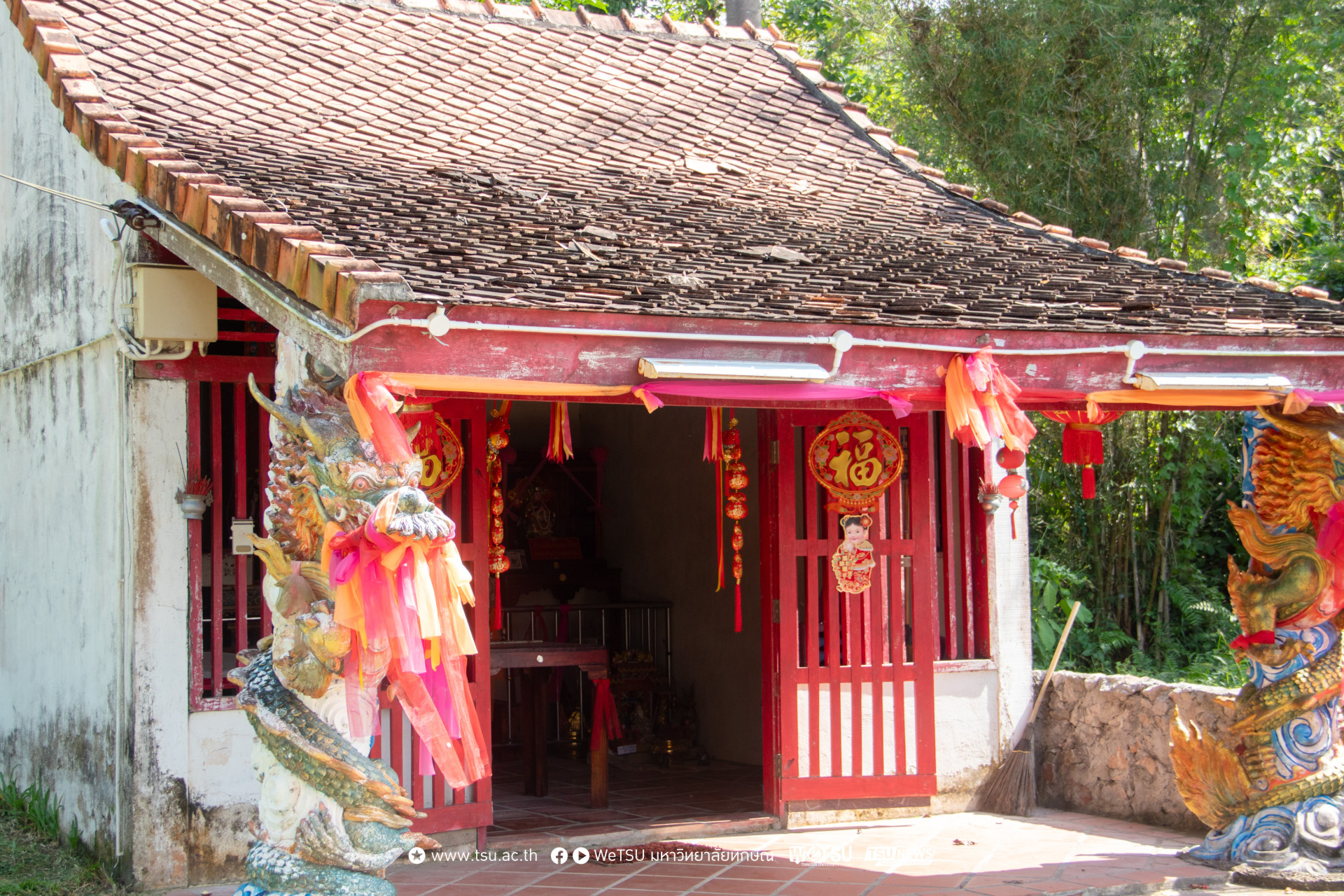 ขบวนรถรางเคลื่อนตัวออกจากวัดท้ายยอได้ไม่ไกลกันมากนักก็มาถึง “ศาลเจ้าไท้ก๋ง” เมื่อทุกคนลงจากรถ พี่เบญ นักวิชาการของสถาบันทักษิณคดีศึกษาผู้ดูแลนักท่องเที่ยวอีกคนก็เริ่มจัดแจงส่งช่อดอกไม้ให้พวกเราทุกคนได้สักการะสิ่งศักดิ์สิทธิ์แห่งนี้ตามความเชื่อแบบชาวจีน บ่งบอกให้เรารู้ในทันทีว่าเกาะแห่งนี้ไม่ใช่มีเพียงชาวไทยเท่านั้น หากแต่ยังมีชาวจีนโพ้นทะเลมาตั้งรกรากอยู่ที่นี้อีกด้วย ไกด์เล่าว่า “ชาวจีน เดินทางอพยพมาทางทะเลตั้งแต่สมัยรัชกาลที่ 3 พร้อมภูมิปัญญาเครื่องปั้นดินเผา เช่น กระเบื้องแบบที่เราเห็นได้ในอุโบสถของวัดท้ายยอ ซึ่งเป็นจุดเริ่มต้นของวิถีชีวิตไทย-จีนที่หลอมรวมกันในชุมชนแห่งนี้”