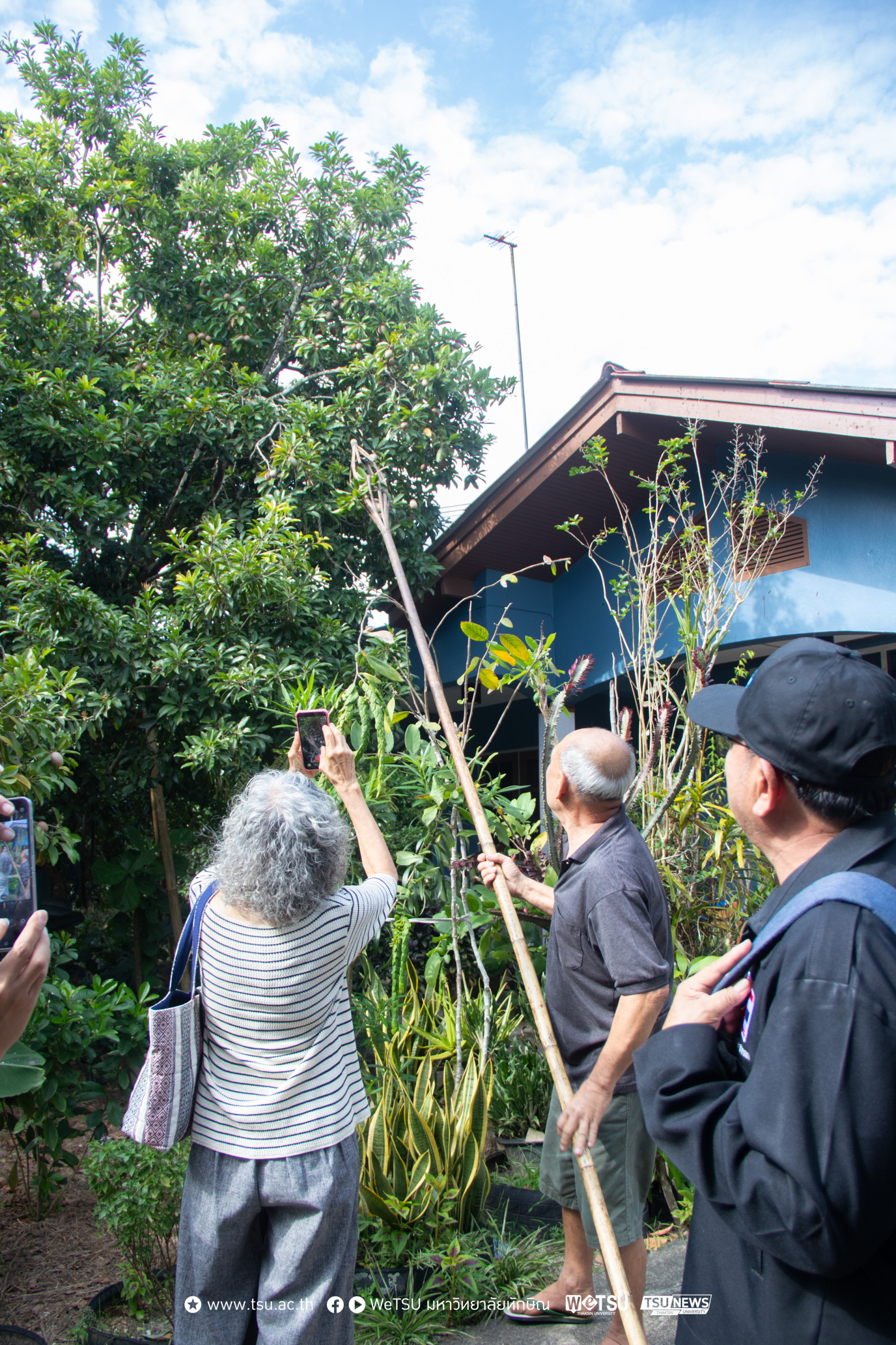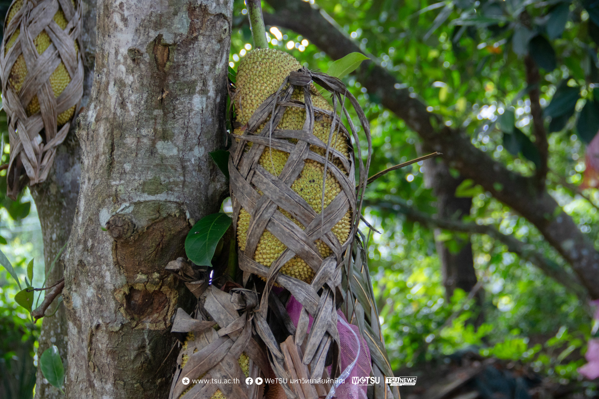 หลังจากเติมน้ำตาลกันมาแบบเต็มอิ่มแล้ว กระบวนการเผาผลาญก็ได้เริ่มทำงาน เราเดินขึ้นไปยังหมุดหมายที่สี่ตามทางเดินลาดชัน กลิ่นหอมที่คุ้นเคยโชยมาตามลม จำปาดะขนุนเจ้าของกลิ่นหอม(สำหรับเรา) คอยต้อนรับคณะทัวร์อยู่ปากทางเข้า “สวนสมรมลุงวี” มองไปรอบ ๆ ยังมีผักเหรียง พริก และอื่น ๆ ปลูกแซม ๆ กันไป