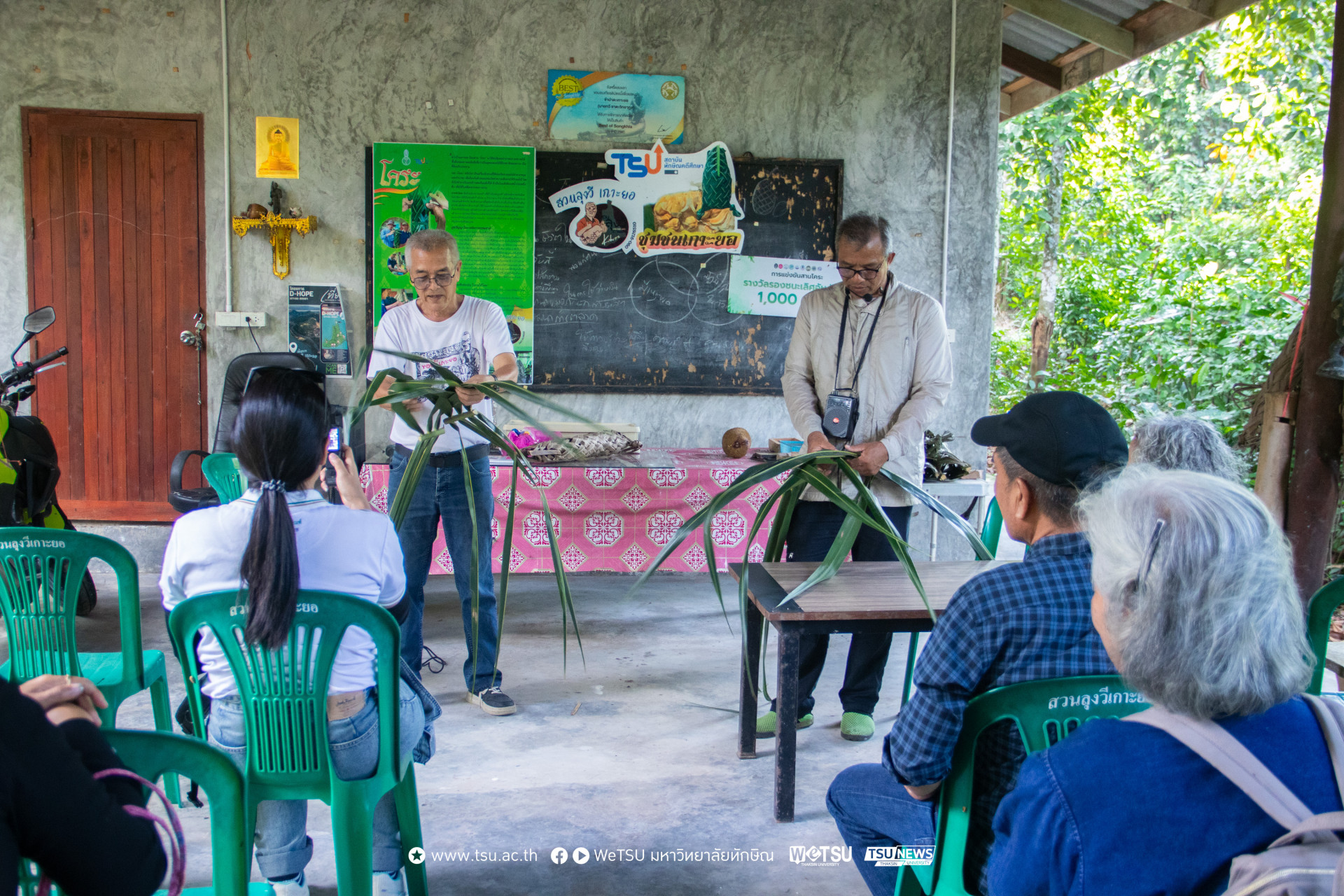 ในขณะที่อดีตนายทหารเรือปลดเกษียณกำลังสอนพวกเราสาน “โคร๊ะ” (ภูมิปัญญาท้องถิ่นสำหรับห่อผลไม้เพิ่อกันแมลง) จากทางมะพร้าว เขาก็เล่าให้เราฟังว่า “ระหว่างที่รอจำปาดะขนุนสุกซึ่งใช้ระยะเวลา 3 เดือน การปลูกผักสวนครัว จะช่วยสร้างรายได้รายวัน บางชนิดรายสัปดาห์” และยังบอกเคล็ด(ไม่)ลับอีกว่า “บางครั้งก็ปล่อยให้จำปาดะสุกคาต้น เพื่อให้แมลงได้รุมกินลูกที่สุกไปเลย เป็นการอยู่กันแบบพึ่งพากัน โดยไม่ใช้สารเคมีใด ๆ ” และแน่นอนมาสวนผลไม้ทั้งที เรื่องกินเป็นของคู่กัน ลุงวีเตรียมเค้กจำปาดะขนุนไว้ให้เราได้ปั้มโลโก้ของสวนลงไป พร้อมชิมเค้กเนื้อนุ่ม หอม อร่อย หน้าตาสวยด้วยฝีมือตัวเอง