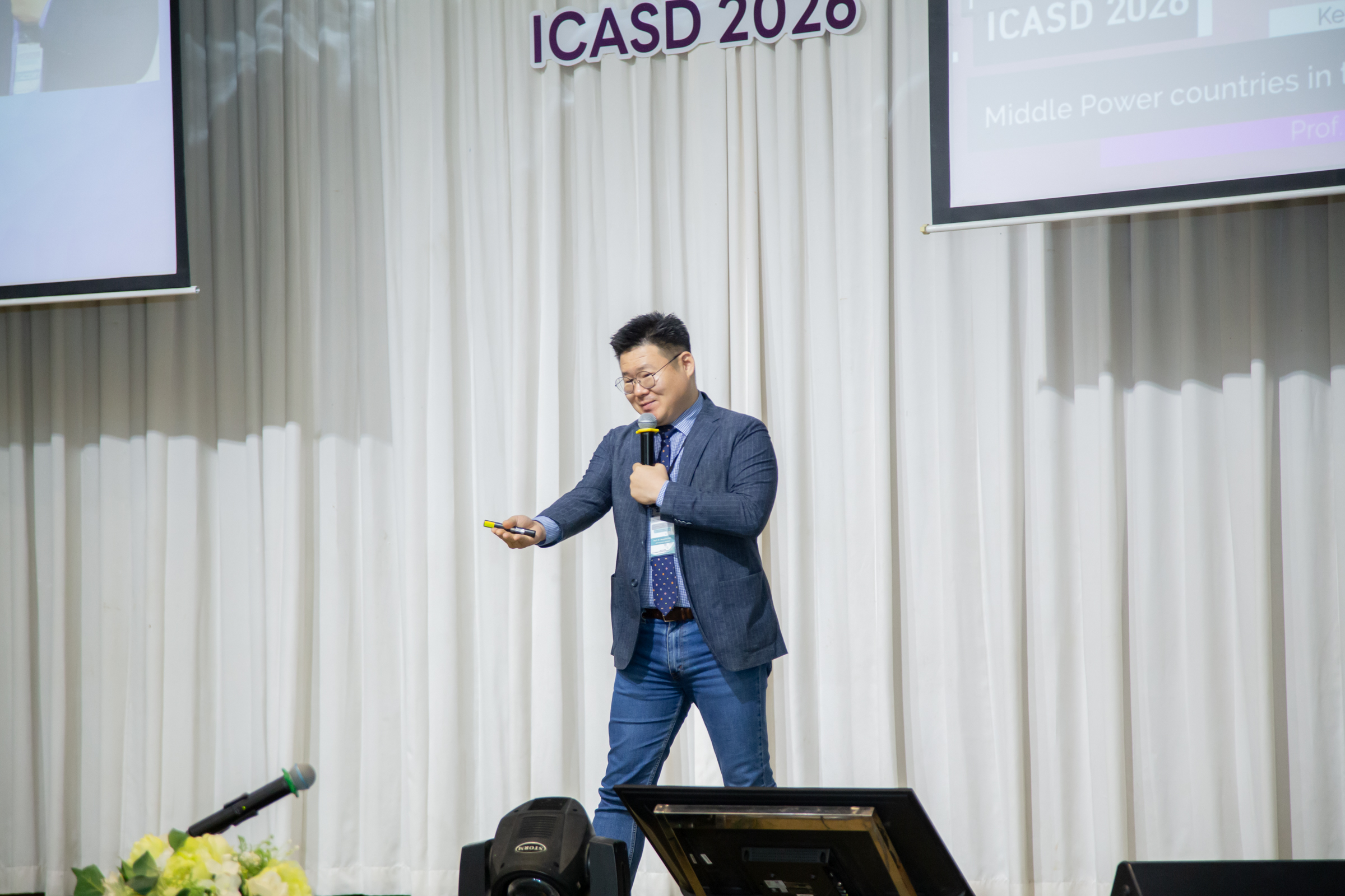 Prof. Dr.Bongchul Kim จากเกาหลีใต้ นำเสนอหัวข้อ “Middle Power Countries in the Digital Age: Korea and Thailand” วิเคราะห์บทบาทของประเทศขนาดกลางอย่างไทยและเกาหลีใต้ในเวทีโลกยุคดิจิทัล และแนวทางการสร้างอิทธิพลผ่านความร่วมมือและเทคโนโลยี