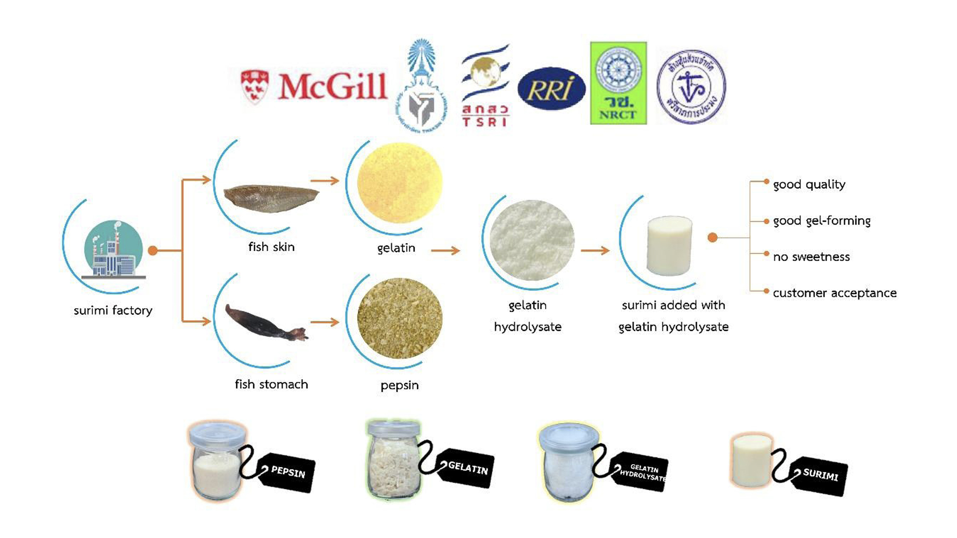 งานวิจัยนี้ไม่เพียงแต่เพิ่มมูลค่าให้กับเศษเหลือทิ้งจากกระบวนการแปรรูปสัตว์น้ำแต่ยังช่วยลดขยะและผลกระทบต่อสิ่งแวดล้อม อีกทั้งยังสามารถนำเทคโนโลยีนี้ไปใช้ในอุตสาหกรรมอื่น เช่น การทดแทนสารประกอบฟอสเฟตในอุตสาหกรรมกุ้งแช่เยือกแข็ง ซึ่งเป็นแนวทางที่เป็นมิตรต่อสิ่งแวดล้อมและสร้างรายได้ให้กับผู้ประกอบการ ด้วยประสิทธิภาพสูงและความปลอดภัยของเจลาตินไฮโดรไลเสตจากหนังปลาที่สามารถใช้ในระดับความเข้มข้นต่ำกว่าของสารป้องกันการสูญเสียสภาพธรรมชาติทางการค้า และไม่มีรสหวานหรือสีคล้ำในระหว่างการเก็บรักษา งานวิจัยนี้จึงเป็นก้าวสำคัญที่ช่วยพัฒนานวัตกรรมในอุตสาหกรรมอาหารและผลิตภัณฑ์จากสัตว์น้ำ ให้มีความยั่งยืน ปลอดภัย และตอบโจทย์ความต้องการของตลาดอย่างแท้จริง